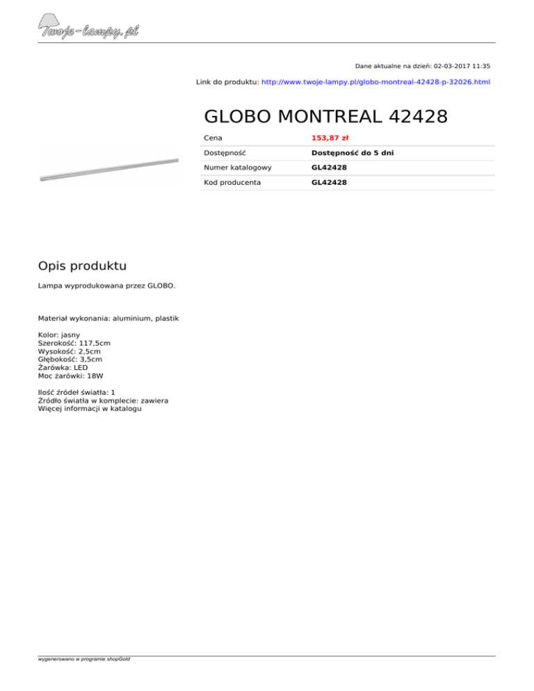 Dane aktualne na dzień: 02-03-2017 11:35 Link do produktu: http://www.twoje-lampy.pl/globo-montreal-42428-p-32026.html GLOBO MONTREAL 42428 Opis produktu Lampa wyprodukowana przez GLOBO. Materiał wykonania: aluminium, plastik Kolor: jasny Szerokość: 117,5cm Wysokość: 2,5cm Głębokość: 3,5cm Żarówka: LED Moc żarówki: 18W Ilość źródeł światła: 1 Źródło światła w komplecie: zawiera Więcej informacji w katalogu wygenerowano w programie shopGold Powered by TCPDF (www.tcpdf.org) Cena 153,87 zł Dostępność Dostępność do 5 dni Numer katalogowy GL42428 Kod producenta GL42428