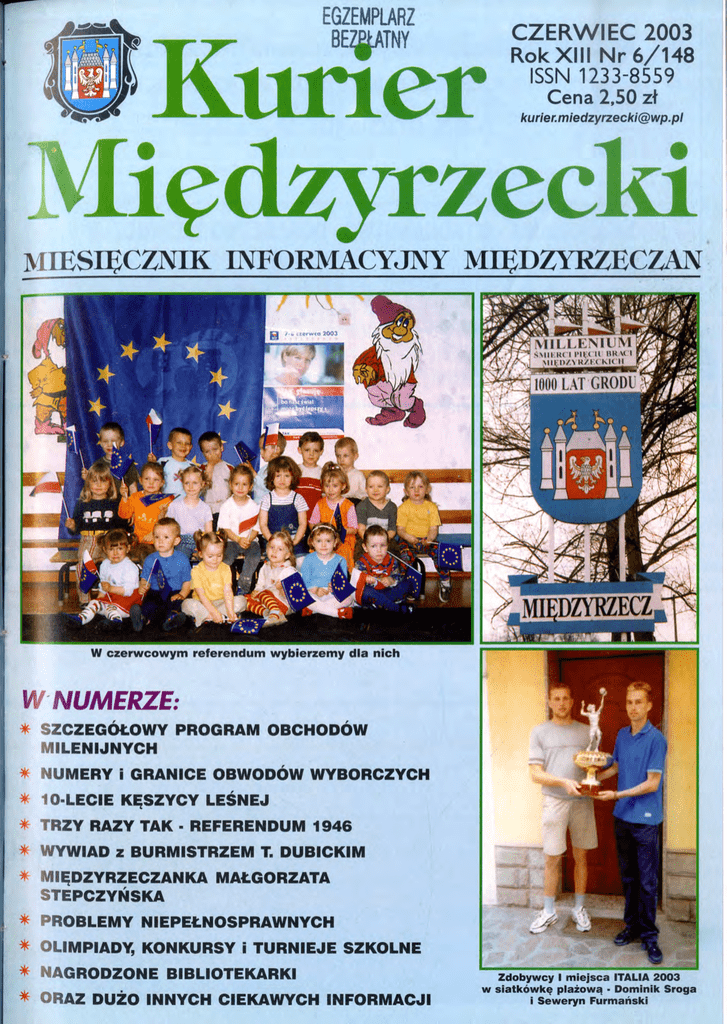 EGZEMPLARZ BElfATNY e CZERWIEC 2003 er Rok XIII Nr 6/148 ISSN 1233-8559 Cena 2,50 zł [email protected] ę ffiSIĘCZNIK INFORMACYJNY MIĘDZllaECZAN W czerwcowym referendum wybierzemy dla nich 'NUMERZE: * SZCZEGÓŁOWY PROGRAM OBCHODÓW MI LENIJNYCH * NUM ERY i GRANICE OBWODÓW WYBORCZYCH * 10·LECIE KĘSZYCY LEŚNEJ * TRZY RAZY TAK • REFERENDUM 1946 * lAD z BURMISTRZEM T. DUBICKIM * MI Ę DZYRZECZANKA MAŁGORZATA STE PCZYŃSKA * PROBLEMY * OLIMPIADY, KONKURSY i TURNIEJE SZKOLNE * NAGRODZONE BIBLIOTEKARKI * ORAZ DUŻO INNYCH CIEKAWYCH INFORMACJI NIEPEŁNOSPRAWNYCH w Zdobywcy l miejsca ITALIA 2003 Sroga siatkówkę plażową • Dominik i Seweryn Furmański PRZEDSIĘBIORSTWO TECHNIKI INSTALACYJNEJ r POL 66-300 Ul . Międzyrzecz ul. Młyńska 20 (tel./fax 095/741 -24-50, te l. 095/742-05- 72) PROJEKTOWANIE • WYKONAWSTWO • DORADZTWO TECHNICZNE * lnstacje grzewcze, sanitarne i gazowe * Ekologiczne i energooszczędne źródła ciepła * Instalacje i urządzenia wentylacyjne * Sprzedaż materiałów instalacyjnych * Serwis techniczny kotłowni olejowych i gazowych Nr 6 (148) KURIER MIĘDlYRZECKI 1. Zimniewicz Bartosz s. Tomasza i Marioli 2. Skrzypczak Monika c. Stanisława i Grażyny 3. Matysik Wiktor s. Dariusza i Agnieszki --··· 4. Matwiejczyk Oskar Kacper s. Daniela i Magd 1e6_( 5. Kopyściańska Mile na Martyna c. 1acka i Re "t" 6. Samulak Dawid Ryszard s. Rafała i Anny 7. Cieślak joanna Józefa c. Romana i Anity 8. Reszka Seweryn Dawid s. Wojciecha i Anny 9. Pawłowska Katarzyna Anna c. Andrzeja i Czesławy 10. Kałuski Stanisław Jakub s. Grzegorza i Anny 11. Zaremba Magdalena c. Mariusza i Doroty 12. Matuszewska Daria c. Dariusza i Elżbiety 13. Radziszewski Patryk s. Andrzeja i Anny 14. Pietrusik Michał s. Marcina i Iwony Str. 3 Co adzlie, klie W czerwcu kino "ŚwitJJ......n~.-~ 29.05. - 01.06. 2003 r. godz. 1700 i 19°0 "FRIDA" USA od 15 lat 05 - 08.06. 2003 r. godz. 17°0 i 19°0 ,JOHNNY ENGLISH" USA,Wlk.Bryt. od 12lat 12 - 15.06. 2003 r. godz. 1630 i 1920 "GANGI NOWEGO JORKU" USA od 15 lat 20 - 29.06. 2003 r. godz. 1700 i 1920 "MATRIX- REAKIYWACJA" USA od 12lat W czerwcu Dom KulturY zaprasza 1. Jankowski. Jacek r. 1915 zam. Mcz 2. TrybsAnna r. 1916 zam. M-cz 3. Walczak Władysław r. 1926 zam. M-cz 4. Zajdel] ulianna r. 1912 zam. Gumniska 5. Woniakowski Józef r. 1932 zam. M-cz 6. Żyrmont Hieronim r. 1931 zam. M-cz 7. Witczak Zofia r. 1930 zam. M-cz 8. Ratajczak Hieronim r. 1928 zam. M-cz 9. Kopczyński Ryszard r. 1955 zam. M-cz 10. Klemenczak Stefania r. 1957 zam. M-cz 11. Adamczak Maria r. 1931 zam. M-cz 12. Sikorski Feliks r. 1935 zam. M-cz UWAGA CZITELNICY! Uprzejmie zawiadamiamy, że w miesiącu czerwcu 2003r. biuro redakcji będzie czynne od poniedziałku do środy w godzinach od 900 - 1200 i w czwartek od godziny 1400 - 1700 • Redakcja ma bezpośrednie połączenie tel./fax. nr 741-88-29. Materiały do druku i ogłoszenia prosimy dostarczać do dnia 20 każdego miesią ca. Jeśli istnieją możliwości techniczne, to prosimy na dyskietkach (po wykorzystaniu zapewniamy zwrot). Zebrania redakcji KM odbędą się 5 i 18 czerwca o godz. l 7 00 w siedzibie redakcji. l MUZYCZNE SPOTKANIA Z FOLKLOREM 29.06.2003 Pieski będą gościć 15 zespołów ludowych i grup śpie waczych z województwa łubuskiego i dolnośląskiego. Celem Spotkań jest ocalenie od zapomnienia pieśni i piosenek ludowych, patriotycznych oraz popularnych, a także prezentacja utworów powstałych w zespołach współcześnie. Głównymi organizatorami imprezy są: Urząd Miasta i Gminy w Międzyrzeczu oraz Międzyrzecki Ośrodek Kultury. Program: 11°0 - Msza odpustowa w kościele św. Piotra i Pawła w Pieskach. 1220 - Korowód i przejście na miejsce imprezy 13oo - Otwarcie Spotkań 13 15 - I część prezentacji konkursowych 15°0 - Występ Zespołu Pieśni i Tańca ,Jaczowiacy" 16°0 - II część konkursowa 00 19 - Występ zespołu "Stint" z Gorzowa 45 19 - Podsumowanie prezentacji konkursowych, wręczenie nagród 15 20 - Zabawa taneczna Organizatorzy Zapraszamy Ol. 06. 2003 r. godz. l 700 kino "Świt" Seans bajkowy z niespodzianką z okazji DNIA DZIECKA 06. 06. 2003 r. godz. 21 00 plac przy Ratuszu. Spektakl Teatru TRAUMA pt. "Obrazy w krainie obojętności" 11. 06. 2003 r. godz. 1800 sala wystaw Domu Kultury. Otwarcie wystawy prac Hieronima Kozłowskiego pt. "Międzyrzecz na przestrzeni dziejów", Występ Zespołu Śpiewaczego "Kęszyczanki" z Kęszy cy Leśnej 12. 06. 2003 r. godz. 18®. sala biblioteki. Podsumowanie konkursu na ekslibris biblioteki 20.06. 2003 r. godz. 18®. Amfiteatr SOM. Festiwal hip-hopowy 22. 06. 2003 r. godz. l 0 00 sala tańca Domu Kultury. Konkurs fryzjerski o "Puchar Burmistrza" 29. 06. 2003 r. godz. 11 ®. Pieski. I Muzyczne Spotkania z Folklorem ZAPRASZAMY Międzyrzecki Ośrodek Kultury Muzeum w Międzyrzeczu zaprasza do zwiedzania stałej ekspozycji muzealnej - Dział sztuki: Portret trumienny - Dział archeologiczny: Tysiąc lat Międzyrzecza - Dział etnograficzny: Kultura ludowa polskiej ludności rodzimej z Dąbrówki Wlkp. z XIX - XX wieku. Wystawa czasowa: Wielka Księga Małych MiędzyrzeczaD Muzeum czynne: -od wtorku do soboty 9.00-16.00 - niedziela 10.00-16.00 - poniedziałek zamknięte ponadto w czerwcu: 19.06.2003 r. (czwartek- Boże Ciało) zamknięte Ze szczególną satysfakcją informujemy, że redaktor naczelna Kuriera Międzyrzec kiego Anna Kuźmińska Świder otrzymała w ratuszu międzyrzeckimedal milenijny. Pani redaktor naczelna nie mogła- ze względu na zajęcia w szkole- uczestniczyć w sesji Rady Miejskiej w uroczystym wręczaniu medali. Medal wrę czył burmistrzTadeusz Dubicki. GRATULUJEMY INFORMACJA W dniu 2 czerwca 2003 roku o godzinie 16.oo na placu k/PKO - Os. Centrum odbędzie się akcja o tematyce antynikotynowej, pod patronatem Powiatowej Stacji Sanitarno - Epidemiologicznej w Międzyrzeczu. Miejsce happeningu wyznaczono jako "STREFĘ WOLNĄ OD TYfON lU" Prowadzony będzie kolportaż materiałów edukacyjnych, ulotek i poradnik