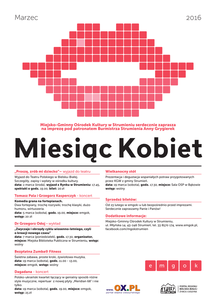 Marzec2016 Miejsko-Gminny Ośrodek Kultury w Strumieniu serdecznie zaprasza na imprezę pod patronatem Burmistrza Strumienia Anny Grygierek Miesiąc Kobiet „Proszę, zrób mi dziecko”– wyjazd do teatru Wielkanocny stół Wyjazd do Teatru Polskiego w Bielsku-Białej. Szczegóły, zapisy i wpłaty w ośrodku kultury. data: 2 marca (środa), wyjazd z Rynku w Strumieniu: 17.45, spektakl o godz. 19.00, bilet: 20 zł Prezentacja i degustacja wspaniałych potraw przygotowanych przez KGW z gminy Strumień. data: 19 marca (sobota), godz. 17.30, miejsce: Sala OSP w Bąkowie wstęp: wolny Tomasz Pala i Grzegorz Kasperczyk - koncert Komedia grana na fortepianach. Sprzedaż biletów: Dwa fortepiany, trochę rozrywki, trochę klasyki, dużo humoru, wirtuozeria. data: 5 marca (sobota), godz. 19.00, miejsce: emgok, wstęp: 20 zł Dr Grzegorz Odoj - wykład „Zwyczaje i obrzędy cyklu wiosenno-letniego, czyli o kreacji nowego czasu” data: 7 marca (poniedziałek), godz. 17.30, organizator, miejsce: Miejska Biblioteka Publiczna w Strumieniu, wstęp: wolny Bezpłatna Zumba® Fitness Świetna zabawa, proste kroki, żywiołowa muzyka, data: 19 marca (sobota), godz. 11.00 - 13.00, miejsce: emgok, wstęp: wolny Dagadana - koncert Polsko-ukraiński kwartet łączący w genialny sposób różne style muzyczne, repertuar z nowej płyty „Meridian 68” i nie tylko. data: 19 marca (sobota), godz. 19.00, miejsce: emgok, wstęp: 25 zł Od 23 lutego w emgok-u lub bezpośrednio przed imprezami. Serdecznie zapraszamy Panie i Panów! Dodatkowe informacje: Miejsko-Gminny Ośrodek Kultury w Strumieniu, ul. Młyńska 14, 43-246 Strumień, tel. 33 8570 174, www.emgok.pl, facebook.com/mgokstrumien