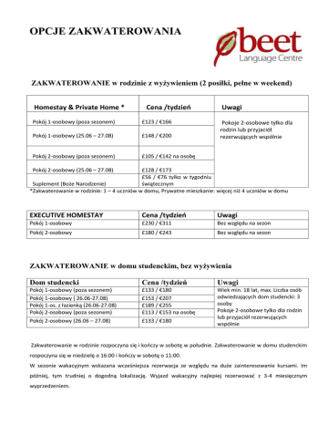 OPCJE ZAKWATEROWANIA ZAKWATEROWANIE w rodzinie z wyżywieniem (2 posiłki, pełne w weekend) Homestay & Private Home * Cena /tydzień Pokój 1-osobowy (poza sezonem) £123 / €166 Pokój 1-osobowy (25.06 – 27.08) £148 / €200 Pokój 2-osobowy (poza sezonem) £105 / €142 na osobę Uwagi Pokoje 2-osobowe tylko dla rodzin lub przyjaciół rezerwujących wspólnie Pokój 2-osobowy (25.06 – 27.08) £128 / €173 £56 / €76 tylko w tygodniu Suplement (Boże Narodzenie) świątecznym *Zakwaterowanie w rodzinie: 1 – 4 uczniów w domu, Prywatne mieszkanie: więcej niż 4 uczniów w domu EXECUTIVE HOMESTAY Cena /tydzień Uwagi Pokój 1-osobowy £230 / €311 Bez względu na sezon Pokój 2-osobowy £180 / €243 Bez względu na sezon ZAKWATEROWANIE w domu studenckim, bez wyżywienia Dom studencki Cena /tydzień Uwagi Pokój 1-osobowy (poza sezonem) Pokój 1-osobowy ( 26.06-27.08) Pokój 1-os. z łazienką (26.06-27.08) Pokój 2-osobowy (poza sezonem) £133 / €180 £153 / €207 £189 / €255 £113 / €153 na osobę Pokój 2-osobowy (26.06 – 27.08) £133 / €180 Wiek min. 18 lat, max. Liczba osób odwiedzających dom studencki: 3 osoby Pokoje 2-osobowe tylko dla rodzin lub przyjaciół rezerwujących wspólnie Zakwaterowanie w rodzinie rozpoczyna się i kończy w sobotę w południe. Zakwaterowanie w domu studenckim rozpoczyna się w niedzielę o 16:00 i kończy w sobotę o 11:00. W sezonie wakacyjnym wskazana wcześniejsza rezerwacja ze względu na duże zainteresowanie kursami. Im później, tym trudniej o dogodną lokalizację. Wyjazd wakacyjny najlepiej rezerwować z 3-4 miesięcznym wyprzedzeniem. TRANSWER Z LOTNISKA ( w jedną stronę) PROPONOWANE DATY ROZPOCZĘCIA KURSU Heathrow Airport £165 / €223 Styczeń 4 Gatwick Airport £175 / €236 Luty 1,29 Bournemouth Airport £52 / €70 Marzec 29 Southampton £92 / €124 Kwiecień 25 Central London £200 / €270 Maj 23 Stansted £205 / €277 Czerwiec 20 Luton £175 / €236 Lipiec 4, 11, 18, 25 Sierpień 1, 8, 15, 30 Wrzesień 26 ŚWIĘTA PAŃSTWOWE 25, 28.03.2016 2,30.05.2016 29.08.2016 Dwa tygodnie Od 19.12.2016 Październik 24 Listopad 21