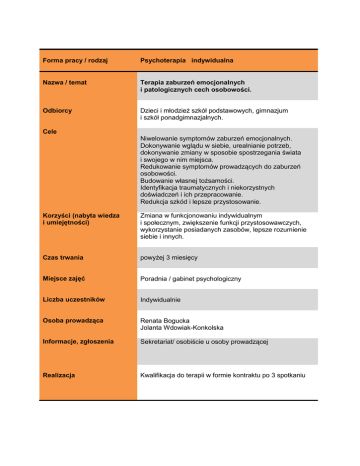 Forma pracy / rodzaj Psychoterapia indywidualna Nazwa / temat