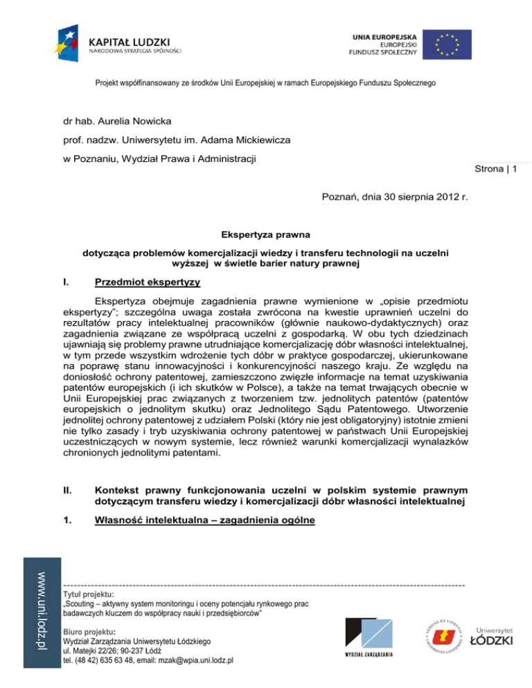 Projekt współfinansowany ze środków Unii Europejskiej w ramach Europejskiego Funduszu Społecznego dr hab. Aurelia Nowicka prof. nadzw. Uniwersytetu im. Adama Mickiewicza w Poznaniu, Wydział Prawa i Administracji Strona | 1 Poznań, dnia 30 sierpnia 2012 r. Ekspertyza prawna dotycząca problemów komercjalizacji wiedzy i transferu technologii na uczelni wyższej w świetle barier natury prawnej I. Przedmiot ekspertyzy Ekspertyza obejmuje zagadnienia prawne wymienione w „opisie przedmiotu ekspertyzy”; szczególna uwaga została zwrócona na kwestie uprawnień uczelni do rezultatów pracy intelektualnej pracowników (głównie naukowo-dydaktycznych) oraz zagadnienia związane ze współpracą uczelni z gospodarką. W obu tych dziedzinach ujawniają się problemy prawne utrudniające komercjalizację dóbr własności intelektualnej, w tym przede wszystkim wdrożenie tych dóbr w praktyce gospodarczej, ukierunkowane na poprawę stanu innowacyjności i konkurencyjności naszego kraju. Ze względu na doniosłość ochrony patentowej, zamieszczono zwięzłe informacje na temat uzyskiwania patentów europejskich (i ich skutków w Polsce), a także na temat trwających obecnie w Unii Europejskiej prac związanych z tworzeniem tzw. jednolitych patentów (patentów europejskich o jednolitym skutku) oraz Jednolitego Sądu Patentowego. Utworzenie jednolitej ochrony patentowej z udziałem Polski (który nie jest obligatoryjny) istotnie zmieni nie tylko zasady i tryb uzyskiwania ochrony patentowej w państwach Unii Europejskiej uczestniczących w nowym systemie, lecz również warunki komercjalizacji wynalazków chronionych jednolitymi patentami. II. Kontekst prawny funkcjonowania uczelni w polskim systemie prawnym dotyczącym transferu wiedzy i komercjalizacji dóbr własności intelektualnej 1. Własność intelektualna – zagadnienia ogólne www.uni.lodz.pl -------------------------------------------------------------------------------------------------------------------- Tytuł projektu: „Scouting – aktywny system monitoringu i oceny potencjału rynkowego prac badawczych kluczem do współpracy nauki i przedsiębiorców” Biuro projektu: Wydział Zarządzania Uniwersytetu Łódzkiego ul. Matejki 22/26; 90-237 Łódź tel. (48 42) 635 63 48, email: [email protected] Projekt współfinansowany ze środków Unii Europejskiej w ramach Europejskiego Funduszu Społecznego Analiza zostanie przeprowadzona odrębnie w odniesieniu do dwóch głównych dziedzin własności intelektualnej, tj. w odniesieniu do: a) danych; b) (a) prawa autorskiego i praw pokrewnych oraz prawa sui generis do baz Strona | 2 praw własności przemysłowej (oraz praw do odmian roślin). Regulacje krajowe Pierwszą z wyróżnionych wyżej dziedzin regulują: a) ustawa z dnia 4 lutego 1994 r. o prawie autorskim i prawach pokrewnych (Dz.U. z 2006 r. Nr 90, poz. 631, ze zm.), dalej: pr. aut.; b) ustawa z dnia 27 lipca 2001 r. o ochronie baz danych (Dz.U. Nr 128, poz. 1402, ze zm.); Drugą dziedzinę regulują: a) ustawa z dnia 30 czerwca 2000 r. – Prawo własności przemysłowej (Dz.U. z 2003 r. Nr 119, poz. 1117, ze zm.), dalej: ustawa p.w.p.; b) ustawa z dnia 26 czerwca 2003 r. o ochronie prawnej odmian roślin (Dz.U. Nr 137, poz. 1300, ze zm.). Dla porządku, poniżej wymieniam prawa własności intelektualnej przewidziane w ustawodawstwie polskim, ze wskazaniem (w nawiasach) przedmiotów tych praw: (a) prawa autorskie (utwory), (b) prawa pokrewne (artystyczne wykonania, fonogramy, wideogramy, nadania programów, pierwsze wydania oraz wydania naukowe i krytyczne); (c) prawa sui generis (bazy danych), (d) prawa własności przemysłowej: (i) patenty (na wynalazki), (ii) dodatkowe prawa ochronne (na produkty lecznicze i produkty ochrony roślin); www.uni.lodz.pl -------------------------------------------------------------------------------------------------------------------- Tytuł projektu: „Scouting – aktywny system monitoringu i oceny potencjału rynkowego prac badawczych kluczem do współpracy nauki i przedsiębiorców” Biuro projektu: Wydział Zarządzania Uniwersytetu Łódzkiego ul. Matejki 22/26; 90-237 Łódź tel. (48 42) 635 63 48, email: [email protected] Projekt współfinansowany ze środków Unii Europejskiej w ramach Europejskiego Funduszu Społecznego (iii) prawa ochronne (na wzory użytkowe oraz znaki towarowe); (iv) prawa z rejestracji (na wzory przemysłowe, topografie układów scalonych oraz oznaczenia geograficzne); (e) wyłączne prawo (do ochrony odmian roślin); Jednolite (unijne) prawa własności przemysłowej (b) Na gruncie prawa Unii Europejskiej należy mieć na uwadze jednolite (unijne) prawa własności przemysłowej, które zostały ustanowione na podstawie: 1) rozporządzenia Rady (EWG) nr 2081/92 z 14.7.1992 r. w sprawie ochrony oznaczeń geograficznych i oznaczeń pochodzenia produktów rolnych i środków spożywczych1; obecnie obowiązuje w tym zakresie rozporządzenie Rady (WE) nr 510/2006 z 20.3.2006 r. w sprawie ochrony oznaczeń geograficznych i nazw pochodzenia produktów rolnych i środków spożywczych2; 2) rozporządzenia Rady (WE) nr 40/94 z 20.12.1993 r. w sprawie wspólnotowego znaku towarowego3; obecnie obowiązuje w tym zakresie rozporządzenie Rady (WE) nr 207/2009 z 26.2.2009 r. w sprawie wspólnotowego znaku towarowego4; 3) rozporządzenia Rady (WE) nr 2100/94 z 27.7.1994 r. w sprawie wspólnotowych praw do odmian roślin5; 4) rozporządzenia Rady (WE) nr 6/2002 z 12.12.2001 r. w sprawie wspólnotowych wzorów6; 1 Dz.Urz. WE L 208 z 24.7.1992 r. 2 Dz.Urz. UE L 93 z 31.3.2006 r. 3 Dz.Urz. WE L 11 z 14.1.1994 r. 4 Dz.Urz. L 78 z 24.3.2009 r. 5 Dz.Urz. WE L 227 z 1.9.1994 r. 6 Dz.Urz. WE L 3 z 5.1.2002 r. www.uni.lodz.pl -------------------------------------------------------------------------------------------------------------------- Tytuł projektu: „Scouting – aktywny system monitoringu i oceny potencjału rynkowego prac badawczych kluczem do wspó