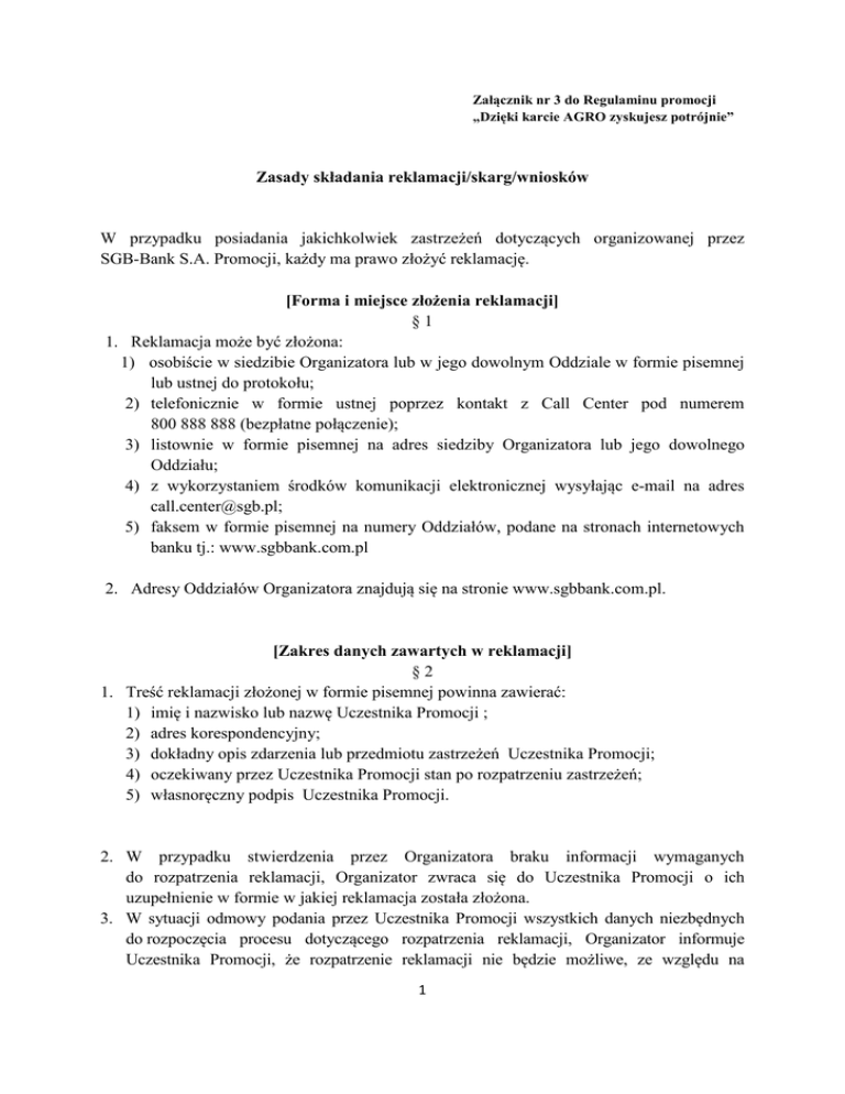 Załącznik nr 3 do Regulaminu promocji „Dzięki karcie AGRO zyskujesz potrójnie” Zasady składania reklamacji/skarg/wniosków W przypadku posiadania jakichkolwiek zastrzeżeń dotyczących organizowanej przez SGB-Bank S.A. Promocji, każdy ma prawo złożyć reklamację. [Forma i miejsce złożenia reklamacji] §1 1. Reklamacja może być złożona: 1) osobiście w siedzibie Organizatora lub w jego dowolnym Oddziale w formie pisemnej lub ustnej do protokołu; 2) telefonicznie w formie ustnej poprzez kontakt z Call Center pod numerem 800 888 888 (bezpłatne połączenie); 3) listownie w formie pisemnej na adres siedziby Organizatora lub jego dowolnego Oddziału; 4) z wykorzystaniem środków komunikacji elektronicznej wysyłając e-mail na adres [email protected]; 5) faksem w formie pisemnej na numery Oddziałów, podane na stronach internetowych banku tj.: www.sgbbank.com.pl 2. Adresy Oddziałów Organizatora znajdują się na stronie www.sgbbank.com.pl. [Zakres danych zawartych w reklamacji] §2 1. Treść reklamacji złożonej w formie pisemnej powinna zawierać: 1) imię i nazwisko lub nazwę Uczestnika Promocji ; 2) adres korespondencyjny; 3) dokładny opis zdarzenia lub przedmiotu zastrzeżeń Uczestnika Promocji; 4) oczekiwany przez Uczestnika Promocji stan po rozpatrzeniu zastrzeżeń; 5) własnoręczny podpis Uczestnika Promocji. 2. W przypadku stwierdzenia przez Organizatora braku informacji wymaganych do rozpatrzenia reklamacji, Organizator zwraca się do Uczestnika Promocji o ich uzupełnienie w formie w jakiej reklamacja została złożona. 3. W sytuacji odmowy podania przez Uczestnika Promocji wszystkich danych niezbędnych do rozpoczęcia procesu dotyczącego rozpatrzenia reklamacji, Organizator informuje Uczestnika Promocji, że rozpatrzenie reklamacji nie będzie możliwe, ze względu na 1 niekompletność oświadczenia Uczestnika Promocji. Niezależnie od powyższego Uczestnik Promocji jest informowany o rozpatrzeniu reklamacji w terminie wskazanym w § 4 ust. 1. [Sposób potwierdzenia wpływu reklamacji] §3 Organizator potwierdza złożenie reklamacji w formie pisemnej. 1. 2. 3. 4. 5. 6. 7. 8. 9. [Termin rozpatrzenia reklamacji] §4 Organizator odpowiada na reklamację bez zbędnej zwłoki nie później niż w terminie 30 dni kalendarzowych od daty wpływu reklamacji do Organizatora. W szczególnie skomplikowanych przypadkach termin, o którym mowa w ust. 1, może ulec wydłużeniu do 60 dni kalendarzowych, a w przypadku Uczestników Promocji będących osobami prawnymi , z wyjątkiem osób fizycznych prowadzących działalność gospodarczą, w tym wspólników spółek cywilnych i rolników, do 90 dni. Za szczególne skomplikowane przypadki, o których mowa w ust. 2 uznaje się konieczność uzyskania przez Organizatora dodatkowych informacji od podmiotów trzecich współpracujących z Organizatorem niezbędnych do rozpatrzenia reklamacji. W przypadku braku możliwości udzielenia odpowiedzi na złożoną reklamację w terminie określonym w ust. 1, Organizator w formie pisemnej w terminie 14 dni od dnia wpływu reklamacji: 1) wyjaśnia przyczyny opóźnienia w rozpatrywaniu reklamacji; 2) wyjaśnia okoliczności, które muszą zostać ustalone; 3) wskazuje przewidywany terminu udzielenia odpowiedzi na złożoną reklamację, który nie może być dłuższy niż wskazany w ust. 2. Do zachowania terminu, o którym mowa w ust. 1 i 2, wystarczy wysłanie odpowiedzi przed jego upływem. W przypadku niedotrzymania terminu określonego w ust. 1, a w szczególnie skomplikowanych przypadkach, o których mowa w ust. 3, terminu określonego w ust. 2, reklamację uznaje się za rozpatrzoną zgodnie z wolą Uczestnika Promocji . Zasad opisanych w ust. 6 nie stosuje się do reklamacji złożonych przez Uczestników Promocji będących osobami prawnymi za wyjątkiem osób fizycznych prowadzących działalność gospodarczą, w tym wspólników spółek cywilnych i rolników. Udzielając odpowiedzi na reklamację Organizator bierze pod uwagę stan faktyczny istniejący w ostatnim dniu terminu na udzielenie odpowiedzi na reklamację, chyba że informacje i ewentualne dokumenty, jakimi dysponuje Organizator, umożliwiają udzielenie odpowiedzi wcześniej. W przypadku gdy zmianie ulegnie stan faktyczny, w oparciu o który Organizator udzielił odpowiedzi na reklamację, Organizator ponownie rozpoznaje reklamację biorąc pod uwagę zmieniony stan faktyczny, o ile zmiany nastąpiły na korzyść Uczestnika Promocji. 2 [Sposób powiadomienia o rozpatrzeniu reklamacji] §5 1. Odpowiedź na reklamację udzielana jest w formie pisemnej i wysyłana: 1) listem poleconym na adres wskazany w reklamacji, z zastrzeżeniem pkt 2; 2) wyłącznie na wniosek Uczestnika Promocji z wykorzystaniem środków komunikacji elektronicznej na adres mailowy, z którego reklamacja została wysłana., chyba że Uczestnika Promocji poda w reklamacji inny adres mailowy poprzez załączenie skanu odpowiedzi. 1. 2. 3. 4. [Informacje dodatkowe] §6 Organizator podlega nadzorowi Komisji Nadzoru Finansowego. W razie sporu z Organizatorem klient będący konsumentem może zwrócić się o pomoc do Miejskiego lub Powiatowego Rzecznika Konsumenta. Od stanowiska zawartego w odpowiedzi na reklamację Uczestnik Promocji może: 1) odwołać się do wyższych szczebli decyzyjnych Organizatora, w tym Rady Nadzorczej; 2) złożyć zapis na Sąd Polubowny przy Komisji Nadzoru Finansowego; 3) skorzystać z instytucji Arbitra Bankowego przy Związku Banków Polskich; 4) złożyć wniosek o rozpatrzenie sprawy do Rzecznika Finansowego lub 5) wystąpić z powództwem do sądu powszechnego. Zasady opisanej w ust. 3 pkt 4 nie stosuje się do Uczestników Promocji będących osobami prawnymi, za wyjątkiem osób fizycznych prowadzących działalność gospodarczą, w tym wspólników spółek cywilnych i rolników. [Skargi] §7 1. Klien ma prawo złożyć skargę – oświadczenie nie będące reklamacją - w przypadku posiadani