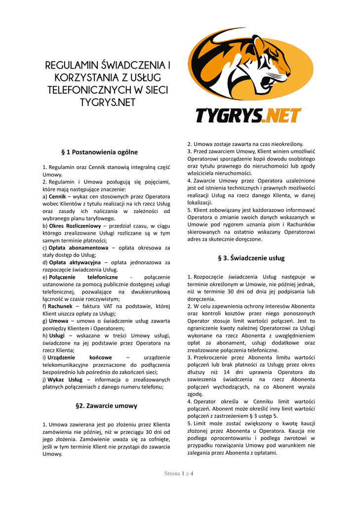 REGULAMIN ŚWIADCZENIA I KORZYSTANIA Z USŁUG TELEFONICZNYCH W SIECI TYGRYS.NET § 1 Postanowienia ogólne 1. Regulamin oraz Cennik stanowią integralną część Umowy. 2. Regulamin i Umowa posługują się pojęciami, które mają następujące znaczenie: a) Cennik – wykaz cen stosownych przez Operatora wobec Klientów z tytułu realizacji na ich rzecz Usług oraz zasady ich naliczania w zależności od wybranego planu taryfowego. b) Okres Rozliczeniowy – przedział czasu, w ciągu którego zrealizowane Usługi rozliczane są w tym samym terminie płatności; c) Opłata abonamentowa – opłata okresowa za stały dostęp do Usług; d) Opłata aktywacyjna – opłata jednorazowa za rozpoczęcie świadczenia Usług. e) Połączenie telefoniczne połączenie ustanowione za pomocą publicznie dostępnej usługi telefonicznej, pozwalające na dwukierunkową łączność w czasie rzeczywistym; f) Rachunek – faktura VAT na podstawie, której Klient uiszcza opłaty za Usługi; g) Umowa – umowa o świadczenie usług zawarta pomiędzy Klientem i Operatorem; h) Usługi – wskazane w treści Umowy usługi, świadczone na jej podstawie przez Operatora na rzecz Klienta; i) Urządzenie końcowe – urządzenie telekomunikacyjne przeznaczone do podłączenia bezpośrednio lub pośrednio do zakończeń sieci; j) Wykaz Usług – informacja o zrealizowanych płatnych połączeniach z danego numeru telefonu; §2. Zawarcie umowy 1. Umowa zawierana jest po złożeniu przez Klienta zamówienia nie później, niż w przeciągu 30 dni od jego złożenia. Zamówienie uważa się za cofnięte, jeśli w tym terminie Klient nie przystąpi do zawarcia Umowy. 2. Umowa zostaje zawarta na czas nieokreślony. 3. Przed zawarciem Umowy, Klient winien umożliwić Operatorowi sporządzenie kopii dowodu osobistego oraz tytułu prawnego do nieruchomości lub zgody właściciela nieruchomości. 4. Zawarcie Umowy przez Operatora uzależnione jest od istnienia technicznych i prawnych możliwości realizacji Usług na rzecz danego Klienta, w danej lokalizacji. 5. Klient zobowiązany jest każdorazowo informować Operatora o zmianie swoich danych wskazanych w Umowie pod rygorem uznania pism i Rachunków skierowanych na ostatnio wskazany Operatorowi adres za skutecznie doręczone. § 3. Świadczenie usług 1. Rozpoczęcie świadczenia Usług następuje w terminie określonym w Umowie, nie później jednak, niż w terminie 30 dni od dnia jej podpisania lub doręczenia. 2. W celu zapewnienia ochrony interesów Abonenta oraz kontroli kosztów przez niego ponoszonych Operator stosuje limit wartości połączeń. Jest to ograniczenie kwoty należnej Operatorowi za Usługi wykonane na rzecz Abonenta z uwzględnieniem opłat za abonament, usługi dodatkowe oraz zrealizowane połączenia telefoniczne. 3. Przekroczenie przez Abonenta limitu wartości połączeń lub brak płatności za Usługę przez okres dłuższy niż 14 dni uprawnia Operatora do zawieszenia świadczenia na rzecz Abonenta połączeń wychodzących, na co Abonent wyraża zgodę. 4. Operator określa w Cenniku limit wartości połączeń. Abonent może określić inny limit wartości połączeń z zastrzeżeniem § 3 ustęp 5. 5. Limit może zostać zwiększony o kwotę kaucji złożonej przez Abonenta u Operatora. Kaucja nie podlega oprocentowaniu i podlega zwrotowi w przypadku rozwiązania Umowy pod warunkiem nie zalegania przez Abonenta z opłatami. Strona 1 z 4 6. Abonent, który w okresie 30 dni od zawieszenia świadczenia Usług z powodu braku płatności nie dokona spłaty w całości swojego zadłużenia wobec Operatora będzie obciążony opłatą za ponowną aktywację zgodnie z obowiązującym Cennikiem. § 4. Wypożyczenie sprzętu 1. Operator udostępnia sprzęt na podstawie protokołu zdawczo-odbiorczego podpisanego przez klienta. 2. Operator zobowiązuje się do nieodpłatnej wymiany uszkodzonego sprzętu, który został udostępniony Klientowi, w przypadku ujawnienia się podczas instalacji lub eksploatacji ukrytych wad technicznych któregokolwiek z jego elementów. 3. Klient Usługi odpowiedzialny jest za zniszczenie, uszkodzenie lub utratę udostępnianego zestawu instalacyjnego. 4. Klient zobowiązany jest do uiszczenia opłaty określonej w Cenniku w przypadku uszkodzenia sprzętu z przyczyn innych niż ukryte wady techniczne, zwrócenia niekompletnego sprzętu, jego utraty, jak również nie zwrócenia Sprzętu w terminie 14 dni kalendarzowych od daty rozwiązania/wygaśnięcia umowy. 5. Jeśli w chwili zwrotu udostępnianego sprzętu serwisant stwierdzi, iż sprzęt znajduje się w stanie niekompletnym (brak wyposażenia dodatkowego), wówczas Klient będzie zobowiązany do naprawienia wynikłej stąd szkody poprzez odkupienie brakującej części. W przeciwnym razie Operator obciąży Abonenta opłatą określoną w cenniku. § 5. Obsługa serwisowa 1. Klient może zgłaszać reklamacje lub zasięgać informacji w Biurze Obsługi Klienta Operatora telefonicznie pod numerem: 058 732 25 91, 695 695 661, drogą elektroniczną na adres [email protected] lub pisemnie pod adresem Operatora. 2. Operator zapewnia Klientowi nieodpłatnie skrócony Wykaz Usług telekomunikacyjnych obejmujący sumaryczny czas trwania i wartość poszczególnych typów połączeń. § 6. Należności z tytułu świadczenia usług 1. Klient zobowiązany jest do terminowego uiszczania na rzecz Operatora należności z tytułu zrealizowanych Usług, bez względu na okoliczność, kto z tych usług bezpośrednio korzystał. 2. Opłata abonamentowa pobierana jest z góry w każdym Okresie Rozliczeniowym. 3. Należności Operatora z tytułu realizacji Usług naliczane są na postawie cen wskazanych we właściwym Cenniku, obowiązującym w chwili wykonania Usługi oraz w sposób tam wskazany. 4. Okresem Rozliczeniowym jest miesiąc. 5. Brak doręczenia Klientowi rachunku nie zwalnia go z obowiązku uiszczenia wszystkich opłat za Usługi świadczone w danym Okresie Rozlicz