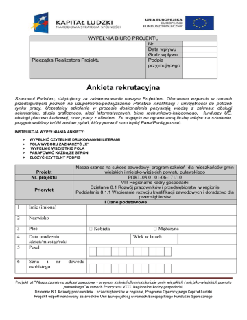 WYPEŁNIA BIURO PROJEKTU Nr Data wpływu Godz.wpływu Pieczątka Realizatora Projektu Podpis przyjmującego Ankieta rekrutacyjna Szanowni Państwo, dziękujemy za zainteresowanie naszym Projektem. Oferowane wsparcie w ramach przedsięwzięcia pozwoli na uzupełnienie/podwyższenie Państwa kwalifikacji i umiejętności do potrzeb rynku pracy. Uczestnicy szkolenia w procesie doskonalenia pozyskają wiedzę z zakresu: obsługi sekretariatu, studia graficznego, sieci informatycznych, biura rachunkowo-księgowego, funduszy UE, obsługi płacowo kadrowej, oraz pracy z klientem. Ze względu na ograniczoną liczbę miejsc na szkolenie, przygotowaliśmy krótki zestaw pytań, który pozwoli nam lepiej Pana/Panią poznać. INSTRUKCJA WYPEŁNIANIA ANKIETY: WYPEŁNIĆ CZYTELNIE DRUKOWANYMI LITERAMI POLA WYBORU ZAZNACZYĆ „X” WYPEŁNIĆ WSZYSTKIE POLA PARAFOWAĆ KAŻDĄ ZE STRON ZŁOŻYĆ CZYTELNY PODPIS Projekt Nr. projektu 1 Imię (imiona) 2 Nazwisko 3 Płeć 4 Data urodzenia /dzień/miesiąc/rok/ Pesel 6 Seria i osobistego POKL.08.01.01-06-171/10 VIII Regionalne kadry gospodarki Działanie 8.1 Rozwój pracowników i przedsiębiorstw w regionie Podziałanie 8.1.1 Wspieranie rozwoju kwalifikacji zawodowych i doradztwo dla przedsiębiorstw I Dane podstawowe Priorytet 5 Nasza szansa na sukces zawodowy- program szkoleń dla mieszkańców gmin wiejskich i miejsko-wiejskich powiatu puławskiego Mężczyna nr Wiek w latach dowodu Projekt pt.”Nasza szansa na sukces zawodowy – program szkoleń dla mieszkańców gmin wiejskich i miejsko-wiejskich powiatu puławskiego” w ramach Priorytetu VIII. Regionalne kadry gospodarki, Działanie 8.1. Rozwój pracowników i przedsiębiorstw w regionie, Programu Operacyjnego Kapitał Ludzki Projekt współfinansowany ze środków Unii Europejskiej w ramach Europejskiego Funduszu Społecznego 7 Wykształcenie podstawowe gimnazjalne ponadgimnazjalne /wykształcenie zawodowe/ średnie lub zasadnicze pomaturalne /wykształcenie na poziomie powyżej szkoły średniej, które jednocześnie nie jest wykształceniem wyższym/ II Adres pobytu stałego lub tymczasowego 1 Ulica/Aleja/Osiedle 2 Numer domu 3 Numer lokalu 4 Nazwa miejscowości 5 Kod pocztowy 6 Poczta 7 Obszar 8 Powiat 9 Województwo ∟∟∟∟ ∟∟∟∟ ∟∟-∟∟∟ wieś miasto III Adres korespondencyjny (proszę wypełnić, jeśli jest inny niż zameldowania) 1 Ulica/Aleja/Osiedle 2 Numer domu 3 Numer lokalu 4 Nazwa miejscowości 5 Kod pocztowy 6 Poczta 7 Obszar 8 Powiat 9 Województwo ∟∟∟∟ ∟∟∟∟ ∟∟-∟∟∟ miasto wieś Projekt pt.”Nasza szansa na sukces zawodowy – program szkoleń dla mieszkańców gmin wiejskich i miejsko-wiejskich powiatu puławskiego” w ramach Priorytetu VIII. Regionalne kadry gospodarki, Działanie 8.1. Rozwój pracowników i przedsiębiorstw w regionie, Programu Operacyjnego Kapitał Ludzki Projekt współfinansowany ze środków Unii Europejskiej w ramach Europejskiego Funduszu Społecznego IV Dane kontaktowe 1 Telefon stacjonarny /z nr kierunkowym/ (∟ ∟ ∟ ) ∟ ∟ ∟ ∟ ∟ ∟ ∟ 2 Telefon komórkowy ∟∟∟∟∟∟∟∟∟ 3 Adres poczty elektronicznej 1 Pracująca osoba dorosła (powyżej 18 roku życia), wykonująca pracę na podstawie: V Status uczestnika projektu ∟umowy o pracę ∟powołania ∟wyboru ∟umowy zlecenia ∟spółdzielczej umowy o pracę ∟ umowy o dzieło ∟mianowania VI Dane dotyczące miejsca pracy Branża/sektor działalności Zatrudniony/a na stanowisku Obszar zatrudnienia ∟ finanse i księgowość ∟ kadry i płace ∟ przedsiębiorczość ∟ informatyka ∟ inne (jakie?)…………………………………………………….. VII Informacje dotyczące udziału w projekcie 1 Wybór modułu szkoleniowego ∟ Profesjonalny sekretariat ∟ Moje studio graficzne ∟ Zaawansowany administrator sieci informatycznych ∟ Biuro rachunkowo – księgowe ∟ Specjalista ds. funduszy UE ∟ Profesjonalna obsługa kadrowo - płacowa ∟ Praca z klientem 2 3 Dlaczego chce Pan/i uzupełniać/podwyższać kwalifikacje i umiejętności uczestnicząc w Projekcie? Dlaczego chce Pan/i wziąć udział w szkoleniu w zakresie wybranego modułu? Projekt pt.”Nasza szansa na sukces zawodowy – program szkoleń dla mieszkańców gmin wiejskich i miejsko-wiejskich powiatu puławskiego” w ramach Priorytetu VIII. Regionalne kadry gospodarki, Działanie 8.1. Rozwój pracowników i przedsiębiorstw w regionie, Programu Operacyjnego Kapitał Ludzki Projekt współfinansowany ze środków Unii Europejskiej w ramach Europejskiego Funduszu Społecznego 4 Poziom umiejętności obsługi komputera Swój poziom umiejętności obsługi komputera ocenia Pani/Pan jako: słaby dobry średni 5 Poziom znajomości j. angielskiego Swój poziom znajomości j. angielskiego w skali 1-6 ocenia Pani/Pan jako: 1 2 3 4 5 6 VIII Informacje dodatkowe 1 2 3 Czy jest Pan/i zainteresowany/a udziałem w szkoleniach innych niż przewidziane w Projekcie? TAK /jeśli wybrał/a Pan /i odpowiedź Nie, proszę przejść do kolejnego pytania/ NIE Czy jest Pan/i zainteresowany/a innymi szkoleniami zawierającymi moduły e-learningowe? W ramach jakiej dziedziny/branży oraz w jakim zakresie chciałby/chciałaby Pan/i podnosić swoje kwalifikacje? TAK NIE finanse rachunkowość podatki marketing zarządzanie projektem prawo kompetencje osobiste logistyka zarządzanie zasobami ludzkimi strategia i kierowanie przedsiębiorstwem inne (jakie?)………………………………………………………… ………………………………………………………………………… W zakresie……………………………………………………………. ………………………………………………………………………… 4 Źródło informacji o projekcie W załączeniu przedkładam: aktualne zaświadczenie o zatrudnieniu kserokopię dowodu osobistego (z miejscem zameldowania) * inne* (jakie?): …………………………