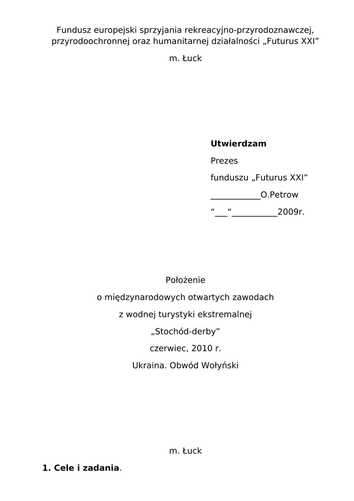 Fundusz europejski sprzyjania rekreacyjno-przyrodoznawczej, przyrodoochronnej oraz humanitarnej działalności „Futurus XXI” m. Łuck Utwierdzam Prezes funduszu „Futurus XXI” ____________О.Petrow “___“___________2009r. Położenie o międzynarodowych otwartych zawodach z wodnej turystyki ekstremalnej „Stochód-derby” czerwiec, 2010 r. Ukraina. Obwód Wołyński m. Łuck 1. Cele i zadania. Międzynarodowe zawody z turystyki ekstremalnej <<Stochódderby>> przeprowadzają się w celu: - propagowania oraz rozwoju turystyki ekologicznej w Ukrainie jako skutecznego sposobu wszechstronnego harmonijnego rozwoju osobowości, sprzyjania kształtowaniu się zdrowego sposobu życia mieszkańców; - ustalenia najsilniejszych grup sportowych; - wymiany doświadczeniem, rozszerzania stosunków przyjacielskich i stosunków między grupami sportowymi; - propagowania oraz dalszego rozwoju rodzaju sportu <<turystyka ekstremalna>> 2. Organizatorzy zawodów. Organizator zawodów – Europejski fundusz sprzyjania rekreacyjnoprzyrodoznawczej, przyrodoochronnej oraz humanitarnej działalności <<Futurus XXI>>. Ogólne kierownictwo nad przygotowaniem oraz przeprowadzeniem zawodów spełniają komitet organizacyjny oraz Centralny kolegium sędziów, ratyfikowane funduszem << Futurus XXI>>. Przewodniczący komitetu organizacyjnego – Chytryk W. М. (zastępca przewodniczącego Kamień-Kaszyrskiego zarządu rejonowego z pytań humanitarnych), Zastępca przewodniczącego komitetu organizacyjnego – Segodin А. І., Przewodniczący komisji mandatowej – Тolstichin L. N., Sędzia główny – Мichalewski W. N., Sekretarz główny – Krawczuk І. W. 3. Czas i miejsce przeprowadzania zawodów. Zawody przeprowadzają się od 18 do 20 czerwca 2010 roku. Miejsce przeprowadzania – odcinek rzeki Stochód między wsią Sitowiczi (start trasy B) i wsią Rudka Czerwinska (finisz). Główny obóz No. 1 znajduje się między wsią Sitowiczi (autostrada) oraz stacją kolejową Zajaciwka na lewym brzegu rzeki. Główny obóz No. 2 znajduje się na mecie, w okolicy w. Rudka Czerwinska, na lewym brzegu rzeki. 4. Program zawodów. 18 czerwca 13:00 – początek pracy komisji mandatowej. (Początek pracy agenta ubezpieczeniowego). 20:00 – konkurs filmów video na temat <<Podróże wodne>> (poza zaliczeniem). 19 czerwca: 9:00 – zakończenie pracy komisji mandatowej. Posiedzenie Przewodniczący Komisji Sędziowskiej (PKS) z przedstawicielami drużyn. (Zakończenie pracy agenta ubezpieczeniowego). 11:00 – start uczestnicy grupy A( orientacja). 12:00 - start uczestnicy grupy B (trasa wodna) 20 czerwca: 12:00 do 13:00 – nagrodzenie zdobywców nagród (medalistów) oraz zwycięzcy. 15:00 – odjazd uczestników zawodów. 5. Uczestnicy zawodów 5.1. . W zawodach biorą udział przedstawiciele sportowych, turystycznych klubów, sekcji sportowych, przedsiębiorstw, osoby prywatne Ukrainy oraz przedstawicieli innych krajów. 5.2. Do zawodów przyjmują się załogi, składające się z dwóch osób na własnych kanadyjkach, canoe, kajakach, rozkładanych lub <<szorstkich>>, innych środkach do pływania. 5.3. Uczestnicy muszą być w stanie orientacji, mieć doświadczenie w nocy spędzonej w lesie, na wodzie, należy być przygotowanym na każdą ewentualność . Organizatorzy zwracają uwagę na szacunek dla przyrody. 6. Warunki zawodów. 6.1 Zawody odbywają się na dwóch dystansach: Szlak klasy "A" składa się z dwóch tras: pierwsza - dla pieszych na orientację ( "opcja") w dlugości do 20 km. Na trasie 3-4 punktów kontrolnych (PK), mapa w skali M: 50 000 wydaje za jedną godzinę przed rozpoczęciem; początek ogólny, wykończenie na początku drugiej trasy (woda), a druga - na szlaku rzeki Stochód od wsi Sitoviczy do wsi Rudka Czerwińska. (Stochód - dopływ rzeki Prypeć, terytorium Wołyńu). Szlak klasy "B" – szlak wodny wzdłuż rzeki Stochód od wsi Sitoviczy do wsi Rudka Czerwińska. 6.2. . Zawody w dystansu klasy "A". Jeden z członków załogi zaczyna orientację, przychodzi do zakończenia, siada w łodzi na początku szlaku wodnego. Załoga zaczyna się poruszać na trasie wodnej. (Przypomnienie: Trasa przechodzi przez przepisy na orientację) 6.3. Zawody w dystansu klasy "B" – pokonanie szlaku wodnego (na okręcie), załogą z dwóch osób. 6.4.Właściwości trasy: szerokość terenu zalewanego rzeki na odcinku zawodów od 0,2 do 2 kilometrów; w terenie zalewanym mnóstwo zabagnionych odcinków, dziesiątki odnóg oraz starych nurtów porosłych trzciną, krzakami, trawą błotną, zatrasowane złamanymi drzewami. Orientować się skomplikowano, w niektórych miejscach jest widne tylko niebo. Techniczne komplikacje nie mają ograniczeń. Długość odcinka rzeki według mapy, bez obliczania współczynnika, 45 kilometrów. Przybliżony czas załogi-zwycięzcy – 22 godziny. Ogólny czas pokonania dystansu klasy "A" – 30 godzin. Ogólny czas pokonania dystansu klasy "B" – 28 godzin 6.5. Uczestnicy zawodów Uczestnicy zawodów na trasie wodnej (dystans klasy "B") mogą korzystać z jakiejkolwiek, poręcznej dla nich, mapy dystansu. Udziela się zgody na wykorzystanie nawigacji GPS, inne środki i metody orientacji w terenie. Kolegium Sędziowskie nada każdej załodze po jednej kolorowej topograficznej mapie dystansu w skali S: 100 000 (data ostatniego korygowania niewiadoma), ze wskazaniem rozpoczęcia i zakończenia, opcji wyjścia awaryjnego na trasie. 6.6. Przed początkiem zawodów każdy uczestnik podpisuje specjalną formę, w której uznaje zwiększone ryzyko zawodów i przejmuje odpowiedzialność za swe życie i zdrowie. 6.7. Każdy uczestnik na czas trasy powinien mieć telefon komórkowy. Do książki telefonicznej zapisują się numery Sędzi głównego zawodów, szefa pogotowia ratunkowego i lekarza pogotowia. 6.8. Jeżeli załoga zdecydowała się zejść z dystansu lub znajduje się w sytuacji awaryjnej, powinni zejść na lewy (zachodni) brzeg rzeki. 6.9. Do udzi