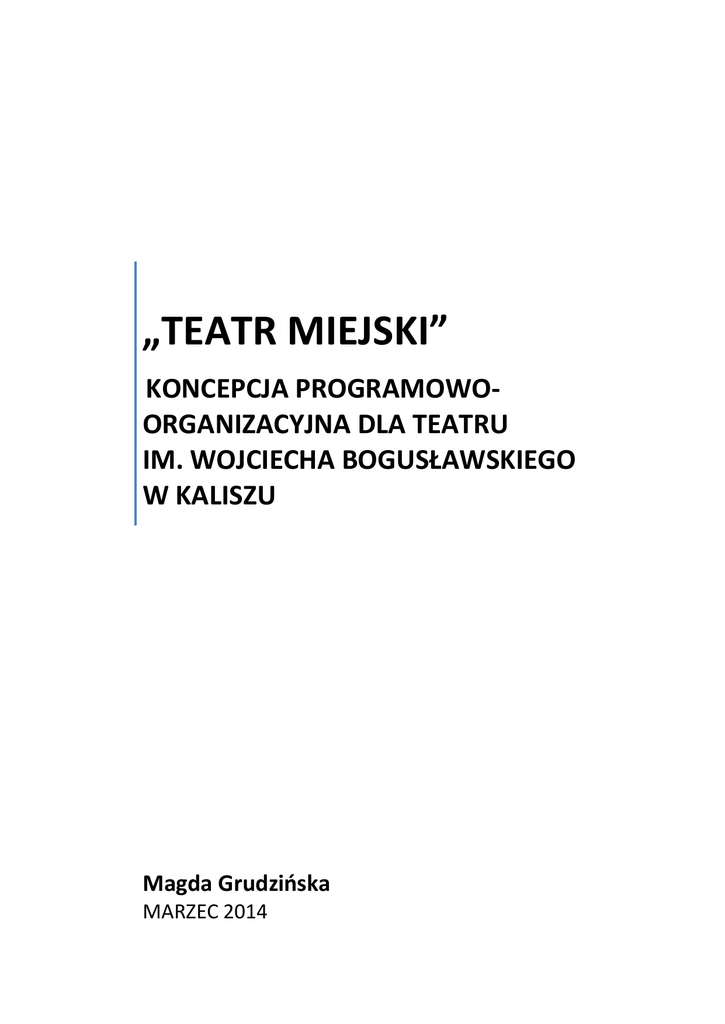 „TEATR MIEJSKI” KONCEPCJA PROGRAMOWOORGANIZACYJNA DLA TEATRU IM. WOJCIECHA BOGUSŁAWSKIEGO W KALISZU Magda Grudzińska MARZEC 2014 I. ZAŁOŻENIA PROGRAMOWE „Calisia – Poloniae civitatum vetustissima”. „Kalisz – najstarszym miastem Polski”, ta fraza stworzona przez Jana Długosza stała się obowiązkowym dopełnieniem nazwy miasta, tym hasłem Kalisz się reklamuje, o tym należy wspomnieć w każdej wypowiedzi na temat Kalisza. Nic więc dziwnego, że gdy zaczęłam tworzyć koncepcję dla Teatru im. Wojciecha Bogusławskiego, to te słowa jako pierwsze przyszły mi na myśl. Historia Teatru przecież ściśle łączy się z historią miasta, tak jak miasto Teatr płonął i odbudowywał się na nowo, jest ważnym składnikiem tożsamości i dumą miasta. A przynajmniej powinien być. Nie jest obojętne, w jakim mieście tworzy się teatr, dlatego uznałam, że ten kontekst najstarszej miejskości (nieistotne jest, czy faktycznie tak było, czy nie), tak ważny dla Kalisza, powinien stać się również ważnym punktem odniesienia dla Teatru. Zatem mój program dla Teatru im. Bogusławskiego zakłada spojrzenie na miasto i temat miejskości w podwójnej optyce: poprzez pryzmat przeszłości i przyszłości. Przeszłość, która po roku 1989 okazała się być nieznanym lądem, wymagającym dopiero odkrycia i skonfigurowania, wydaje się szczególnie fascynująca w przypadku tożsamości miejskiej, słabo osadzonej w polskiej historii i kulturze, Polska była bowiem krajem do niedawna jednak głównie wiejskim. Tworzenie teatru w najstarszym polskim mieście pozwala umieścić przeszłość w szczególnej optyce. Z kolei skupienie się na przyszłości miasta, próba kreowania artystycznych utopii skupionych wokół tego tematu, wymyślania siebie wciąż na nowo, pozwala na wprowadzenie na scenę najistotniejszych wątków związanych z lokalnymi zagadnieniami i problemami w ujęciu odbiegającym od prostej publicystyki. Teatr im. Bogusławskiego powinien być teatrem uczestniczącym aktywnie w życiu miasta, teatrem służącym społeczności lokalnej i odpowiadającym na jej potrzeby, inicjującym dyskusje o otaczającym świecie i zmieniającej się rzeczywistości, teatrem obecnym i zaangażowanym. Innymi słowy – nie teatr jako świątynia, elitarny i zamknięty, ale teatr jako agora, miejsce otwarte, gdzie toczy się życie i prowadzi się pasjonujące rozmowy. Takie idee powinny towarzyszyć tworzeniu repertuaru, ale nie można się tu ograniczać tylko do pokazywania spektakli. Teatr powinien proponować więcej, obudowywać spektakle szeregiem dodatkowych działań: warsztatami, spotkaniami ze specjalistami z różnych dziedzin, dyskusjami, wystawami, pokazami filmów czy koncertami, które będą tworzyć dla spektakli szeroki kontekst i pokazywać, że przedstawienie teatralne nie jest abstrakcyjnym dziełem sztuki do podziwiania, ale zaproszeniem do rozmowy na tematy, które nas dotyczą. Dodatkowo Teatr powinien włączać się w rozmaite wydarzenia, dziejące się w mieście i regionie, udostępniać swój budynek na ciekawe inicjatywy, jak i z tego budynku wychodzić. Powinien aktywnie szukać odbiorców i partnerów, zarówno biorąc udział w przedsięwzięciach organizowanych przez inne podmioty, jak i inicjować nowe, integrować i zapraszać do współpracy. Teatr jest wydarzeniem wspólnotowym, dlatego w życiu wspólnoty powinien uczestniczyć oraz wspólnotę wokół siebie skupiać, organizować. Żeby 2 teatr był wiarygodny, opowiadając o świecie wokół nas, musi stać w centrum tego świata, a nie zamykać się przed nim, musi również go kształtować. Powinien też cały czas analizować swój język i poszukiwać nowych środków wyrazu, które pozwolą mu opisywać zmieniającą się rzeczywistość. II. TEATR DLA DZIECI I MŁODZIEŻY SZKOLNEJ/DZIAŁANIA EDUKACYJNE W tej dziedzinie przede wszystkim chciałabym nawiązać współpracę z pedagogiem teatru, czyli osobą wyspecjalizowaną w prowadzeniu współpracy na liniach teatr-szkołaedukatorzy/nauczyciele-widzowie (zarówno młodzi, jak i dorośli). Zadaniem pedagoga teatru byłoby prowadzenie mądrej rozmowy z publicznością poprzez stworzenie oferty warsztatowej nawiązującej do pokazywanych spektakli, i realizowanej również we współpracy z ich twórcami: reżyserami, scenografami, choreografami, kompozytorami, aktorami. Warsztaty te miałyby na celu zwiększanie aktywności widzów, zachęcanie ich do uczestnictwa, a nie tylko biernego odbioru, pomagały w poznawaniu i rozumieniu języka sceny, ale przede wszystkim inicjowały dyskusję nie tyle o teatrze, co o problemach czy tematach, których dotyczą oglądane przedstawienia, czyli pokazywały, że celem teatru jest analiza rzeczywistości i opowieść o świecie, a nie tylko przeniesienie tekstu dramatu/lektury na scenę. Na cykl takich warsztatów Teatr może się także starać o zdobycie dodatkowych funduszy (m.in. w Ministerstwie Kultury i Dziedzictwa Narodowego, Ministerstwie Edukacji Narodowej czy w programie „Kultura – interwencje” Narodowego Centrum Kultury). Działania prowadzone przez pedagoga teatru miałby też dodatkowy, dalekosiężny cel: jednym z rezultatów takiej działalności powinno być stworzenie wokół Teatru grupy aktywnych młodych współpracowników, którzy pełniliby rolę ambasadorów Teatru w swoich środowiskach, byli częścią Teatru i czuli się z nim związani i za niego odpowiedzialni. Taka strategia, owocująca zwiększeniem ilości widzów i wzmocnieniem ich identyfikacji z działaniami Teatru świetnie działa np. w Teatrze Polskim w Bydgoszczy i na ich przykładzie chciałabym się wzorować. Ponadto chciałabym, już w pierwszym sezonie, wprowadzić do repertuaru Teatru przedstawienie z nurtu „teatr dla najnajmłodszych” czyli dla dzieci w wieku od 0 do 3 lat. Nurt ten jest świeżym zjawiskiem w polskim teatrze, ale coraz bardziej się rozwijającym i coraz lepie