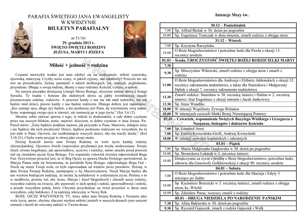 PARAFIA ŚWIĘTEGO JANA EWANGELISTY W KWIDZYNIE BIULETYN PARAFIALNY nr 51/16/ 29. grudnia 2013 r. ŚWIĘTO ŚWIĘTEJ RODZINY JEZUSA, MARYI I JÓZEFA Miłość + jedność = rodzina Czasami niezwykle trudno jest nam zdobyć się na serdeczność, miłość synowską, ojcowską, matczyną. Czyżby nowe czasy, w jakich żyjemy, nas odmieniły? Przecież nic nie stoi na przeszkodzie, byśmy pamiętali o takich drobiazgach, jak uśmiech, pogłaskanie, przytulenie. Dbając o swoją rodzinę, dbamy o nasz rodzinny Kościół, o wiarę, o miłość. Na samym początku dzisiejszej Liturgii Słowa Bożego, słyszymy mocne słowa z Księgi Syracha. Te trudne i bolesne dla niektórych słowa są jakby kwintesencją zasady poszanowania rodziny, rodziców. A przecież każdy z nas ma lub miał rodziców, ma lub będzie miał dzieci, prawie każdy z nas będzie rodzicem. Dlatego dobrze jest zapamiętać: „Kto szanuje ojca, długo żyć będzie, a kto posłuszny jest Panu, da wytchnienie swej matce: Synu, wspomagaj swego ojca w starości, nie zasmucaj go w jego życiu.” (Syr 3,6.12) Musimy sobie zdawać sprawę z tego, iż miłość to doskonałość, a całe dobro czynione przez nas naszym bliskim, żonie, mężowi. dzieciom, to dobro czynione w imię Jezusa. Św. Paweł mówi: „Żony bądźcie poddane mężom, jak przystało w Panu. Mężowie, miłujcie żony i nie bądźcie dla nich przykrymi! Dzieci, bądźcie posłuszne rodzicom we wszystkim, bo to jest miłe w Panu. Ojcowie, nie rozdrażniajcie waszych dzieci, aby nie traciły ducha.” (Kol 3,18-21). Chyba warto przyjąć te słowa jako swoje motto. Dzisiaj Kościół stawia nam Świętą Rodzinę za wzór życia każdej rodziny chrześcijańskiej. Ojcostwo Józefa (wprawdzie przybrane) jest trochę niedoceniane. Święty Józef, równie bogobojny, jak sprawiedliwy, uczciwy i rzetelny, mimo strachu przed prawem stał się ziemskim ojcem Syna Bożego. Ten wspaniały człowiek również odpowiedział Bogu Fiat. Oczywistym przecież jest, że to Bóg Ojciec za sprawą Ducha Świętego spowodował, że Maryja Panna stała się brzemienną, że porodziła Syna Bożego, odpowiadając Bogu Fiat – Niech się stanie Twoja wola, co było zapowiadane od wieków przez proroków. Dzisiaj, w dniu Święta Świętej Rodziny, pamiętajmy o Jej Macierzyństwie. Niech Maryja będzie dla nas wzorem budzącym nadzieję, że można Ją naśladować w codziennym życiu. Prośmy o to w modlitwie, prośmy też, aby Jezus, Maryja i Józef błogosławili i chronili nasze rodziny, wszystkie rodziny na świecie, aby panowały w nich spokój i radość, sprawiedliwość i miłość, a przede wszystkim pokój, który Chrystus przychodząc na świat przyniósł w darze nam wszystkim, całej ludzkości. Z tą nadzieją wkroczmy w Nowy Rok. BOŻE, OJCZE WSZYSTKICH, TY, który dałeś nam Świętą Rodzinę z Nazaretu jako wzór życia, spraw, abyśmy złączeni węzłem miłości jaśnieli w naszych domach tymi samymi cnotami i doszli do wiecznej radości w Twoim domu. Intencje Mszy św. 30.12 – Poniedziałek Śp. Alfred Bielak w 30. dzień po pogrzebie Śp. Eugeniusz Tomczak w dniu imienin, zmarli rodzice z obojga stron 31.12 – Wtorek 7.00 Śp. Krystyna Raczyńska O Boże błogosławieństwo i potrzebne łaski dla Pawła z okazji 13. 18.00 rocznicy urodzin 01.01 – Środa, UROCZYSTOŚĆ ŚWIĘTEJ BOŻEJ RODZICIELKI MARYI 7.00 18.00 7.30 Śp. Mieczysław Wikierski, zmarli rodzice z obojga stron i zmarli z rodziny O Boże błogosławieństwo dla Andrzeja i Elżbiety Jabłońskich z okazji 32. 11.00 rocznicy sakramentu małżeństwa, a także dla Stanisława i Małgorzaty Dębek z okazji 7. rocznicy sakramentu małżeństwa Zmarli rodzice: Stanisław w 30. rocznicę śmierci i Halina w 2. rocznicę 12.30 śmierci, brat Eugeniusz z okazji imienin i Jacek Jankowscy 12.30 Śp. Irena Wandtke 18.00 W intencji Wspólnoty Żywego Różańca 18.00 W intencjach czcicieli Matki Bożej Nieustającej Pomocy 02.01 – Czwartek, wspomnienie Świętych Bazylego Wielkiego i Grzegorza z Nazjanzu, biskupów i doktorów Kościoła 7.00 Śp. Leonard Arest 7.00 Śp. Emilia Kwiecińska-Groll, Andrzej Kwieciński 18.00 W intencji powołań kapłańskich i zakonnych 03.01 – Piątek 7.00 Śp. Maria Małgorzata Gradowska w 30. dzień po pogrzebie 18.00 Śp. Bronisława Łukasik w 1. rocznicę śmierci Dziękczynna za życie z prośbą o Boże błogosławieństwo, potrzebne łaski, 18.00 zdrowie dla Genowefy Gołębiowskiej z okazji 90. rocznicy urodzin 04.01 – Sobota O Boże błogosławieństwo i potrzebne łaski dla Macieja i Edyty 3 7.00 miesiące po ślubie Śp. Kazimierz Brzezicki w 3. rocznicę śmierci, zmarli rodzice z obojga 18.00 stron, ks. Witold 18.00 Śp. Zdzisław Parus, wszyscy zmarli z rodziny 05.01 – DRUGA NIEDZIELA PO NARODZENIU PAŃSKIM 7.30 Śp. Alina Bakierska w 30. dzień po pogrzebie 9.30 Śp. Ryszard Gajaszek, zmarli z rodzin Gajaszek i Welk 9.30 O Boże błogosławieństwo i zdrowie dla Janiny Komorowskiej O Boże błogosławieństwo dla Marysi z okazji 9. rocznicy urodzin Śp. Katarzyna i Jan Grycko, Grzegorz Jaremko, Piotr Dorosz O Boże błogosławieństwo, zdrowi i łaski dla Adasia, Joanny i Roberta, a 12.30 także dla rodziców z obojga stron 12.30 W intencji parafian 9.30 11.00 11.00 18.00 Ogłoszenia duszpasterskie We wtorek 31. grudnia zapraszamy serdecznie na nabożeństwo przebłagalne za grzechy, które popełniliśmy w roku 2013, początek nabożeństwa o godz. 1800. 2. Dnia 1. stycznia przypada Uroczystość Bożej Rodzicielki Maryi, w tym dniu obecność na Mszy św. jest obowiązkowa pod karą grzechu ciężkiego. Msze święte jak w każdą niedzielę. 3. W tym tygodniu przypada I czwartek, I piątek i I sobota miesiąca. W czwartek modlimy się o powołania do kapłaństwa z naszej parafii, początek o godz. 1700. W piątek zapraszamy na spowiedź dorosłych i dzieci od godz. 1730 i na Mszę św. o godz. 1800. Przypominamy, że praktyka dziewięc