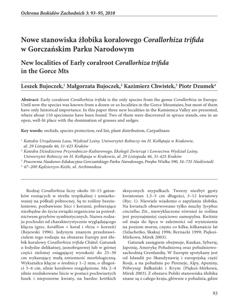 Ochrona Beskidów Zachodnich 3: 93–95, 2010 Nowe stanowiska żłobika koralowego Corallorhiza trifida w Gorczańskim Parku Narodowym New localities of Early coralroot Corallorhiza trifida in the Gorce Mts Leszek Bujoczek,1 Małgorzata Bujoczek,2 Kazimierz Chwistek,3 Piotr Dzumek4 Abstract: Early coralroot Corallorhiza trifida is the only species from the genus Corallorhiza in Europe. Until now the species was known from a dozen or so localities in the Gorce Mountains, but most of them have only historical importance. In this paper three new localities in the Kamienica Valley are presented, where about 110 specimens have been found. Two of them were discovered in spruce stands, one in an open, well-lit place with the domination of grasses and sedges. Key words: orchids, species protection, red list, plant distribution, Carpathians 1 Katedra Urządzania Lasu, Wydział Leśny, Uniwersytet Rolniczy im H. Kołłątaja w Krakowie, al. 29 Listopada 46, 31-425 Kraków 2 Katedra Dziedzictwa Przyrodniczo-Kulturowego, Ekologii Zwierząt i Łowiectwa Wydział Leśny, Uniwersytet Rolniczy im H. Kołłątaja w Krakowie, al. 29 Listopada 46, 31-425 Kraków 3 Pracownia Naukowo-Edukacyjna Gorczańskiego Parku Narodowego, Poręba Wielka 590, 34–735 Niedźwiedź 4 47–200 Kędzierzyn-Koźle, ul. Archimedesa Rodzaj Corallorhiza liczy około 10–15 gatunków rosnących w strefie tropikalnej i umiarkowanej na półkuli północnej. Są to rośliny bezzieleniowe, pozbawione liści i korzeni, pobierające niezbędne do życia związki organiczne za pośrednictwem grzybów symbiotycznych. Nazwa rodzaju pochodzi od charakterystycznie wyglądającego kłącza (grec. korállion = koral i rhiza = korzeń) (Rejewski 1996). Jedynym znanym przedstawicielem tego rodzaju na obszarze Europy jest żłobik koralowy Corallorhiza trifida Châtel. Gatunek o łodydze delikatnej, jasnobrązowej lub w górnej części zielonej osiągającej wysokość do 25–30 cm wykazujący małą zmienność morfologiczną. Wykształca kłącze o średnicy 1–2 mm, o długości 3–6 cm, silnie koralowo rozgałęzione. Ma 2–4 silnie zredukowane liście w postaci pochwiastych łusek i niepozorne kwiaty, na bardzo krótkich skręconych szypułkach. Tworzy niezbyt gęsty kwiatostan 1,5–5 cm długości, 3–12 kwiatowy (Ryc. 1). Niewiele wiadomo o zapylaniu żłobika. Na kwiatach obserwowano tylko muchy Syrphus cinctellus Ztt., niewykluczone również że roślina jest przynajmniej częściowo samopylna. Kwitnie od maja do lipca w zależności od wyniesienia na poziom morza, często co kilka, kilkanaście lat (Szlachetko, Skakuj 1996; Bernacki 1999; PiękośMirkowa, Mirek 2003). Gatunek zasięgiem obejmuje, Kaukaz, Syberię, Japonię, Amerykę Południową oraz południowozachodnią Grenlandię. W Europie spotykany jest od Islandii po Skandynawię i europejską część Rosji, a na południu po Pireneje, Alpy, Apeniny, Półwysep Bałkański i Krym (Piękoś-Mirkowa, Mirek 2003). Z obszaru Polski stanowiska żłobika znane są z całego kraju, głównie z południa, gdzie 93 Ochrona Beskidów Zachodnich 3: 93–95, 2010 Ryc. 1. Żłobik koralowy Corallorhiza trifida: a – kłącze, b – kwiatostan, c – owocostan. Fig. 1. Early coralroot Corallorhiza trifida: a – rhizome, b – inflorescence, c – fructification. Ryc. 2. Rozmieszczenie żłobika koralowego Corallorhiza trifida w Polsce (wg Szlachetko 2001). ! – położenie Gorców. Fig. 2. Distribution of Early coralroot Corallorhiza trifida in Poland (see Szlachetko 2001). ! – geographic position of the Gorce Mts. 94 występuje po regiel górny, poza tym większe skupiska zlokalizowane są na Pojezierzu Mazurskim i Wyżynie Krakowsko-Częstochowskiej (Ryc. 2.) (Szlachetko 2001; Piękoś-Mirkowa, Mirek 2003). Żłobik objęty jest w Polsce ochroną ścisłą, ujęty także na polskiej „czerwonej liście” gatunków narażonych na wyginięcie (Piękoś-Mirkowa, Mirek 2003). Występuje w żyznych lasach bukowych, jak również na torfowiskach i w widnych lasach sosnowych. W górach najczęściej występuje w jedlinach i świerczynach, na ogół w miejscach silnie ocienionych. Preferuje gleby świeże lub wilgotne (brunatne, bielicowe, rędziny) o odczynie silnie kwaśnym aż do zasadowego, z głębokim poziomem próchniczym lub butwinowym. Jest gatunkiem charakterystycznym dla borów świerkowych i jodłowych ze związku Piceion abietis (Szlachetko, Skakuj 1996; Piękoś-Mirkowa, Mirek 2003). Badania florystyczne Gorców prowadzone przez Jana Kornasia w latach 1948–1955 oraz zebrane istniejące dane literaturowe do tego okresu wykazały na ich obszarze obecność 13 stanowisk żłobika – 10 w odcinku geobotanicznym Turbacza i 3 w odcinku Lubania (Kornaś 1957). Występował głównie w reglu dolnym, w cienistych lasach jodłowych i świerkowych (także w sztucznych świerczynach), rzadziej w buczynach. Najniżej odnotowane stanowisko żłobika położone było w Dolinie Kamienicy (765 m n.p.m.), z kolei najwyżej – przy źródliskach Lepietnicy pod szczytem Turbacza od zachodniej strony (1165 m n.p.m.). Jest to jedyne stanowisko podawane z regla górnego. Większość stanowisk stwierdzono wówczas w górnej części regla dolnego (800–1150 m n.p.m.). W uzupełnieniu do powyższej pracy Kornaś (1963) podał jeszcze jedno zlokalizowane w Dolinie Łopusznej. Współcześnie, Kozak (2007) donosi o kolejnych dwóch stanowiskach żłobika. Pierwsze z nich obejmuje kilkanaście osobników w młodniku świerkowym w górnej części Doliny Kamienicy na wysokości 1030 m n.p.m., drugie – kilkadziesiąt osobników w buczynie karpackiej na 1090 m n.p.m. w Dolinie Łopusznej. Stanowiska, o których informujemy w niniejszej pracy zlokalizowano w Dolinie Kamienicy w sąsiedztwie przełęczy Borek. Stwierdzono trzy nowe miejsca występowania żłobika pomiędzy opisywanymi z doliny Kamienicy przez Kornasia (1957) i Kozaka (2007). Leszek Bujoczek, Małgorzata Bujoczek, Kazimierz 