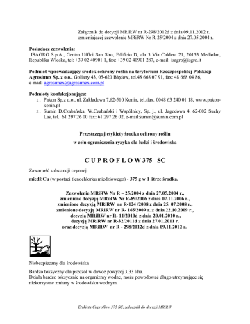 Załącznik do decyzji MRiRW nr R-298/2012d z dnia 09.11.2012 r. zmieniającej zezwolenie MRiRW Nr R-25/2004 z dnia 27.05.2004 r. Posiadacz zezwolenia: ISAGRO S.p.A., Centro Uffici San Siro, Edificio D, ala 3 Via Caldera 21, 20153 Mediolan, Republika Włoska, tel: +39 02 40901 1, fax: +39 02 40901 287, e-mail: [email protected] Podmiot wprowadzający środek ochrony roślin na terytorium Rzeczpospolitej Polskiej: Agrosimex Sp. z o.o., Goliany 43, 05-620 Błędów, tel.48 668 07 91, fax: 48 668 04 86, e-mail: [email protected] Podmioty konfekcjonujące: 1. Pakon Sp.z o.o., ul. Zakładowa 7,62-510 Konin, tel./fax. 0048 63 240 01 18, www.pakonkonin.pl 2. Sumin D.Czabańska, W.Czabański i Wspólnicy, Sp. j., ul. Jagodowa 4, 62-002 Suchy Las, tel.: 61 297 26 00 fax: 61 297 26 02, e-mail:[email protected] Przestrzegaj etykiety środka ochrony roślin w celu ograniczenia ryzyka dla ludzi i środowiska C U P R O F L O W 375 SC Zawartość substancji czynnej: miedź Cu (w postaci tlenochlorku miedziowego) - 375 g w 1 litrze środka. Zezwolenie MRiRW Nr R – 25/2004 z dnia 27.05.2004 r., zmienione decyzją MRiRW Nr R-89/2006 z dnia 07.11.2006 r., zmienione decyzją MRiRW nr R-124 /2008 z dnia 25. 07.2008 r., zmienione decyzją MRiRW nr R- 165/2009 r. z dnia 22.10.2009 r., decyzją MRiRW nr R- 11/2010d z dnia 20.01.2010 r., decyzją MRiRW nr R-32/2011d z dnia 27.01.2011 r. oraz decyzją MRiRW nr R - 298/2012d z dnia 09.11.2012 r. Niebezpieczny dla środowiska Bardzo toksyczny dla pszczół w dawce powyżej 3,33 l/ha. Działa bardzo toksycznie na organizmy wodne, może powodować długo utrzymujące się niekorzystne zmiany w środowisku wodnym. Etykieta Cuproflow 375 SC, załącznik do decyzji MRiRW UWAGA! 1. Zabrania się stosowania środka w strefie bezpośredniej ochrony ujęć wody oraz na terenie uzdrowisk, otulin parków narodowych i rezerwatów. 2. Nie zanieczyszczać wód środkiem ochrony roślin lub jego opakowaniem. I OPIS DZIAŁANIA Cuproflow 375 SC jest środkiem grzybobójczym w formie koncentratu w postaci stężonej zawiesiny do rozcieńczania wodą o działaniu kontaktowym do stosowania zapobiegawczego w ochronie ziemniaka przed zarazą ziemniaka oraz w ochronie roślin sadowniczych przed chorobami grzybowymi i bakteryjnymi. II ZAKRES STOSOWANIA, TERMINY I DAWKI 1. ROŚLINY ROLNICZE A) ZIEMNIAK zaraza ziemniaka Zalecana dawka: 2,5 – 3,5 l/ha. Zalecana ilość wody: 200-400 l/ha. Zalecane opryskiwanie: drobnokropliste. Wyższą dawkę środka i wody stosować przy dużym nasileniu choroby lub w przypadku silnie wyrośniętej naci ziemniaczanej. Po wykonaniu pierwszego zabiegu środkiem o działaniu systemicznym lub wgłębnym Cuproflow 375 SC stosować przemiennie z innymi fungicydami o działaniu kontaktowym. 2. ROŚLINY SADOWNICZE A) JABŁOŃ parch jabłoni. Zalecana dawka: 1,5-2 l/ha. Wykonać 1-2 zabiegi w sezonie. Ze względu na możliwość spowodowania oparzeń środek stosować tylko do fazy różowego pąka. B) GRUSZA parch gruszy Zalecana dawka: 1,5-2 l/ha. Ze względu na możliwość spowodowania oparzeń środek stosować tylko do początku kwitnienia. Wykonać 1-2 zabiegi w sezonie. C) JABŁOŃ, GRUSZA Etykieta Cuproflow 375 SC, załącznik do decyzji MRiRW zaraza ogniowa Zalecane dawki: − jabłoń – 1,5 l/ha. − grusza - 2 l/ha. Środek stosować w okresie nabrzmiewania pąków i kwitnienia. Zalecana ilość wody: 500-750 l/ha. Opryskiwać do całkowitego zwilżenia liści i pędów. D) WIŚNIA, CZEREŚNIA rak bakteryjny drzew pestkowych Zalecane dawki: − w okresie nabrzmiewania pąków i opadania liści – 3 l/ha, − w okresie kwitnienia – 2l/ha. Zalecana ilość wody: 500-750 l/ha. Środek stosować w okresie nabrzmiewania pąków i w fazie opadania liści oraz 1-2 razy w okresie kwitnienia w zależności od warunków meteorologicznych, opryskując korony drzew do całkowitego ich zwilżenia. E) BRZOSKWINIA kędzierzawość liści Zalecane stężenie – 1,0 % (1000 ml środka w 100 litrach wody). Zalecana ilość wody: 700 l/ha. Stosować w okresie bezlistnym przed rozpoczęciem wegetacji. UWAGA! W przypadku stosowania środka w dawce powyżej 3,33 l/ha (tj. uprawa ziemniaka) lub w stężeniu 1% (tj. uprawa brzoskwini): W celu ochrony pszczół i innych owadów zapylających nie stosować środka: − na rośliny uprawne w czasie kwitnienia, − kiedy na uprawie chronionej występują kwitnące chwasty, − w miejscach gdzie pszczoły mają pożytek, a także na roślinach, których kwitnienie może rozpocząć się przed upływem okresu prewencji. III OKRES KARENCJI okres od dnia ostatniego zabiegu do dnia zbioru roślin przeznaczonych do konsumpcji ZIEMNIAK – 7 DNI JABŁOŃ, GRUSZA, WIŚNIA, CZEREŚNIA, BRZOSKWINIA- NIE DOTYCZY IV OKRES PREWENCJI DLA PSZCZÓŁ okres zapobiegający zatruciu W przypadku stosowania środka w dawce powyżej 3,33 l/ha (ziemniak, brzoskwinia) – 30 DNI V OKRES PREWENCJI DLA LUDZI I ZWIERZĄT okres zapobiegający zatruciu Etykieta Cuproflow 375 SC, załącznik do decyzji MRiRW NIE DOTYCZY VI SPORZĄDZANIE CIECZY UŻYTKOWEJ Przed przystąpieniem do sporządzania cieczy użytkowej dokładnie ustalić potrzebną jej ilość. Zawartością opakowania przed użyciem wstrząsnąć. Odmierzoną ilość środka wlać do zbiornika opryskiwacza napełnionego częściowo wodą (z włączonym mieszadłem) i uzupełnić wodą do potrzebnej ilości. Opryskiwać z włączonym mieszadłem. Po wlaniu środka do zbiornika opryskiwacza nie wyposażonego w mieszadło hydrauliczne ciecz mechaniczne wymieszać. Opróżnione opakowania przepłukać trzykrotnie wodą, a popłuczyny wlać do zbiornika opryskiwacza z cieczą użytkową. Po pracy aparaturę dokładnie wymyć. VII PRZECHOWYWANIE Magazynować w suchych i chłodnych miejscach, w pomieszczeniach prawidłowo wentylowanych, wyłącznie w oryginalnym opakowaniu w temperaturze nie niższej niż 0 oC i nie wyższej niż 30oC. Chronić przed dziećmi. Nie przechowywać razem z żywnością