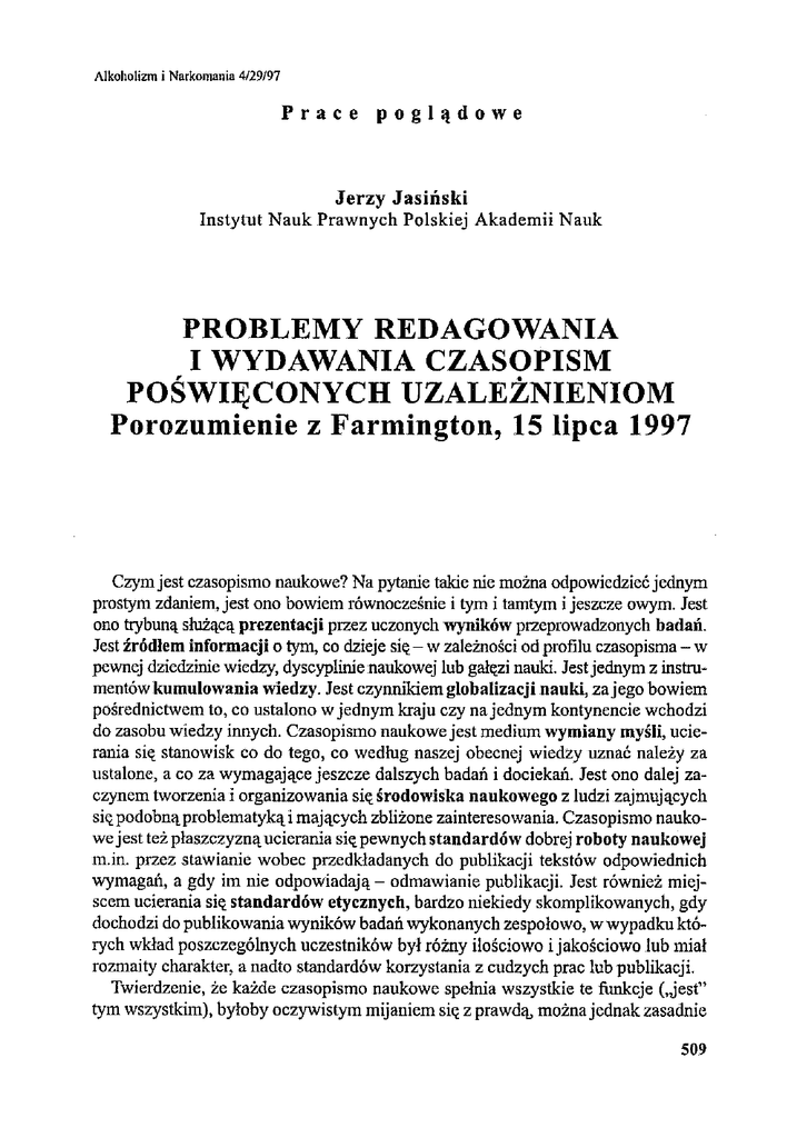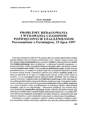 Alkoholizm i Narkomania 4129/97 Prace poglądowe Jerzy Jasiński Instytut Nauk Prawnych Polskiej Akademii Nauk PROBLEMY REDAGOWANIA I WYDAWANIA CZASOPISM POŚWIĘCONYCH UZALEŻNIENIOM Porozumienie z Farmington, 15 lipca 1997 Czym jest czasopismo naukowe? Na pytanie takie nie można odpowiedzieć jednym prostym zdaniem, jest ono bowiem równocześnie i tym i tamtym i jeszcze owym. Jest ono trybuną służącą prezentacji przez uczonych wyników przeprowadzonych badań. Jest źródłem informacji o tym, co dzieje się - w zależności od profilu czasopisma - w pewnej dziedzinie wiedzy, dyscyplinie naukowej lub galęzi nauki. Jest jednym z iostrumentów kumulowania wiedzy. Jest czynnikiem globalizacji nanki, za jego bowiem pośrednictwem to, co ustalono w jednym kraju czy na jednym kontynencie wchodzi do zasobu wiedzy innych. Czasopismo naukowe jest medium wymiany myśli, ucierania się stanowisk co do tego, co według naszej obecnej wiedzy uznać należy za ustalone, a co za wymagające jeszcze dalszych badań i dociekań. Jest ono dalej zaczynem tworzenia i organizowania się środowiska naukowego z ludzi zajmujących się podobną problematyką i mających zbliżone zainteresowania. Czasopismo naukowe jest też płaszczyzną ucierania się pewnych standardów dobrej roboty uaukowej m.in przez stawianie wobec przedkladanych do publikacji tekstów odpowiednich wymagań, a gdy im nie odpowiadają - odmawianie publikacji. Jest również miejscem ucierania się standardów etycznych, bardzo niekiedy skomplikowanych, gdy dochodzi do publikowania wyników badań wykonanych zespołowo, w wypadku których wklad poszczególnych uczestników był różny ilościowo i jakościowo lub miał rozmaity charakter, a nadto standardów korzystania z cudzych prac lub publikacji. Twierdzenie, że każde czasopismo naukowe spełnia wszystkie te funkcje (,jest" tym wszystkim), byłoby oczywistym mijaniem się z prawdą, można jednak zasadnie 509 Jerzy Jasiński twierdzić, że każde powinno aspirować i dążyć do wypełniania przynajmniej części z nich i w jakimś stopniu brać pod uwagę w swojej codziennej pracy potrzebę ich promowania. Użyte słowo ,jest" odnosi się więc do pewnego modelu "idealnego" czasopisma naukowego. Ze względu na wymienione wyżej cechy czasopisma poświęcone uzależnieniom nie mająjakiejś specyfiki, można powiedzieć, że dzielą problemy związane z redagowaniem i wydawaniem z innymi czasopismami zwłaszcza takimi, które poświęco ne sąjakiejś dziedzinie, nie tylko że nie pokrywającej się z żadną dyscypliną akademicką ani jej fragmentem, ale przeciwnie - idącej w poprzek podziałów na te dyscypliny. Równocześnie, redaktorzy czasopism związanych z problematyką uzależnień odczuwają, jak się okazało, potrzebę spotkania się w celu wspólnego zastanowienia się nad tym, jak wykonywać swą pracęl. Trzeba mieć świadomość, że czasopisma nie sąjedynym miejscem publikowania prac poświęconych uzależnieniom. Są przecież również książki, broszury, raporty z badań, zbiory referatów ze zjazdów, konferencji i sympozjów, różnego rodzaju urzę dowe publikacje. Nie jest też tak, że prace z dziedziny uzależnień ukazują się wyłącznie lub nawet przede wszystkim w czasopismach specjalistycznych. T. F. Babor w latach dziewięćdziesiątych poddał analizie bibliografie prac poświęconych uzależ nieniom wydawane przez 12 wylosowanych ośrodków badawczych (6 ze Stanów Zjednoczonych i 6 z innych krajów). Na odnotowanych w nich 700 artykułów o uzależnieniach: 40% zamieszczonych było w specjalistycznycb czasopismach im poświęconych, 50% w czasopismach farmakologicznych i 10% w czasopismzch związanych z poszczególnymi dyscyplinami naukowymi (2). Spośród 29 wymienionych przez tego autora specjalistycznych czasopism z dziedziny uzależnień, które ukazywać się poczęły w tym stuleciu, tylko jedno przestało wychodzić; godne większej uwagi jest jednak to, że aż 20 spośród nich poczęło wychodzić między 1971 a 1991 rokiem (2). W jednym tylko czasopiśmie, Addiction (ukazującym się początkowo jako The British Journal oflnebriety, a następnie jako The British Journal ofAddiction), do połowy lat siedemdziesiątych rocznie publikowano po 100-120 stron, w następnym dwudziestoleciu po ok. 300, zaś w ciągu ostat[Wyrazem tej potrzeby było zorganizowanie z inicjatywy G. Edwardsa, redaktora naczelnego czasopisma Addiction, rnht.dzynarodowej konferencji: Journal editing in tlle addictions: International Meeling. 14-15 VII 1997. Fannington, Conn., USA. W związku z tą konferencją napisany jest niniejszy artykuł. Owocem tej konferencji było przyjęcie tzw. Porozumienia z Fannington, które zamieszczone jest na końcu artykuhl. Wzięło w niej udział 36 osób, będących przedstawicielami gospodarzy i 21 czasopism, z których I było ogólnolekarskie (Journa/ o[the Americlfll Medka/ Association), zaś 20 ~ poświęconych uzależnie niom, Wśród nich, poza jednym o charakterze międzynarodowym (Addiction), przeważały czsopisma północnoamerykańskie (z USA: Addiction Research, A/cohol, A/coholism Treatl11et Quarterly, Drug and A/cohol Dependence, Journal o[ Addictive Dt:"eases, Jow'nal oj Drugs Education, Jow'nal oj Psychoactive Dmgs, Journa/ o[ Studies on A/cohol, Tobacco Contro!), z Kanady: Contemporaly Drug Problems), następnie były europejskie (z Francji: A/coologie; z Polski: Alkoholizm i Narkomania; z Portugalii: Toxicodependencias; z Wielkiej Brytanii:Addiction Bi%gy, Alcoho/ and A/collOlism, Drngs: education, prevclItioll and policy, fournal oj Substallce Misuse; z Włoch: Alcologia) oraz jedno z Australii (Drug and A/coho! Review), Na tych 20 czasopism tylko 4 nie były anglojęzyczne, 510 Problemy redagowania i wydawania czasopism poświęconych uzależnieniom nich kilku lat po ponad 1700 stron rocznie (3). Można więc powiedzieć, że przynajmniej w sensie ilościowym problem wydawania i redagowania cz