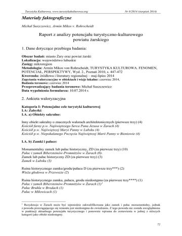 Nr 8/2014 (sierpień 2014) Turystyka Kulturowa, www.turystykakulturowa.org Materiały faktograficzne Michał Suszczewicz, Armin Mikos v. Rohrscheidt Raport z analizy potencjału turystyczno-kulturowego powiatu żarskiego 1. Dane dotyczące przebiegu badania: Obszar badań: miasto Żary oraz powiat żarski Lokalizacja: województwo lubuskie Zasięg: mikroregion Metodologia: Armin Mikos von Rohrscheidt, TURYSTYKA KULTUROWA. FENOMEN, POTENCJAŁ, PERSPEKTYWY, Wyd. 2., Poznań 2010, s. 447-472 Kwerenda: źródłowa i literatury regionalnej – maj-lipiec 2014 Zapytania waloryzacyjne w obiektach i wizje lokalne: czerwiec 2014, Badania terenowe: czerwiec 2014 Przeprowadzający badania terenowe: Michał Suszczewicz Data wypełnienia formularza: 10.07.2014 r. 2. Ankieta waloryzacyjna Kategoria I: Potencjalne cele turystyki kulturowej I.A: Zabytki: I.A. a) Obiekty sakralne: Inny obiekt sakralny o znacznych walorach architektonicznych (pierwsze trzy) (4) Kościół farny p.w. Najświętszego Serca Pana Jezusa w Żarach (4) Kościół p.w. Najświętszej Maryi Panny w Lubsku (4) Kościół p.w. Niepokalanego Poczęcia Najświętszej Marii Panny w Bieniowie (4) I.A. b) Zamki i pałace: Monumentalny zamek lub pałac historyczny, ZD (za pierwsze trzy) (10) Pałac i zamek Bibersteinów-Promnitzów w Żarach (0) Zamek lub pałac historyczny ZD (za pierwsze trzy) (3) Zamek w Lubsku (3) 1 Ruina historycznego zamku/grodu/pałacu D (za pierwsze trzy***) (2) Wieża głodowa w Przewozie (2) Ruina historycznego zamku, pałacu, grodu niedostępna (za pierwsze trzy****) (1) Pałac i zamek Bibersteinów-Promnitzów w Żarach (1)1 Pałac Bruhla w Brodach (1) Pałac w Miłowicach (1) Rezydencja w Żarach może być wprawdzie zakwalifikowana jako zamek i pałac monumentalny, jednak z powodu przeciągającego się remontu jest niedostępna do zwiedzania. Z tego powodu nie została uwzględniona w punktacji aktualnego potencjału turystycznego i ponownie wpisana do zestawienia w jednej z niższych kategorii jako obiekt niedostępny. 1 72 Turystyka Kulturowa, www.turystykakulturowa.org Nr 8/2014 (sierpień 2014) I.A. c) Inne zabytkowe obiekty architektoniczne i techniczne: Historyczny zespół urbanistyczny z rynkiem, zachowany we fragmentach (pierwsze dwa) (3) Układ staromiejski w Żarach (3) Układ staromiejski w Lubsku (3) Historyczne fortyfikacje miejskie zachowane z znacznej części ZD (4) Mury miejskie w Żarach (4) Znaczne fragmenty historycznych fortyfikacji miejskich (2) Mury miejskie w Przewozie (2) Ruiny fortyfikacji miejskich (1) Ruiny fragmentów murów miejskich w Trzebielu (1) Pojedyncze zabytki związane z dziejami innych grup etnicznych ZD (za pierwsze dwa*) (4) Budynki mieszkalne dolnołużyckiej grupy etnicznej w Jasionnie (4) Historyczna funkcjonująca sezonowo lub nieregularnie linia kolejowa lub żeglugowa (lub przystanki pośrednie linii stałej) (za pierwszy przystanek** 4) "Berlinka" - linia kolejowa Berlin-Wrocław, przystanek - stacja Żary (4) I.A. d) Obiekty militarne: Pojedyncze obiekty forteczne częściowo dostępne, ruiny fortec (pierwsze dwie****) (1) Wieża Rycerska w Trzebielu (1) Dodatkowe punkty za obiekty dziedzictwa kulturowego: Obiekt Dziedzictwa Kulturowego o znaczeniu międzynarodowym ZD: UNESCO (dodatkowo 30), Park Mużakowski w Łęknicy (obiekt transgraniczny, częściowo na terytorium RP i powiatu żarskiego (30) Dodatkowe punkty za wszystkie miejsca lub obiekty wpisanych powyżej klas: Za stałych przewodników miejskich oprowadzających po obiektach lub przewodników obiektowych w j. polskim (za pierwsze pięć) (po 2 pkt) Przewodnicy miejscy w Żarach (2) Przewodnicy Parku Mużakowskiego w Łęknicy (2) Przewodnik po parku i pałacu w Brodach (2) Własny materiał informacyjny w obiekcie, jak publikacje monograficzne, albumy (za pierwsze trzy obiekty) (1 pkt), Park Mużakowski (1) Własny materiał informacyjny w obiekcie w językach obcych (przynajmniej dwóch) w pierwszych trzech obiektach (1 pkt) Park Mużakowski - en, de (1) 73 Turystyka Kulturowa, www.turystykakulturowa.org Nr 8/2014 (sierpień 2014) Za bardzo dobry (2) lub dobry (1) stan konserwacji i estetyki najważniejszych trzech obiektów (element uznaniowy) można doliczyć w sumie od 1 do 2 punktów dla całego regionu). Za stan zachowania + 1 pkt I.B. Miejsca historyczne lub znaczące: I.B. a) Budowle historyczne i monumenty: Monumenty (pomniki) o znaczeniu regionalnym (do trzech) (2) Pomnik G. P. Telemana w Żarach (2) Pomnik Hermanna Pücklera w Łęknicy (2) Pomnik "Woodstockowa fontanna“ w Żarach (2) Pomniki lub obiekty małej architektury o znaczeniu lokalnym (do trzech****) (1) Żarska kaczarka (0) Fontanna tkaczy w Żarach (0) Pomnik 15 południka w Jasieniu (0) Miejsca związane z biografią osób o międzynarodowym znaczeniu (pierwsze trzy) (3) Miejsce zamieszkania G. Domagka (laureata nagrody Nobla z medycyny) w Lubsku (3) Miejsce działalności Waltera Hemana Nernsta (laureata nagrody Nobla z chemii) w Niwicy (3) Miejsca związane z biografią osób o krajowym znaczeniu (do trzech) ZD (2) Miejsce działalności G. P. Telemana w Żarach (2) Posiadłość Hermanna von Pückler-Muskau w Mużakowie (Łęknicy) (2) Miejsca związane z biografią osób o regionalnym znaczeniu (pierwsze dwa) (1) Miejsce urodzenia Jana Benedykta Solfy - lekarza Jagiellonów w Trzebielu (1) Miejsce działalności Wolfganga C. Prinza - teoretyka i muzyka barokowego w Trzebielu (1) Miejsca związane z biografią osób innej narodowości, ważnych w skali krajowej dla tych narodowości (za pierwsze dwa) (2) Jan Rak - poeta serbołużycki - miejsce urodzenia w Lubsku (2) Mikołaj Jakubica - duchowny, tłumacz Nowy Testament na język serbo-łuzycki - miejsce działalności w Lubanicach (2) I.B. b) Cmentarze historyczne Brak w powiecie I.B. c) Budowle współczesne Brak w powiecie I.C) Pojedyncze dzieła sztuki: Brak w powiecie I.D. Muzea i wystawy (w tym skanseny, galerie, muzea techniki) Muzea o znaczeniu lokalnym (do t