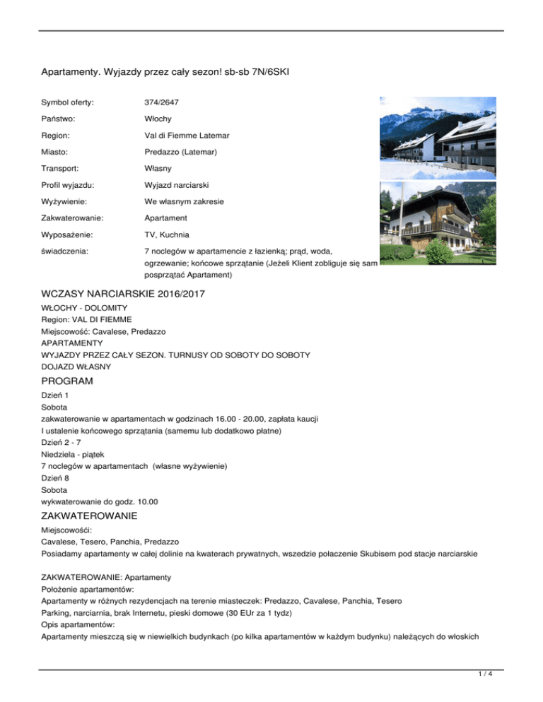 Apartamenty. Wyjazdy przez cały sezon! sb