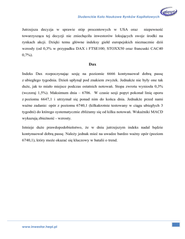 Studenckie Koło Naukowe Rynków Kapitałowych Jutrzejsza decyzja w sprawie stóp procentowych w USA oraz niepewność towarzysząca tej decyzji nie zniechęciła inwestorów lokujących swoje środki na rynkach akcji. Dzięki temu główne indeksy giełd europejskich nieznacznie dziś wzrosły (od 0,3% w przypadku DAX i FTSE100; STOXX50 oraz francuski CAC40 0,7%). Dax Indeks Dax rozpoczynając sesję na poziomie 6666 kontynuował dobrą passę z ubiegłego tygodnia. Dzień upłynął pod znakiem zwyżek. Jednakże nie były one tak duże, jak to miało miejsce podczas ostatnich notowań. Stopa zwrotu wyniosła 0,3% (wczoraj 1,5%). Maksimum dnia – 6706. W czasie sesji popyt pokonał linię oporu z poziomu 6647,1 i utrzymał się ponad nim do końca dnia. Jednakże przed nami ważne zadanie: opór z poziomu 6740,1 (kilkakrotnie testowany w ciągu ubiegłych 3 tygodni) do którego systematycznie zbliżamy się od kilku notowań. Wskaźniki MACD wykazują zbieżność - wzrosty. Istnieje duże prawdopodobieństwo, że w dniu jutrzejszym indeks nadal będzie kontynuował dobrą passę. Należy jednak mieć na uwadze bardzo ważny opór (poziom 6740,1), który może okazać się kluczowy w batalii o trend. www.inwestor.hepi.pl 8 Studenckie Koło Naukowe Rynków Kapitałowych www.inwestor.hepi.pl 8 Studenckie Koło Naukowe Rynków Kapitałowych Stoxx50 Indeks rozpoczął dzień na poziomie 4055 tworząc kolejną lukę wzrostową w stosunku do ceny zamknięcia dnia wczorajszego. Indeksem, który reprezentuje 50 największych spółek strefy Euro rządziły byki. Stopa zwrotu wyniosła 0,7%. Indeks zakończył dzień, gdy dotarł do poziomu 4081, który był równocześnie dzisiejszym maksimum. W czasie jutrzejszej sesji należy szczególnie zwrócić uwagę na poziom 4015,6 (który jest początkiem luki spadkowej z 14 marca). Będzie on dla nas bardzo ważnym wsparciem w czasie jutrzejszych notowań. Wartym uwagi będzie także poziom 4109,8 (widoczny na wykresie intraday) stanowiący silny opór. Wskaźniki MACD wykazują zbieżność – wzrosty. Istnieje duże prawdopodobieństwo, że w dniu jutrzejszym dojdzie do kolejnych wzrostów a celem kolejnych notowań stanie się walka pomiędzy popytem a podażą o poziom 4109,8. www.inwestor.hepi.pl 8 Studenckie Koło Naukowe Rynków Kapitałowych Obligacje dane z godziny 19:00 Dzisiejszy dzień na rynku obligacji upłynął pod znakiem niewielkich spadków rentowności. Jedynie w przypadku 3 miesięcznych bonów skarbowych zanotowano 5 punktowy wzrost ich dochodowości w stosunku do dnia wczorajszego. Jednakże www.inwestor.hepi.pl 8 Studenckie Koło Naukowe Rynków Kapitałowych porównując ich rentowność z rentownością sprzed miesiąca mamy do czynienia z sytuacją korzystną, bowiem nastąpił jej 13 punktowy spadek. Od dłuższego czasu największe spadki rentowności odnotowywano na obligacjach o dwuletnim terminie wykupu. W dniu dzisiejszym spadek ten wyniósł on 22 punkty bazowe w stosunku do sytuacji jaka miała miejsce w ubiegłym miesiącu. Z kolei porównując rentowność w dniu dzisiejszym z wczorajszą zanotowany został jej spadek o 2 punkty bazowe. Drugimi, co do atrakcyjności obligacjami są te o 3 letnim terminie wykupu. Zanotowano w ich przypadku spadek rentowności o 19 punktów bazowych w stosunku do ostatniego miesiąca. W dni dzisiejszym również nastąpił spadek ich dochodowości (o 3 punkty w stosunku do dnia wczorajszego). Obligacje 10-cio letnie również od miesiąca odnotowywały spadki dochodowości. Taka sytuacja miała miejsce i dzisiaj, kiedy to spadek rentowności wyniósł 1 punkt bazowy. Graficzny obraz danych tabelarycznych przedstawiają poniższe wykresy. www.inwestor.hepi.pl 8 Studenckie Koło Naukowe Rynków Kapitałowych www.inwestor.hepi.pl 8 Studenckie Koło Naukowe Rynków Kapitałowych W przypadku krzywej dochodowości nadal obserwujemy jej opadanie. Jednakże porównując sytuację na przestrzeni tygodnia możemy zauważyć, iż opadanie to jest coraz łagodniejsze. Obniżanie to jest nierównoległe (lewa część krzywej opada podczas gdy prawa część wzrasta). Sytuacja taka prowadzi do spłaszczania krzywej dochodowości, która może wynikać z występowania oczekiwań inwestorów na obniżenie stóp procentowych. Do najbardziej atrakcyjnych obligacji wciąż należą te z przedziału 2 – 5 lat, gdzie od pewnego czasu odnotowuje się największe spadki ich rentowności. www.inwestor.hepi.pl 8 Studenckie Koło Naukowe Rynków Kapitałowych Kontrakty terminowe FRA Dane z godziny 20:00 Krótkoterminowa stopa procentowa w USA wynosi obecnie 525 punktów bazowych. Różnica pomiędzy krótkoterminową stopa procentową a kontraktami FRA w dniu dzisiejszym wyniosła 43 punkty bazowe. Jednakże porównując sytuację na przestrzeni dwóch ostatnich dni nastąpił wzrost rentowności kontraktów FRA 11x12 o 8 punktów bazowych. Sytuacja taka zapewne zmartwiła inwestorów zarabiających na rynkach obligacji, którzy spodziewali się dalszych spadków rentowności. Europejska krótkoterminowa stopa procentowa wynosząca obecnie 375 punktów bazowych jest niższa od kontraktów terminowych FRA z dnia dzisiejszego o 32 punkty bazowe. Od dnia wczorajszego nastąpił wzrost rentowności kontraktów terminowych FRA 11x12 o 2 punkty bazowe. W przypadku obligacji na rynku polskim również odnotowano wzrost dochodowości kontraktów terminowych o 1 punkt bazowy w stosunku do dnia wczorajszego. Krótkoterminowa stopa procentowa w Polsce wynosząca obecnie 400 punktów bazowych jest niższa od kontraktów terminowych FRA 9x12 o 73 punkty bazowe. Jest to negatywna informacja dla inwestorów ze względu na występującą między nimi różnicę in plus. www.inwestor.hepi.pl 8 Studenckie Koło Naukowe Rynków Kapitałowych www.inwestor.hepi.pl 8 Studenckie Koło Naukowe Rynków Kapitałowych W Europie (również w Polsce) krótkoterminowa stopa procentowa jest niższa aniżeli oprocentowanie kontraktó