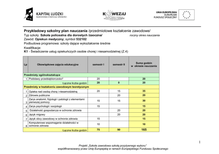 Przykładowy szkolny plan nauczania /przedmiotowe kształcenie zawodowe/ Typ szkoły: Szkoła policealna dla dorosłych /zaoczna/ roczny okres nauczania Zawód: Opiekun medyczny; symbol 532102 Podbudowa programowa: szkoły dające wykształcenie średnie Kwalifikacje: K1 - Świadczenie usług opiekuńczych osobie chorej i niesamodzielnej (Z.4) Lp Obowiązkowe zajęcia edukacyjne Przedmioty ogólnokształcące 1 Podstawy przedsiębiorczości* Łączna liczba godzin Przedmioty w kształceniu zawodowym teoretycznym 1 Opieka nad osobą chorą i niesamodzielną 2 Zdrowie publiczne Zarys anatomii, fizjologii i patologii z elementami 3 pierwszej pomocy 4 Zarys psychologii i socjologii semestr II 20 20 0 20 20 20 15 35 20 20 15 30 15 Łączna liczba godzin 15 15 5 Działalność gospodarcza w ochronie zdrowia 6 Język migowy 7 Język obcy zawodowy w ochronie zdrowia Komputerowe wspomaganie działalności w 8 ochronie zdrowia Suma godzin w okresie nauczania semestr I 20 20 20 20 15 15 10 10 75 90 165 1 Projekt „Szkoła zawodowa szkołą pozytywnego wyboru” współfinansowany przez Unię Europejską w ramach Europejskiego Funduszu Społecznego Przedmioty w kształceniu zawodowym praktycznym* Zabiegi higieniczne, pielęgnacyjne i opiekuńcze 40 40 80 40 45 85 80 85 165 Łączna liczba godzin kształcenia zawodowego 155 175 330 Semestralny wymiar godzin obowiązkowych zajęć edukacyjnych 175 175 350 1 Działania opiekuńcze nad osobą chorą i 2 niesamodzielną Łączna liczba godzin *prowadzone tylko dla słuchaczy, którzy na wcześniejszym etapie edukacyjnym nie realizowali tego przedmiotu **zajęcia odbywają się w pracowniach szkolnych, warsztatach szkolnych, centrach kształcenia praktycznego oraz u pracodawcy Wymiar praktyk zawodowych tyg. godz. semestr I 2 80 semestr II 2 80 4 160 Razem Egzamin potwierdzający kwalifikację K1 odbywa się pod koniec drugiego semestru. 2 Projekt „Szkoła zawodowa szkołą pozytywnego wyboru” współfinansowany przez Unię Europejską w ramach Europejskiego Funduszu Społecznego Tabela efektów kształcenia Uczeń: Liczba godzin przeznaczona na realizację efektów kształcenia Efekty kształcenia /umiejętności, wiedza oraz kompetencje personalne i społeczne/ Efekty wspólne dla wszystkich zawodów / wspólne dla zawodów w ramach obszaru Z/ kwalifikacje I semestr II semestr Nazwa zajęć edukacyjnych Tabela przyporządkowania poszczególnym przedmiotom efektów kształcenia dla zawodu: Opiekun medyczny; symbol 532102 Opieka nad osobą chorą i niesamodzielną Kształcenie zawodowe teoretyczne (1) przestrzega zasad kultury i etyki; XX (3) przewiduje skutki podejmowanych działań; XX (4) jest otwarty na zmiany; KPS XX (6) aktualizuje wiedzę i doskonali umiejętności zawodowe; XX (8) potrafi ponosić odpowiedzialność za podejmowane działania; XX (1) planuje pracę zespołu w celu wykonania przydzielonych zadań; XX (2) dobiera osoby do wykonania przydzielonych zadań; (3) kieruje wykonaniem przydzielonych zadań; (4) ocenia jakość wykonania przydzielonych zadań; XX OMZ XX XX 3 Projekt „Szkoła zawodowa szkołą pozytywnego wyboru” współfinansowany przez Unię Europejską w ramach Europejskiego Funduszu Społecznego (5) wprowadza rozwiązania techniczne i organizacyjne wpływające na poprawę warunków i jakość pracy; (6) komunikuje się ze współpracownikami; (12) komunikuje się z pacjentem, jego rodziną i grupą społeczną; (22) przestrzega zasad etycznego postępowania w stosunku do pacjentów oraz współpracowników; (7) organizuje stanowisko pracy zgodnie z obowiązującymi wymaganiami ergonomii, przepisami bezpieczeństwa i higieny pracy, ochrony przeciwpożarowej i ochrony środowiska; XX XX PKZ(Z.a) XX XX XX 2 BHP (8) stosuje środki ochrony indywidualnej i zbiorowej podczas wykonywania zadań zawodowych;BHP XX 1(3) wykorzystuje metody i źródła zbierania danych do rozpoznawania problemów i potrzeb osoby chorej i niesamodzielnej; XX 1(4) uczestniczy w rozpoznawaniu problemów i potrzeb osoby chorej i niesamodzielnej; XX 1(5) reaguje na zmieniające się problemy i potrzeby osoby chorej i niesamodzielnej; XX 1(6) rozpoznaje poziom wiedzy, umiejętności, motywacji i możliwości w zakresie samoopieki osoby chorej i niesamodzielnej; XX 3(1) przestrzega zasad, określa cele, wskazania i przeciwwskazania do wykonywania czynności opiekuńczych; 5 Z.4 XX 3(2) planuje i organizuje czynności opiekuńcze nad osobą chorą i niesamodzielną z uwzględnieniem jej stanu zdrowia; XX 3(3) zapewnia higienę i estetyczny wygląd otoczenia osoby chorej i niesamodzielnej; XX 3(4) pomaga osobie chorej i niesamodzielnej w wykonywaniu czynności życia codziennego; XX 3(5) pomaga osobie chorej i niesamodzielnej w użytkowaniu sprzętu ortopedycznego i rehabilitacyjnego; XX 28 4 Projekt „Szkoła zawodowa szkołą pozytywnego wyboru” współfinansowany przez Unię Europejską w ramach Europejskiego Funduszu Społecznego 3(6) aktywizuje osobę chorą i niesamodzielną i organizuje jej czas wolny; XX 3(7) współpracuje z zespołem terapeutycznym i opiekuńczym na rzecz osoby chorej i niesamodzielnej; 3(8) zapewnia bezpieczeństwo fizyczne i psychiczne osobie chorej i niesamodzielnej podczas wykonywania czynności opiekuńczych; XX XX 3(9) pomaga w adaptacji osoby chorej i niesamodzielnej do warunków życia w placówkach ochrony zdrowia oraz pomocy społecznej; XX 3(10) pomaga osobie chorej i niesamodzielnej w adaptacji do zmian związanych z przewlekłą chorobą lub starością; XX 3(11) udziela wsparcia osobie chorej i niesamodzielnej w sytuacjach trudnych; XX 3(12) pomaga osobie chorej i niesamodzielnej w podtrzymywaniu aktywności ruchowej; XX 3(13) przekazuje pielęgniarce informacje o zmianach w stanie zdrowia osoby chorej i niesamodzielnej zaobserwowanych podczas wykonywania czynności opiekuńczych; XX 3(14) przestrzega procedur postępowania ze sprzętem i materiałem podczas wykonywania czynności opiekuńczych nad osobą c