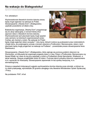 Na wakacje do Białegostoku! http://w w w .w ilnoteka.lt/pl/artykul/na-w akacje-do-bialegostoku June 18, 2012 Fot. wilnoteka.lt Wychowankowie litewskich domów dziecka znowu będą mogli wyjechać na wakacje do Polski. Stowarzyszenie „Otwarty Dom” z Białegostoku uzyskało pozwolenie od władz Litwy. Białostocka organizacja „Otwarty Dom” przygotowuje się do akcji wakacyjnej, w ramach której chce zaprosić dzieci z litewskich domów dziecka. Wychowankowie tych placówek będą mogli spędzić czas zarówno na koloniach organizowanych przez Caritas, jak również u rodzin. Na wakacje do Polski będą mogły wyjechać dzieci powyżej 7. roku życia, których rodzice są pozbawieni praw rodzicielskich. „Dzięki temu, że podpisujemy umowę z domem dziecka w Podbrodziu i Niemenczynie, dzieci z tych placówek będą mogły przyjechać na wakacje na Podlasie” - powiedziała prezes stowarzyszenia Irena Stankiewicz. Stowarzyszenie „Otwarty Dom” z Białegostoku, które zajmuje się pomocą polskim dzieciom na Wschodzie, od kilkunastu lat organizuje przyjazdy dzieci z Litwy. Dzieci z Podbrodzia, Niemenczyna czy Nowej Wilejki na Litwie do tej pory spędzały u rodzin w Podlaskiem Boże Narodzenie, Wielkanoc, a także wakacje. Zawsze przyjeżdżało około 40 dzieci. Podczas takich pobytów dzieciom organizowano m.in. wycieczki do Warszawy. Stowarzyszenie zapewniało im też opiekę medyczną, m.in. stomatologiczną. Zmiany w zasadach dotyczących wyjazdu wychowanków domów dziecka poza ośrodek, w którym na co dzień przebywają, wprowadziło 28 grudnia ubiegłego roku litewskie Ministerstwo Opieki Społecznej i Pracy. Na podstawie: PAP, inf.wł.