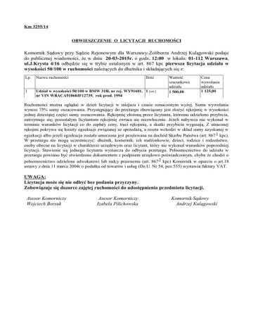 Km 3255/14 OBWIESZCZENIE O LICYTACJI RUCHOMOŚCI Komornik Sądowy przy Sądzie Rejonowym dla Warszawy-Żoliborza Andrzej Kulągowski podaje do publicznej wiadomości, że w dniu 20-03-2015r. o godz. 12:00 w lokalu: 01-112 Warszawa, ul.J.Krysta 4/16 odbędzie się w trybie ustalonym w art. 867 kpc pierwsza licytacja udziału w wysokości 50/100 w ruchomości należących do dłużnika i składających się z: Lp. Nazwa ruchomości Ilość 1 Udział w wysokości 50/100 w BMW 318i, nr rej. WY91601, 1 [szt.] nr VIN WBACA91060JF12739, rok prod. 1994 Wartość szacunkowa udziału 1 500,00 Cena wywołania udziału 1 125,00 Ruchomości można oglądać w dzień licytacji w miejscu i czasie oznaczonym wyżej. Suma wywołania wynosi 75% sumy oszacowania. Przystępujący do przetargu obowiązany jest złożyć rękojmię w wysokości jednej dziesiątej części sumy oszacowania. Rękojmię złożoną przez licytanta, któremu udzielono przybicia, zatrzymuje się; pozostałym licytantom rękojmię zwraca się niezwłocznie. Jeżeli nabywca nie wykonał w terminie warunków licytacji co do zapłaty ceny, traci rękojmię, a skutki przybicia wygasają. Z utraconej rękojmi pokrywa się koszty egzekucji związanej ze sprzedażą, a reszta wchodzi w skład sumy uzyskanej w egzekucji albo jeżeli egzekucja została umorzona jest przelewana na dochód Skarbu Państwa (art. 867 1 kpc). W przetargu nie mogą uczestniczyć: dłużnik, komornik, ich małżonkowie, dzieci, rodzice i rodzeństwo, osoby obecne na licytacji w charakterze urzędowym oraz licytant, który nie wykonał warunków poprzedniej licytacji. Stawienie się jednego licytanta wystarcza do odbycia przetargu. Pełnomocnictwo do udziału w przetargu powinno być stwierdzone dokumentem z podpisem urzędowo poświadczonym, chyba że chodzi o pełnomocnictwo udzielone adwokatowi lub radcy prawnemu (art. 867 2 kpc) Komornik w oparciu o art.18 ustawy z dnia 11 marca 2004r o podatku od towarów i usług (Dz.U. Nr 54, poz.535) wystawia faktury VAT. UWAGA: Licytacja może się nie odbyć bez podania przyczyny. Zobowiązuje się dozorce zajętej ruchomości do udostępnienia przedmiotu licytacji. Asesor Komorniczy Wojciech Borsuk Asesor Komorniczy Izabela Pilichowska Komornik Sądowy Andrzej Kulągowski