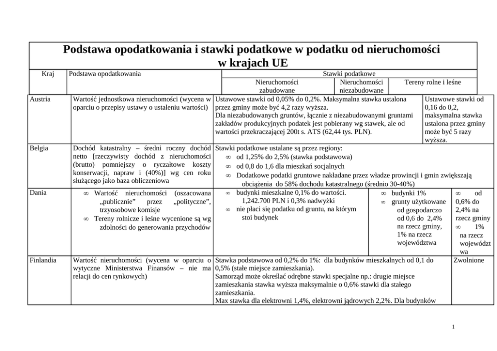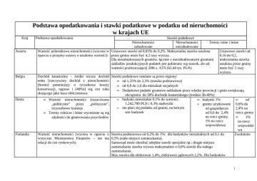 Podstawa opodatkowania i stawki podatkowe w podatku od nieruchomości w krajach UE Kraj Podstawa opodatkowania Austria Wartość jednostkowa nieruchomości (wycena w oparciu o przepisy ustawy o ustaleniu wartości) Belgia Dochód katastralny – średni roczny dochód netto [rzeczywisty dochód z nieruchomości (brutto) pomniejszy o ryczałtowe koszty konserwacji, napraw i (40%)] wg cen roku służącego jako baza obliczeniowa Dania • • Finlandia Wartość nieruchomości (oszacowana „publicznie” przez „polityczne”, trzyosobowe komisje Tereny rolnicze i leśne wycenione są wg zdolności do generowania przychodów Wartość nieruchomości (wycena w oparciu o wytyczne Ministerstwa Finansów – nie ma relacji do cen rynkowych) Stawki podatkowe Nieruchomości Nieruchomości Tereny rolne i leśne zabudowane niezabudowane Ustawowe stawki od 0,05% do 0,2%. Maksymalna stawka ustalona Ustawowe stawki od przez gminy może być 4,2 razy wyższa. 0,16 do 0,2, Dla niezabudowanych gruntów, łącznie z niezabudowanymi gruntami maksymalna stawka zakładów produkcyjnych podatek jest pobierany wg stawek, ale od ustalona przez gminy wartości przekraczającej 200t s. ATS (62,44 tys. PLN). może być 5 razy wyższa. Stawki podatkowe ustalane są przez regiony: • od 1,25% do 2,5% (stawka podstawowa) • od 0,8 do 1,6 dla mieszkań socjalnych • Dodatkowe podatki gruntowe nakładane przez władze prowincji i gmin zwiększają obciążenia do 58% dochodu katastralnego (średnio 30-40%) • budynki mieszkalne 0,1% do wartości. • budynki 1% • od 1,242.700 PLN i 0,3% nadwyżki • grunty użytkowane 0,6% do • nie płaci się podatku od gruntu, na którym 2,4% na od gospodarczo stoi budynek rzecz gminy od 0,6 do 2,4% na rzecz gminy, • 1% 1% na rzecz na rzecz województwa województ wa Stawka podstawowa od 0,2% do 1%: dla budynków mieszkalnych od 0,1 do Zwolnione 0,5% (stałe miejsce zamieszkania). Samorząd może określać odrębne stawki specjalne np.: drugie miejsce zamieszkania stawka wyższa maksymalnie o 0,6% stawki dla stałego zamieszkania. Max stawka dla elektrowni 1,4%, elektrowni jądrowych 2,2%. Dla budynków 1 Francja Ustalenie podstawy opodatkowania. Opodatkowanie nieruchomości polega głównie na wyliczeniu wartości czynszowej nieruchomości (jaki dochód mogłaby przynieść dana nieruchomość wynajęta w normalnych warunkach). Aby uzyskać taki wynik możemy zastosować szereg metod. − porównawcza, − ksiąg rachunkowych, − czynszu rzeczywistego, − oszacowania bezpośredniego. organizacji nie przynoszących dochodu gminy mogą zdecydować o zastosowaniu najniższej stawki 0,2% aż do 0%. • 20% dochodu w podatku od nieruchomości • 20% dochodu w Brak danych zabudowanych podatku od nieruchomości • 15-16% dochodu w podatku od zamieszkania niezabudowanych (dotyczy również gruntów) Metoda porównawcza Jest ona stosowana głównie do lokali użytkowych i mieszkalnych. Polega na zakwalifikowaniu konkretnej nieruchomości do jakiejś kategorii i porównaniu jej do nieruchomości wzorcowej ustalonej dla każdej kategorii w danej, konkretnej gminie. Dla konkretnego wyliczenia wartości czynszowej nieruchomości korzysta się z działania. taryfa powierzchnia wyliczona = wartość czynszowa Powierzchnia nie odpowiada rzeczywistej wielkości nieruchomości, po prostu na metry kwadratowe zostają przeliczone różne elementy wchodzące w jej skład, które uwzględniają jej położenie, komfort oraz takich jak : garaż, parking, piwnica, strych. Osobno 2 wycenia się np. basen czy szklarnię. Metoda oszacowania bezpośredniego Jest stosowana głównie przy nieruchomościach, dla których ciężko znaleźć punkt odniesienia, nie istnieje możliwość do porównania jej z inną nieruchomością, ponieważ nie ma żadnego odpowiadającego jej rynku. Aby wyliczyć wartość nieruchomości trzeba ustalić czynsz reprezentatywny dla lokali będących składowymi tego obiektu a następnie odnieść go procentowo do wartości tego obiektu. Metoda czynszu rzeczywistego Przy tej metodzie za wartość czynszową uznaję się wysokość czynszu płaconego rzeczywiście przez danego podatnika w warunkach normalnych (jeżeli wysokość nie odbiega od normy). Stosuje się ją indywidualnie do lokali handlowych, rzemieślniczych i przemysłowych. Metoda ksiąg rachunkowych Jest stosowana przy obiektach przemysłowych. Podstawą wyliczenia wartości czynszowej jest w tym przypadku bilans przedsiębiorstwa, dla którego stosuje się daną stopę procentową. Wartość katastralna (czynszowa) stanowiąca równowartość hipotetycznego dochodu z nieruchomości wynajętej w normalnych 3 warunkach. (nie odbiegających od przeciętnych). Wartość ta stanowi dla podatków lokalnych bazę do określenia podstawy do opodatkowania, i podlega następnie aktualizacji lub rewaloryzacji. Katastralna wartość czynszowa wyliczona jest w wyniku zastosowania następujących metod: - porównawcza, - oszacowania bezpośredniego, - czynszu rzeczywistego, - ksiąg rachunkowych Związane to jest z koniecznością jej urealnienia z uwagi na to, że ustalenie wartości czynszowej następuje według systemu klasyfikacyjnego z roku 1970 dla nieruchomości zabudowanych oraz z roku 1961 dla nieruchomości niezabudowanych. Inaczej mówiąc nowy budynek wycenia się metodą porównawczą, tak jak by istniał w 1970r., szukając odpowiedniego mu budynku wzorcowego, aby ostatecznie zakwalifikować go do odpowiedniej kategorii. Aktualizacja polega na pomnożeniu ustalonej wcześniej wartości czynszowej danej nieruchomości przez współczynnik aktualizacji, ustalony odrębnie dla każdego departamentu. Rewaloryzacja, to kolejny etap obliczeń, w 4 którym zaktualizowana wartość czynszową mnoży się przez współczynnik waloryzacji, który ustalany jest na poziomie całego kraju w stosunku do średniego wzrostu czynszu w danym roku. Ostatnim etapem ustalenia podstawy opodatkowania jest wyliczenie tzw. do