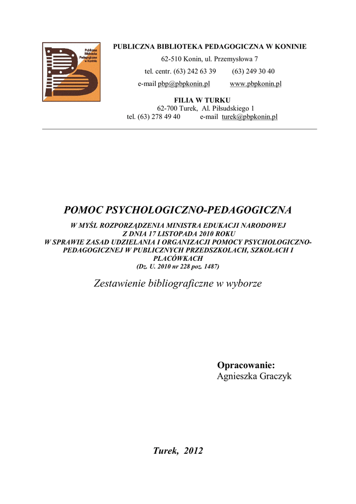 PUBLICZNA BIBLIOTEKA PEDAGOGICZNA W KONINIE 62-510 Konin, ul. Przemysłowa 7 tel. centr. (63) 242 63 39 (63) 249 30 40 e-mail [email protected] www.pbpkonin.pl FILIA W TURKU 62-700 Turek, Al. Piłsudskiego 1 tel. (63) 278 49 40 e-mail [email protected] POMOC PSYCHOLOGICZNO-PEDAGOGICZNA W MYŚL ROZPORZĄDZENIA MINISTRA EDUKACJI NARODOWEJ Z DNIA 17 LISTOPADA 2010 ROKU W SPRAWIE ZASAD UDZIELANIA I ORGANIZACJI POMOCY PSYCHOLOGICZNOPEDAGOGICZNEJ W PUBLICZNYCH PRZEDSZKOLACH, SZKOŁACH I PLACÓWKACH (Dz. U. 2010 nr 228 poz. 1487) Zestawienie bibliograficzne w wyborze Opracowanie: Agnieszka Graczyk Turek, 2012 WYDAWNICTWA ZWARTE 1. BADANIA diagnostyczne w pedagogice i psychopedagogice / M. Guziuk-Tkacz. – Warszawa : Wydawnictwo Akademickie Żak, 2011 Sygn.: 46070 [czytelnia] 2. KARTA indywidualnych potrzeb ucznia: zakres dostosowania wymagań edukacyjnych wynikających z programu nauczania do indywidualnych potrzeb rozwojowych i edukacyjnych oraz możliwości psychofizycznych ucznia / R. Naprawa [i in.]. – Gdańsk : Wydawnictwo Harmonia, 2012 Sygn.: 46230 3. KOMPETENCJE diagnostyczne i terapeutyczne nauczyciela / pod red. nauk. D. Wosik-Kawali, T. Zubrzyckiej-Maciąg. – Kraków : Oficyna Wydawnicza Impuls, 2011 Sygn.: 45881 4. PODNIESIENIE efektywności kształcenia uczniów ze specjalnymi potrzebami edukacyjnymi : materiały dla nauczycieli / [recenzent J. Wrona ; E. Wojdyła i in.]. – Warszawa : Ministerstwo Edukacji Narodowej. Departament Zwiększania Szans Edukacyjnych, [2010] Sygn.: 45940-45942 5. PODNIESIENIE efektywności kształcenia uczniów ze specjalnymi potrzebami edukacyjnymi : materiały szkoleniowe. Cz. 1 / [E. Wojdyła i in.] – Warszawa : Ministerstwo Edukacji Narodowej. Departament Zwiększania Szans Edukacyjnych, 2010 Sygn.: 45943 6. PODNIESIENIE efektywności kształcenia uczniów ze specjalnymi potrzebami edukacyjnymi : materiały szkoleniowe. Cz. 2 / [recenzent J. Wrona ; B. Trochimiak i in.]. – Warszawa : Ministerstwo Edukacji Narodowej. Departament Zwiększania Szans Edukacyjnych, 2010 Sygn.: 45944 ARTYKUŁY Z CZASOPISM 7. ABSURDY rzeczywistości szkolnej (o pomocy psychologiczno-pedagogicznej inaczej...) / A. Skubis-Rafalska // Nowa Szkoła. – 2012, nr 3, s. 26-31 8. DIAGNOZA potencjału poznawczego dzieci w wieku przedszkolnym - model teoretyczny oraz weryfikacja narzędzia (część 1)/ E. M. Kulesza // Szkoła Specjalna. – 2011, nr 1, s. 15-31 9. DIAGNOZA potencjału poznawczego dzieci w wieku przedszkolnym (część 2) : dzieci trzy- i czteroletnie / E. M. Kulesza // Szkoła Specjalna. – 2011, nr 2, s. 102-113 10. DIAGNOZA potencjału poznawczego dzieci w wieku przedszkolnym (część 3) : dzieci pięcio- i sześcioletnie / E. M. Kulesza // Szkoła Specjalna. – 2011, nr 3, s. 197208 1 11. DIAGNOZA potencjału poznawczego dzieci w wieku przedszkolnym (część 4) : Dzieci trzy- i czteroletnie z niepełnosprawnością intelektualną w stopniu lekkim / E. M. Kulesza // Szkoła Specjalna. – 2011, nr 4, s. 271-282 12. DIAGNOZA zawsze się opłaca / A. Brzosko // Dyrektor Szkoły. – 2011, nr 7, s. 29-33 13. DUŻA i potrzebna zmiana (pomoc psychologiczno-pedagogiczna) / L. Jastrzębska // Nowa Szkoła. – 2011, nr 5, s. 3-6 14. DYLEMATY nauczycieli dotyczące udzielania pomocy psychologicznopedagogicznej w szkole / L. Mackiewicz-Adamska // Problemy OpiekuńczoWychowawcze. – 2011, nr 6, s. 6-10 15. DZIECKO w teczce / P. Skura // Głos Nauczycielski. – 2011, nr 36, s. 6 16. KIERUNKI zmian w organizacji i zasadach udzielania pomocy psychologicznopedagogicznej w publicznych przedszkolach / M. Owczarz // Dyrektor Szkoły. – 2010, nr 6, dodatek: Przed Szkołą s. 17-21 17. KOMU i do czego potrzebny jest w szkole psycholog? / E. Góralczyk // Psychologia w Szkole. – 2011, nr 2, s. 18-29 18. KONSTRUOWANIE Indywidualnych Programów Edukacyjno-Terapeutycznych / B. Dziewięcka // Wychowanie w Przedszkolu. – 2011, nr 9, s. 32-36 19. KSZTAŁCENIE uczniów ze specjalnymi potrzebami edukacyjnymi w świetle nowych regulacji prawnych / M. Golimowska // Koniński Kurier Oświatowy. – 2011, nr 1, wkładka "Edukacja wczesnoszkolna i przedszkolna" nr 1, s. III-IV 20. NA POMOC? Tylko spokojnie i do przodu / B. Jankowski // Dyrektor Szkoły. – 2011, nr 11, s. 30-32 21. NOWA organizacja pomocy psychologiczno-pedagogicznej. Czy będzie lepiej? / M. Bernad // Dyrektor Szkoły. – 2011, nr 10, s. 16-19 22. NOWE zasady pomocy psychologiczno-pedagogicznej / B. Krajewska // Nowa Szkoła. – 2011, nr 4, s. 14-21 23. POMOC psychologiczno-pedagogiczna a regulacje dotyczące kształcenia specjalnego / T. Serafin // Dyrektor Szkoły. – 2011, nr 10, s. 48-51 24. POMOC psychologiczno-pedagogiczna w szkole masowej / M. Suchocka // Dyrektor Szkoły. – 2012, nr 2, wkł. Akademia Zarządzania „Dyrektora Szkoły, s. 39-44 25. PRAKTYCZNA organizacja wsparcia psychologiczno-pedagogicznego ucznia ze specyficznymi potrzebami edukacyjnymi / M. Wołojewicz // Dyrektor Szkoły. – 2011, nr 8, s. 19-24 26. PRAKTYCZNE sposoby radzenia sobie z uczniami ze specjalnymi potrzebami edukacyjnymi / J. Pietrzyk // Koniński Kurier Oświatowy. – 2011, nr 4, s. 6-8 2 27. PRAWIE jak terapeuci / M. Kaszulanis // Głos Nauczycielski. – 2011, nr 36, s. 4 28. PRAWNE uwarunkowania pomocy psychologiczno-pedagogicznej w przedszkolach / E. Brańska // Dyrektor Szkoły. – 2011, nr 3, dodatek: Przed Szkołą 1/2011, s. 28-31 29. ROZPOZNANIE sytuacji ucznia ze specjalnymi potrzebami edukacyjnymi na terenie szkoły / A. Paszkiewicz // Problemy Opiekuńczo-Wychowawcze. – 2011, nr 7, s. 3339 30. UCZEŃ ze SPE może się znaleźć w każdej szkole / L. Klaro-Celej // Dyrektor Szkoły. – 2012, nr 4, s. 56-58 31. UCZNIOWIE z orzeczeniami i opiniami / M. Melka-Roszczyk // Psychologia w Szkole. – 2011, nr 3, s. 120-125 32. ZASADY udzielania pomocy psychologiczno-pedagogicznej : zmiany i ich wpływ na funkcjonowanie świetlic / J.Hoffmann, J. Rudnik // Świetlica w Szkole. – 2011, nr 4, s. 9-11