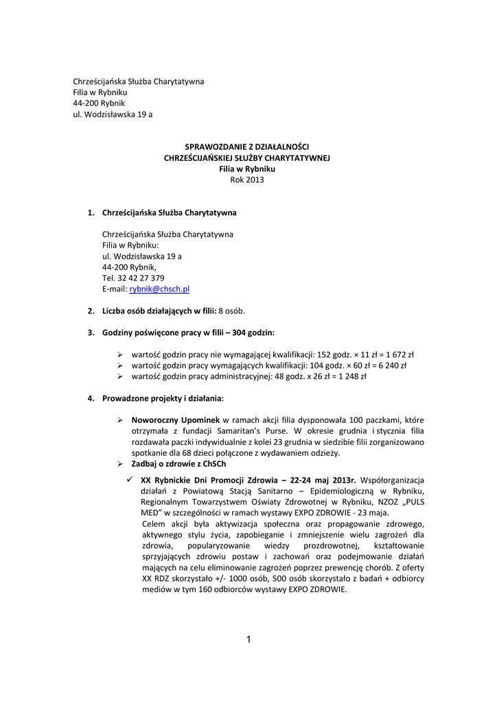 Chrześcijańska Służba Charytatywna Filia w Rybniku 44-200 Rybnik ul. Wodzisławska 19 a SPRAWOZDANIE Z DZIAŁALNOŚCI CHRZEŚCIJAŃSKIEJ SŁUŻBY CHARYTATYWNEJ Filia w Rybniku Rok 2013 1. Chrześcijańska Służba Charytatywna Chrześcijańska Służba Charytatywna Filia w Rybniku: ul. Wodzisławska 19 a 44-200 Rybnik, Tel. 32 42 27 379 E-mail: [email protected] 2. Liczba osób działających w filii: 8 osób. 3. Godziny poświęcone pracy w filii – 304 godzin: wartość godzin pracy nie wymagającej kwalifikacji: 152 godz. × 11 zł = 1 672 zł wartość godzin pracy wymagających kwalifikacji: 104 godz. × 60 zł = 6 240 zł wartość godzin pracy administracyjnej: 48 godz. x 26 zł = 1 248 zł 4. Prowadzone projekty i działania: Noworoczny Upominek w ramach akcji filia dysponowała 100 paczkami, które otrzymała z fundacji Samaritan’s Purse. W okresie grudnia i stycznia filia rozdawała paczki indywidualnie z kolei 23 grudnia w siedzibie filii zorganizowano spotkanie dla 68 dzieci połączone z wydawaniem odzieży. Zadbaj o zdrowie z ChSCh XX Rybnickie Dni Promocji Zdrowia – 22-24 maj 2013r. Współorganizacja działań z Powiatową Stacją Sanitarno – Epidemiologiczną w Rybniku, Regionalnym Towarzystwem Oświaty Zdrowotnej w Rybniku, NZOZ „PULS MED” w szczególności w ramach wystawy EXPO ZDROWIE - 23 maja. Celem akcji była aktywizacja społeczna oraz propagowanie zdrowego, aktywnego stylu życia, zapobieganie i zmniejszenie wielu zagrożeń dla zdrowia, popularyzowanie wiedzy prozdrowotnej, kształtowanie sprzyjających zdrowiu postaw i zachowań oraz podejmowanie działań mających na celu eliminowanie zagrożeń poprzez prewencję chorób. Z oferty XX RDZ skorzystało +/- 1000 osób, 500 osób skorzystało z badań + odbiorcy mediów w tym 160 odbiorców wystawy EXPO ZDROWIE. 1 Światowy Dzień Rzucania Palenia tytoniu – Zespół Szkół Specjalnych 18.11.2013r. – Z tej okazji uczniowie Zespołu Szkół nr 6 w Rybniku Boguszowicach uczestniczyli w spotkaniu z przedstawicielami Stacji SanitarnoEpidemiologicznej w Rybniku, oraz ChSCh filią w Rybniku gorąco zachęcali wszystkich palaczy do porzucenia tego zgubnego nałogu a osoby niepalące utwierdzały o słuszności ich postawy. W trakcie spotkania uczniowie oraz kadra pedagogiczna mogła wysłuchać ciekawej prelekcji połączonej z prezentacją, gdzie to prócz danych epidemiologicznych/statystycznych przedstawiono własne doświadczenia prelegenta z paleniem i tragedii rodzinnej z tym związanej, zobaczyć film pt. „Stalowe gardła” jak również zbadać poziom toksycznego dla organizmu tlenku węgla we krwi. W Spotkaniu udział wzięło około 95 osób. Światowy Dzień Rzucania Palenia tytoniu PLAZA - 20.11.2013r. – W rybnickim Centrum Handlowym „Plaza” młodzież Zespołu Szkół EkonomicznoUsługowych w Rybniku zachęcała przechodniów do rzucania palenia i życia wolnego od tego nałogu. Myślą przewodnią było: jabłko zamiast papierosa tak, więc uczniowie rozdawali jabłka z napisem "Papieros rzecz niewielka... Ale ryzyko ogromne". Akcja cieszyła się ogromnym zainteresowaniem a prowadzona była wspólnie z Powiatową Stacją Sanitarno - Epidemiologiczną w Rybniku oraz Chrześcijańską Służbą Charytatywną w Rybniku, dzięki którym palacze i nie tylko mogli m. in. dokonać pomiaru stopnia "zaczadzenia" swojego organizmu, pomiaru ciśnienia tętniczego oraz zasięgnąć porady w zakresie profilaktyki antynikotynowej. Z akcji skorzystało ok. 500 osób. Światowy Dzień Rzucania Palenia tytoniu – EKONOMIK 21.11.2013r. - w czwartek w sali teatralnej Zespołu Szkół Ekonomiczno-Usługowych w Rybniku odbyła się kolejna część „Dnia bez papierosa” organizowana przez Powiatową Stację Sanitarno-Epidemiologiczną w Rybniku Chrześcijańską Służbę Charytatywną filia w Rybniku oraz „Ekonomik”. Na początek skutki i ryzyko związane z paleniem papierosów w szokującej prezentacji przedstawił pan Edward Parma z ChSCh. Potem uczniowie przedstawili scenki pt. „Nigdy nie pal” pokazujące destrukcyjny wpływ nikotyny na organizm człowieka. Następnie uczennice zaśpiewały autorską piosenkę „Dzień bez papierosa”, która być może stanie się hymnem kolejnych imprez. Uczniowie mieli również możliwość poznania faktów i mitów na temat tak modnego dzisiaj epapierosa. Podczas happeningu młodzież mogła zmierzyć poziom ciśnienia, zbadać stopień „zaczadzenia” organizmu oraz zasięgnąć porady dot. profilaktyki antynikotynowej lub gdzie osoby uzależnione mogą szukać pomocy. Dzięki prostemu badaniu smokolajzerem, u jednego z uczniów stwierdzono zatrucie organizmu tlenkiem węgla pochodzącego z nieszczelnego pieca CO, który dzięki temu mógł otrzymać niezbędną pomoc medyczną. STOP CHOROBY = SENIOR ZDROWY – 28.11.2013r. Współorganizacja działań z Powiatową Stacją Sanitarno – Epidemiologiczną w Rybniku. Celem akcji było propagowanie zachowań prozdrowotnych, prewencyjnych u osób starszych w zakresie: udaru mózgu, chorób układu krążenia, układu ruchu, układu nerwowego, profilaktyka używek, itd. prezentacja alternatywnej diety wegetariańskiej. W akcji uczestniczyły 44 osoby mogące skorzystać z prelekcji dotyczącej zachowań prewencyjnych w wieku starczym, profilaktyki uzależnień, udaru mózgu. Degustacji dań wegetariańskich, dietetycznych pomagającymi utrzymać właściwy poziom glukozy, cholesterolu itd. Pomiaru ciśnienia tętniczego oraz poziomu CO2. 2 05.12.2013r. – prelekcja zdrowotna na zaproszenie ChSCh filii w Katowicach w Klubie Zdrowia, na spotkaniu uczestniczyło 15 osób. Pomoc odzieżowa Akcja „Kurtka dla Malucha” w miesiącu listopadzie odbyła się zbiórka odzieży gł. zimowej. Zbiórka odbyła się z 7 punktach tj. siedzibie filii, Szkole Podstawowej z Oddziałami Integracyjnymi nr 34 im. Ireny Sendlerowej w Rybniku. Zakładzie Ubezpieczeń Społecznych w Rybniku oraz Inspektoratach: 