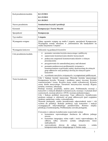 Kod przedmiotu/modułu K1-23/2011 K1-33/2012 K1-30/2013 Nazwa przedmiotu Seminarium krytyki i prelekcji Kierunek Kompozycja i Teoria Muzyki Specjalność Kompozycja Typ studiów I stopnia Wymagania wstępne Zdany egzamin wstępny na studia I stopnia, specjalność Kompozycja. Wymagania zostały określone w „Informatorze dla kandydatów na studia stacjonarne I stopnia”. Wymagania końcowe Zaliczenie wg podanych kryteriów Cele przedmiotu/modułu Treści kształcenia • • • poznanie warsztatu krytyka muzycznego i publicysty opanowanie konstruowania tekstów krytycznych praktyczna znajomość konstruowania tekstów o różnym przeznaczeniu • przygotowanie do samodzielnej pracy nad tekstami • poznanie podstawowej problematyki związanej z konstruowaniem wypowiedzi ustnej, dostosowanej do różnych grup odbiorców oraz prelekcji słownej do różnych typów koncertów • wyrobienie nawyków związanych z wystąpieniami publicznymi Cele i funkcje krytyki muzycznej. Warsztat krytyka muzycznego. Kompetencje krytyka. Wymogi i problemy natury etycznej. Kryteria wartościowania i oceny. Kryteria oceny sztuki wykonawczej. Kryteria oceny dzieła muzycznego. Zawartość merytoryczna recenzji. Rygory terminu, rozmiaru, adiustacja. Rodzaje recenzji, przykłady, analiza prac. Problematyka recenzji z koncertów o różnych składach wykonawczych, recenzje z wykonań dzieł scenicznych, recenzje płytowe i DVD, recenzje podsumowujące. Cele i funkcje prelekcji muzycznej. Typy odbiorców, kształtowanie przekazu ustnego w zależności od grup odbiorczych (pod względem struktury społecznej, wieku, wykształcenia). Warsztat prelegenta, sztuka poszukiwania odpowiednich treści i ich wyboru do prelekcji. Rodzaje prelekcji, typy koncertów i audycji wymagających indywidualnego potraktowania. Różnice między prelekcją a konferansjerką. Problematyka zawodu prelegenta. Ćwiczenia w zakresie kształtowania wypowiedzi ustnej: • komentarze wprowadzające słuchacza do odbioru jednego utworu • komentarz integrujący różne wątki i treści wprowadzający do odbioru kilku utworów (sztuka odnajdywania treści nadrzędnych) • wprowadzenie słowne do całego koncertu – sztuka komponowania słowa integrującego w formie eseju 1 • Zamierzone efekty kształcenia w zakresie kompetencji społecznych: w aspekcie niezależności • Formy kształcenia (np. wykład/ćwiczenia/inne) specyfika koncertów dla młodych odbiorców: konstruowanie tematycznych audycji dla dzieci i młodzieży w sposób świadomy poszerza swoją wiedzę i umiejętności poprzez odpowiedzialny wybór przedmiotów uzupełniających podstawowy tok studiów Zajęcia zbiorowe w formie wykładu, ćwiczeń, seminarium. Rok Punkty ECTS (nakład pracy studenta niezbędny do osiągnięcia zamierzonych efektów kształcenia) Semestr I 1 II 2 3 III 4 5 6 Tok 2011 2 2 Tok 2012 2 2 Tok 2013 3 3 2 2 zal zst Punkty ECTS Ilość godzin w tygodniu Tok 2011, 2012, 2013 Rodzaj zaliczenia Tok 2011, 2012, 2013 Legenda Kryteria oceny i sposoby weryfikacji zal – zaliczenie; zst – zaliczenie ze stopniem; egz – egzamin; ekm – egzamin komisyjny Ocena na podstawie całorocznej pracy studenta w realizowaniu poszczególnych zadań cząstkowych, w zakres których wchodzą: Semestr zimowy: cztery prace pisemne: • dwie recenzje z koncertów z bieżącego repertuaru • jedna recenzja podsumowująca kilkukoncertowe lub kilkudniowe zdarzenie muzyczne • jedna recenzja płytowa Kryteria oceny dotyczą wartości merytorycznej tekstów (wiedza przedmiotowa i umiejętność jej wykorzystania w recenzji), walorów językowych tekstu (umiejętności poprawnego językowo przekazu przede wszystkim pod względem stylistycznym i logicznym), adekwatności przekazu w zależności od przeznaczenia tekstu dla grup odbiorczych. Ocena weryfikuje: • umiejętność przygotowania typowych prac pisemnych dotyczących zagadnień szczegółowych związanych ze studiowanym kierunkiem studiów i specjalnością, na temat 2 • • Literatura interpretowania muzyki, z wykorzystaniem podstawowych ujęć teoretycznych, a także różnych źródeł umiejętność zbierania, analizowania i interpretowania informacji, rozwijania idei i formułowania krytycznej argumentacji oraz wewnętrzną motywacją i organizacją pracy twórczej umiejętność samooceny, konstruktywnej krytyki w stosunku do działań innych osób Semestr letni: trzy prelekcje ustne: • dotycząca wprowadzenia słownego do jednego utworu • wprowadzająca do kilku różnych kompozycji • wprowadzająca do całego koncertu Ocena prelekcji dotyczy aspektów merytorycznych (prawidłowych i zgodnych z faktografią informacji, kompetentnych poszukiwań literaturowych, umiejętności ich wyboru w zależności od charakterystyki odbiorcy), aspektów związanych z przekazem treści (adekwatność werbalna i niewerbalna przekazu ustnego) Ocena weryfikuje: • umiejętność przygotowania typowych wystąpień ustnych, dotyczących zagadnień szczegółowych związanych ze studiowanym kierunkiem studiów i specjalnością, na temat interpretowania muzyki, z wykorzystaniem podstawowych ujęć teoretycznych, a także różnych źródeł • formy zachowań związane z występami publicznymi ze szczególnych uwzględnieniem prezentacji muzyki własnej i innych kompozytorów • zdolność do efektywnego wykorzystania: wyobraźni, intuicji, emocjonalności, zdolności twórczego myślenia i twórczej pracy w trakcie rozwiązywania problemów, zdolności elastycznego myślenia, adaptowania się do nowych i zmieniających się okoliczności • umiejętność kontroli własnych zachowań i przeciwdziałanie lękom i stresom, jak również umie sprostanie warunkom związanym z publicznymi występami lub prezentacjami. An anthology of musical criticism, ed. N. Demuth, Greenwood Press, [s. l.] USA, 1971. Bula K., Jak mówić o muzyce. Vademecum komentatora muzycznego, Warszawa 1991. Ciesielski R., Refleksja estetyczna w 