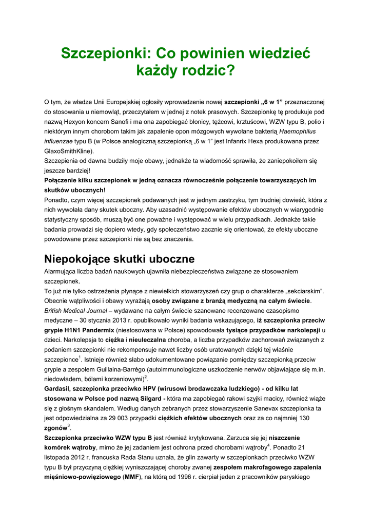 Szczepionki: Co powinien wiedzieć każdy rodzic? O tym, że władze Unii Europejskiej ogłosiły wprowadzenie nowej szczepionki „6 w 1” przeznaczonej do stosowania u niemowląt, przeczytałem w jednej z notek prasowych. Szczepionkę tę produkuje pod nazwą Hexyon koncern Sanofi i ma ona zapobiegać błonicy, tężcowi, krztuścowi, WZW typu B, polio i niektórym innym chorobom takim jak zapalenie opon mózgowych wywołane bakterią Haemophilus influenzae typu B (w Polsce analogiczną szczepionką „6 w 1” jest Infanrix Hexa produkowana przez GlaxoSmithKline). Szczepienia od dawna budziły moje obawy, jednakże ta wiadomość sprawiła, że zaniepokoiłem się jeszcze bardziej! Połączenie kilku szczepionek w jedną oznacza równocześnie połączenie towarzyszących im skutków ubocznych! Ponadto, czym więcej szczepionek podawanych jest w jednym zastrzyku, tym trudniej dowieść, która z nich wywołała dany skutek uboczny. Aby uzasadnić występowanie efektów ubocznych w wiarygodnie statystyczny sposób, muszą być one poważne i występować w wielu przypadkach. Jednakże takie badania prowadzi się dopiero wtedy, gdy społeczeństwo zacznie się orientować, że efekty uboczne powodowane przez szczepionki nie są bez znaczenia. Niepokojące skutki uboczne Alarmująca liczba badań naukowych ujawniła niebezpieczeństwa związane ze stosowaniem szczepionek. To już nie tylko ostrzeżenia płynące z niewielkich stowarzyszeń czy grup o charakterze „sekciarskim”. Obecnie wątpliwości i obawy wyrażają osoby związane z branżą medyczną na całym świecie. British Medical Journal – wydawane na całym świecie szanowane recenzowane czasopismo medyczne – 30 stycznia 2013 r. opublikowało wyniki badania wskazującego, iż szczepionka przeciw grypie H1N1 Pandermix (niestosowana w Polsce) spowodowała tysiące przypadków narkolepsji u dzieci. Narkolepsja to ciężka i nieuleczalna choroba, a liczba przypadków zachorowań związanych z podaniem szczepionki nie rekompensuje nawet liczby osób uratowanych dzięki tej właśnie 1 szczepionce . Istnieje również słabo udokumentowane powiązanie pomiędzy szczepionką przeciw grypie a zespołem Guillaina-Barrégo (autoimmunologiczne uszkodzenie nerwów objawiające się m.in. 2 niedowładem, bólami korzeniowymi) . Gardasil, szczepionka przeciwko HPV (wirusowi brodawczaka ludzkiego) - od kilku lat stosowana w Polsce pod nazwą Silgard - która ma zapobiegać rakowi szyjki macicy, również wiąże się z głośnym skandalem. Według danych zebranych przez stowarzyszenie Sanevax szczepionka ta jest odpowiedzialna za 29 003 przypadki ciężkich efektów ubocznych oraz za co najmniej 130 3 zgonów . Szczepionka przeciwko WZW typu B jest również krytykowana. Zarzuca się jej niszczenie 4 komórek wątroby, mimo że jej zadaniem jest ochrona przed chorobami wątroby . Ponadto 21 listopada 2012 r. francuska Rada Stanu uznała, że glin zawarty w szczepionkach przeciwko WZW typu B był przyczyną ciężkiej wyniszczającej choroby zwanej zespołem makrofagowego zapalenia mięśniowo-powięziowego (MMF), na którą od 1996 r. cierpiał jeden z pracowników paryskiego 5 magistratu; w wyniku tej decyzji pracownik otrzymał odszkodowanie . W podobnej sytuacji mogą znajdować się tysiące ludzi, którym nie przyszło do głowy złożenie oficjalnej skargi. Szczepionki mogą w niewielkich ilościach zawierać różne substancje toksyczne, takie jak formaldehyd (rakotwórczy), rtęć (neurotoksyczna), glin (neurotoksyczny) czy fenoksyetanol. Na działanie tych substancji szczególnie wrażliwe są małe dzieci, u których mogą wystąpić poważne zaburzenia funkcji układu nerwowego i odpornościowego. Cząsteczki tych substancji stosowane są jako adiuwanty, które zwiększają skuteczność szczepionek, czyli odpowiedź układu odpornościowego. U niektórych osób istnieją także predyspozycje genetyczne, które powodują, że po podaniu szczepionki ich układ odpornościowy rozregulowuje się, co prowadzi do powstawania chorób autoimmunologicznych takich jak zespół makrofagowego zapalenia mięśniowo-powięziowego (MMF), zespół Guillaina-Barrégo lub zespół antyfosfolipidowy; te skutki uboczne są niezwykle poważne i choć występują rzadko, to jednak są dobrze udokumentowane. Glin może także przyczyniać się do powstawania choroby Alzheimera oraz raka piersi, co wyjaśniałoby epidemię zachorowań wśród pokolenia powojennego. Wątpliwa przewaga korzyści nad ryzykiem Wszystkie te działania niepożądane są przedstawiane przez władze oraz media jako mało znaczące w porównaniu z „ogromnymi korzyściami”, które niosą ze sobą szczepienia. Według powszechnej opinii szczepionki są doskonałą ochroną przed wieloma chorobami zakaźnymi. Panuje też przekonanie, że szczepionki pomogły zwalczyć liczne epidemie dziesiątkujące ludność we wcześniejszych epokach: dur brzuszny, cholerę, krztusiec, szkarlatynę, gruźlicę, zapalenie opon mózgowych, tężec, jak również choroby wieku dziecięcego, czyli odrę, świnkę, różyczkę itp. Jednakże prawda naukowa i historyczna zmusza mnie do stwierdzenia, że – z wyjątkiem polio (którego historia zasługuje na osobny artykuł) – jest to zwykły mit. Wymienione powyżej choroby przestały być przyczyną zgonów na dużą skalę jeszcze przed wprowadzeniem odpowiednich szczepionek. Przyczyniło się do tego zmniejszenie liczby osób żyjących w skrajnej nędzy, zmiana warunków życiowych, poprawa higieny oraz jakości wody pitnej, a także zmniejszenie stopnia niedożywienia. Błonica – charakterystyczny przykład Nie jestem w stanie omówić wszystkich chorób, skupię się więc na tych, które są najbardziej charakterystyczne. Opisane sytuacje są niezwykle podobne do przypadków związanych z innymi chorobami, na które nasze rządy przeznaczają fundusze w celu wykonywania masowych szczepień. Więcej informacji oraz szczegółowe