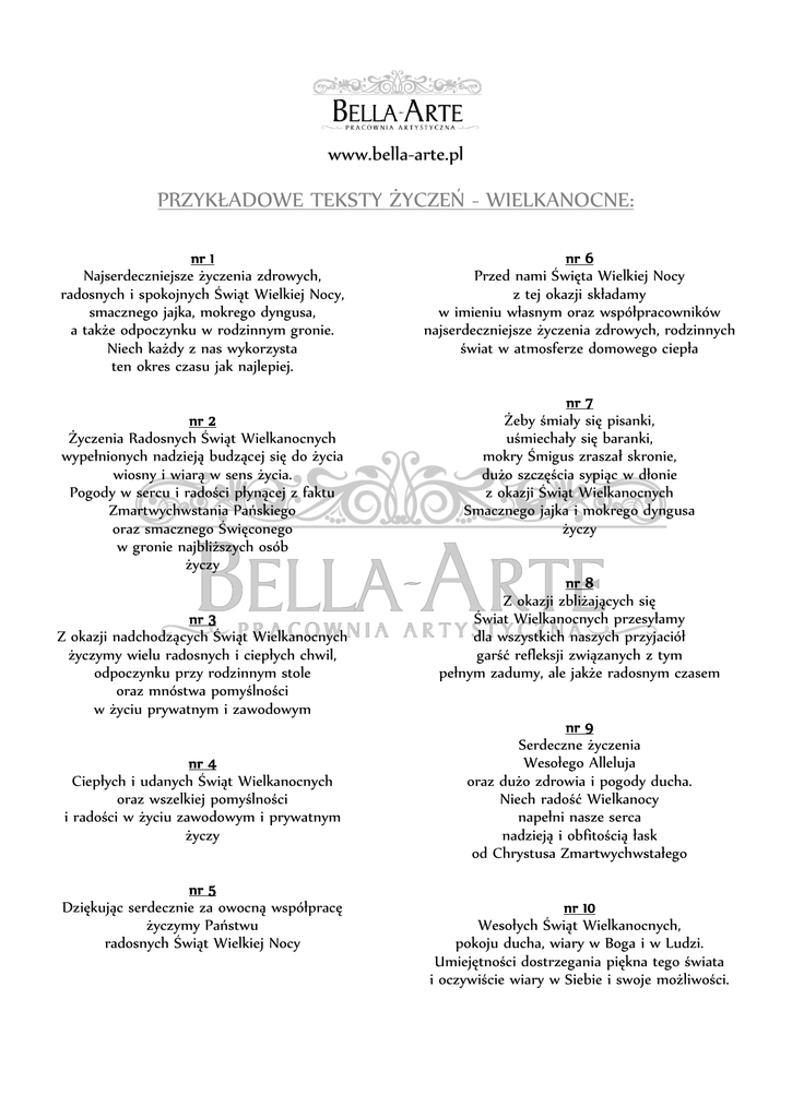 www.bella-arte.pl PRZYKŁADOWE TEKSTY ŻYCZEŃ - WIELKANOCNE: nr 1 Najserdeczniejsze życzenia zdrowych, radosnych i spokojnych Świąt Wielkiej Nocy, smacznego jajka, mokrego dyngusa, a także odpoczynku w rodzinnym gronie. Niech każdy z nas wykorzysta ten okres czasu jak najlepiej. nr 2 Życzenia Radosnych Świąt Wielkanocnych wypełnionych nadzieją budzącej się do życia wiosny i wiarą w sens życia. Pogody w sercu i radości płynącej z faktu Zmartwychwstania Pańskiego oraz smacznego Święconego w gronie najbliższych osób życzy nr 3 Z okazji nadchodzących Świąt Wielkanocnych życzymy wielu radosnych i ciepłych chwil, odpoczynku przy rodzinnym stole oraz mnóstwa pomyślności w życiu prywatnym i zawodowym nr 4 Ciepłych i udanych Świąt Wielkanocnych oraz wszelkiej pomyślności i radości w życiu zawodowym i prywatnym życzy nr 5 Dziękując serdecznie za owocną współpracę życzymy Państwu radosnych Świąt Wielkiej Nocy nr 6 Przed nami Święta Wielkiej Nocy z tej okazji składamy w imieniu własnym oraz współpracowników najserdeczniejsze życzenia zdrowych, rodzinnych świat w atmosferze domowego ciepła nr 7 Żeby śmiały się pisanki, uśmiechały się baranki, mokry Śmigus zraszał skronie, dużo szczęścia sypiąc w dłonie z okazji Świąt Wielkanocnych Smacznego jajka i mokrego dyngusa życzy nr 8 Z okazji zbliżających się Świat Wielkanocnych przesyłamy dla wszystkich naszych przyjaciół garść refleksji związanych z tym pełnym zadumy, ale jakże radosnym czasem nr 9 Serdeczne życzenia Wesołego Alleluja oraz dużo zdrowia i pogody ducha. Niech radość Wielkanocy napełni nasze serca nadzieją i obfitością łask od Chrystusa Zmartwychwstałego nr 10 Wesołych Świąt Wielkanocnych, pokoju ducha, wiary w Boga i w Ludzi. Umiejętności dostrzegania piękna tego świata i oczywiście wiary w Siebie i swoje możliwości. nr 11 Niech Zmartwychwstanie Pańskie, które niesie odrodzenie duchowe, napełni wszystkich spokojem i wiarą, da siłę w pokonywaniu trudności i pozwoli z ufnością patrzeć w przyszłość nr 12 Z okazji Świąt Wielkanocnych, wszystkiego najlepszego, smacznego „święconego”, dyngusa mokrego, życia spokojnego i szczęścia wielkiego! Wesołego Alleluja! nr 13 Z okazji Świąt Wielkanocnych życzymy wszystkim naszym, partnerom, przyjaciołom, klientom i współpracownikom, wszystkiego co najlepsze i najprzyjemniejsze, rodzinnej atmosfery, szczęścia osobistego, pogody ducha, smacznego święconego jajka i suto zastawionych stołów. nr 14 Na święta Wielkanocne, przesyłamy koszyk pełen świątecznych życzeń wplecionych pomiędzy wiosenne kwiaty, lukrowane babki, kolorowe pisanki, cukrowe baranki i bazie nr 15 Wielu radosnych i niepowtarzalnych chwil na Święta Wielkanocne, serdecznych spotkań rodzinnych przy świątecznym, suto zastawionym stole, przyjaznych rozmów, miłych gestów i wszelkiej pomyślności życzy