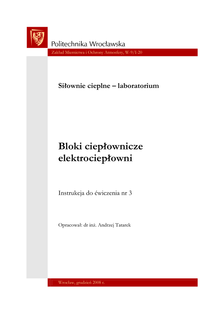 Zakład Miernictwa i Ochrony Atmosfery, W-9/I-20 Siłownie cieplne – laboratorium Bloki ciepłownicze elektrociepłowni Instrukcja do ćwiczenia nr 3 Opracował: dr inŜ. Andrzej Tatarek Wrocław, grudzień 2008 r. 1. Wstęp Elektrociepłownia omawiana na zajęciach laboratoryjnych jest cieplną elektrociepłownią blokową z otwartym układem wody chłodzącej (dla układów pseudokondensacji), wyposaŜoną w trzy bloki ciepłownicze z turbinami przeciwpręŜnymi oraz dwa szczytowe kotły wodne. Paliwem podstawowym elektrociepłowni jest węgiel kamienny – miał energetyczny klasy MIIA. Spalany węgiel pochodzi z polskich kopalń węgla kamiennego zlokalizowanych na Górnym Śląsku. Działalność koncesjonowana elektrociepłowni obejmuje: wytwarzanie energii elektrycznej, wytwarzanie ciepła, obrót energią elektryczną, przesyłanie i dystrybucję ciepła. Działalność dodatkowa obejmuje: sprzedaŜ ubocznych produktów spalania (popiół, ŜuŜel) oraz sprzedaŜ wody zdemineralizowanej. Proces technologiczny realizowany w elektrociepłowni polega na jednoczesnym wytwarzaniu energii elektrycznej i ciepła ze strumienia energii chemicznej zawartego w paliwie (skojarzone wytwarzanie energii elektrycznej i ciepła, tzw. kogeneracja). Procesy tego rodzaju charakteryzują się wysoką efektywnością ekonomiczną, realizowaną przez zminimalizowanie ilości procesowego ciepła odpadowego. Wytwarzane w elektrociepłowni ciepło słuŜy do zaspokajania potrzeb cieplnych miasta Wrocławia. Podstawowo energia elektryczna produkowana jest w skojarzeniu w turbogeneratorach bloków ciepłowniczych i dostarczana jest do krajowej sieci elektroenergetycznej. Wytworzone ciepło przeznaczone jest do ogrzewania miasta Wrocławia za pomocą systemu ciepłowniczego. Część szczytowa elektrociepłowni (kotły wodne) wykorzystywana jest tylko w okresach maksymalnego zapotrzebowania na ciepło. Produkcja energii odnawialnej (energii elektrycznej i ciepła) jest tutaj realizowana w procesie współspalania biomasy i paliwa konwencjonalnego (węgla kamiennego) w parowych kotłach energetycznych OP-230 i OP-430. Energia elektryczna zaliczana do energii z odnawialnych źródeł energii jest wytwarzana w generatorach turbozespołów bloków nr 1, 2, 3 (bloki BC-50 i BC-100) a ciepło w wymiennikach ciepłowniczych zasilanych parą wylotową z turbozespołów. Produkcja ciepła w kotłach wodnych KW-3, KW-5 (część szczytowa) nie jest realizowana w technologii współspalania węgla z biomasą. Zanim biomasa podana zostanie do kotłów parowych, jest mechanicznie czyszczona, musi być wolna od zanieczyszczeń (np. kawałków metalu, kamieni, ziemi). Rysunek 1 przedstawia aktualne rozmieszczenie urządzeń wytwórczych w elektrociepłowni. Urządzenia maszynowni i kotłowni bloku BC-50 są obecnie remontowane w celu umoŜliwienia ich dalszej wieloletniej pracy. 2 Rys. 1. Rozmieszczenie urządzeń wytwórczych w elektrociepłowni, [1] Podstawowymi elementami składowymi bloku BC-50 są: kocioł parowy OP-230 i turbozespół przeciwpręŜny złoŜony z turbiny 13P 55-0-3 i generatora TGHW-63. Podstawowymi elementami składowymi bloku BC-100 są: kocioł parowy OP-430 i turbozespół przeciwpręŜny złoŜony z turbiny 13UC100 i generatora TGH-125. 2. Kocioł OP-230 OP-230 jest kotłem parowym, pyłowym z naturalną cyrkulacją wody, jednowalczakowym, opromieniowanym, z trzystopniowym przegrzewaczem pary, podgrzewaczem wody oraz dwoma obrotowymi podgrzewaczami powietrza. Za I i II stopniem przegrzewacza są wbudowane wtryskowe schładzacze pary (rys. 2). Kocioł jest opalany węglem kamiennym. Palniki pyłowe są usytuowane w naroŜach i zasilane przez 3 młyny typu EM-70. Dane technologiczne kotła OP-230: • wydajność maksymalna trwała 63,9 kg/s (230 Mg/h) • wydajność nominalna 50 kg/s (180 Mg/h) • wydajność minimalna 38,9 kg/s (140 Mg/h) • ciśnienie wody zasilającej 16,4 MPa • ciśnienie wody wtryskowej 16,4 MPa • ciśnienie robocze w walczaku 15,0 MPa • ciśnienie pary na wylocie z przegrzewacza 13,6 MPa 3 • temperatura wody zasilającej 200°C (473 K) • temperatura wody wtryskowej 140°C (413 K) • temperatura pary przegrzanej 540°C (813 K) • ilość wody wtryskowej 6,9 kg/s (25 Mg/h) • temperatura gorącego powietrza 290°C (563 K) • temperatura spalin na wylocie 140°C (413 K) • zawartość C02 za kotłem 15% Rys. 2. Konstrukcja kotła OP-230 (liczby oznaczają wartości pola powierzchni ogrzewanych) 4 Charakterystyka paliwa gwarancyjnego: • wartość opałowa 20,9 MJ/kg • maksymalna zawartość popiołu 18% • maksymalna zawartość wilgoci 12% • maksymalna zawartość siarki 1% • zuŜycie węgla gwarancyjnego przy wydajności maksymalnej trwałej 7,78 kg/s (28 Mg/h) • sprawność kotła brutto (paliwo gwarancyjne, temperatura wody zasilającej 210°C) 88%. 3. Turbina 13P55-0 13P55-0 jest przeciwpręŜną turbiną ciepłowniczą, osiową, akcyjną, dwukadłubową z dwustopniowym wylotem ciepłowniczym do zasilania podgrzewaczy wody sieciowej. Turbina słuŜy ponadto do wytwarzania pary technologicznej i energii elektrycznej (ogólny schemat turbozespołu przedstawiono na rys. 3). Rys. 3. Ogólny schemat rurociągów przyturbinowych: ZS - zawór szybkozamykający, ZR - zawór regulacyjny WysokopręŜny kadłub turbiny o częściowo dwupowłokowej konstrukcji, ze zwrotnym przepływem pary ma jednowieńcowy stopień regulacyjny i osiemnaście osiowych stopni akcyjnych. W kadłubie średniopręŜnym mieści się dziewięć osiowych stopni akcyjnych. Para 5 przeciwpręŜna odpływa z części średniopręŜnej dwustopniowym wylotem za stopniami 8 i 9. Oprócz wylotu turbina ma cztery upusty nieregulowane do zasilania pogrzewaczy regeneracyjnych i odgazowywaczy. Drugi upust słuŜy do zasilania parą kolektora technologicznego. Dane techniczne turbiny 13P55-O: • moc znamionowa 55500 kW • moc obliczeniowa 52540 kW • obroty znamionowe 3000 obr/min • ob