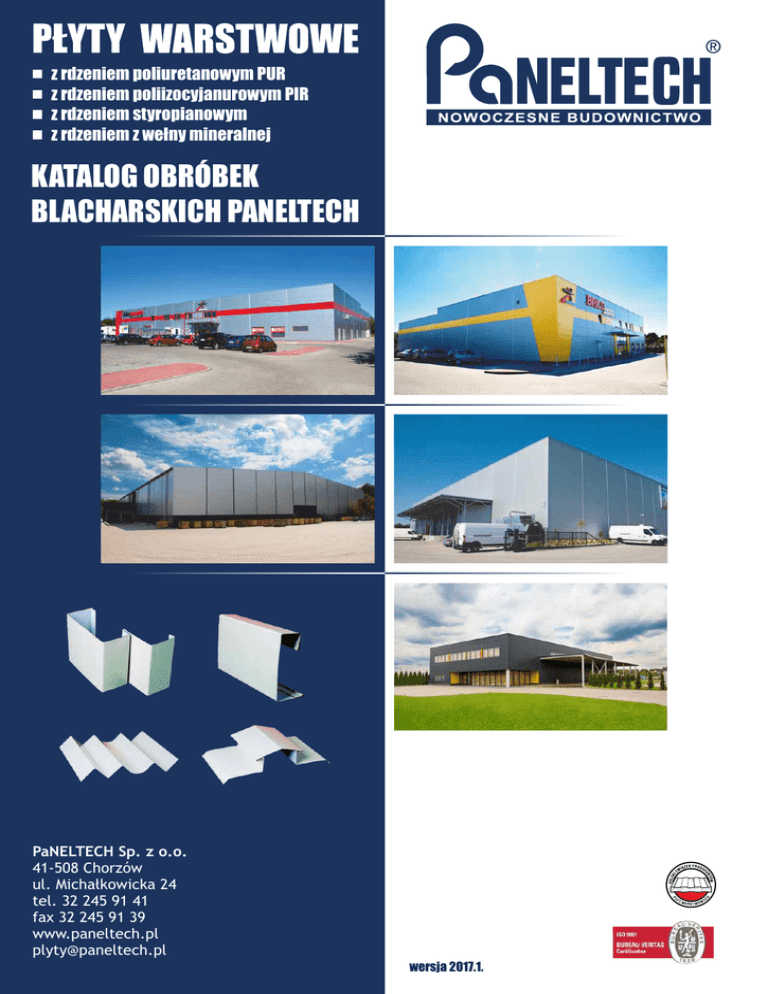 z rdzeniem poliuretanowym PUR z rdzeniem poliizocyjanurowym PIR z rdzeniem styropianowym z rdzeniem z wełny mineralnej KATALOG OBRÓBEK BLACHARSKICH PANELTECH PaNELTECH Sp. z o.o. 41-508 Chorzów ul. Michałkowicka 24 tel. 32 245 91 41 fax 32 245 91 39 www.paneltech.pl [email protected] wersja 2017.1. WSTĘP Firma PaNELTECH Sp. z o.o. jest wyspecjalizowanym przedsiębiorstwem produkcyjno-usługowym działającym w branży budowlanej na rynku dóbr inwestycyjnych i przemysłowych od 1989 roku. Wysoka jakość oferowanych przez firmę produktów jest wynikiem stosowania nowoczesnych technologii wytwarzania oraz materiałów i surowców pochodzących od renomowanych dostawców krajowych i zagranicznych. Na wysoki poziom oferowanych usług budowlanych wpływ mają przede wszystkim wiedza, zaangażowanie oraz wieloletnie doświadczenie w branży. Warto podkreślić fakt, iż od początku swojej działalności Firma PaNELTECH stara się budować swoją przewagę konkurencyjną w oparciu o nowoczesne i innowacyjne rozwiązania produktowe i technologiczne. Konsekwencją przyjętej strategii są zrealizowane na przestrzeni lat inwestycje, w tym m.in. zakup nowoczesnej generacji parku maszynowego do produkcji drzwi chłodniczych i przemysłowych, zakup nowoczesnej linii do produkcji styropianu, pełna modernizacja produkcji płyt warstwowych z rdzeniem styropianowym (PWS) i wełny mineralnej (PWW) oraz najnowsza inwestycja firmy – zakup jednej z najnowocześniejszych w Europie linii technologicznych do produkcji płyt warstwowych z rdzeniem poliuretanowym. Dzięki tej inwestycji oferta firmy została poszerzona o dwa nowe produkty: ź płyty warstwowe z rdzeniem poliuretanowym typu PW PUR, ź płyty warstwowe z rdzeniem poliizocyjanurowym typu PW PIR. Firma PaNELTECH posiada w swojej ofercie elementy uzupełniające system lekkiej obudowy z płyt warstwowych takie jak obróbki blacharskie, elementy złączne i montażowe. KOMPLEKSOWY SYSTEM OBRÓBEK BLACHARSKICH W zakresie produkcji obróbek blacharskich firma Paneltech oferuje obróbki z blachy: ź ocynkowanej nielakierowanej o grubościach 0,75 mm 1,00 mm, 1,50 mm 2,00 mm; ź ocynkowanej z powłoką poliestrową 25 μm w dostępnych typowych kolorach RAL o grubości 0,50 mm; ź ocynkowanej z powłoką poliestrową 25 μm w kolorach RAL 7035, 8017, 9002, 9006 i 9010 o grubości 0,75 mm; ź ocynkowanej z powłoką poliestrową 25 μm w kolorze RAL 9010 o grubości 1,50 mm; ź ocynkowanej z powłoką poliestrową 35 μm w dostępnych typowych kolorach RAL o grubości 0,50 mm; ź ocynkowanej z powłoką foodsafe w dostępnych typowych kolorach RAL o grubości 0,50 mm; ź nierdzewnej - kwasoodpornej w gat. 1.4301 o grubości 0,50 mm; 0,80 mm i 1,50 mm. Obróbki firmy Paneltech dostępne są w długościach: ź standardowych: 3,00 m, 5,00 m i 6,00 m; ź niestandardowych: od 0,10 m do 8,00 m w zależności od kształtu obróbki i grubości blachy; ź do 3,00 m w przypadku obróbek z blachy nierdzewnej 0,80 i 1,50 mm. Cena obróbek blacharskich jest uzależniona od: ź rodzaju i grubości blachy; ź powłoki lakierniczej; ź długości i kształtu obróbki; ź wielkości zamówienia. Istnieje możliwość lakierowania proszkowego obróbek z blachy ocynkowanej na dowolny kolor palety RAL. Zawartość katalogu technicznego nie stanowi oferty handlowej w rozumieniu przepisów Kodeksu Cywilnego. Katalog zawiera rozwiązania przykładowe, które wymagają doprecyzowania przez projektanta danego obiektu. PaNELTECH nie ponosi odpowiedzialności w przypadku zaistnienia jakichkolwiek nieprawidłowości natury technicznej lub błędów wynikających z niewłaściwego wykorzystania informacji zawartych w opracowaniu. www.paneltech.pl 3 OBRÓBKI ŚCIENNE Nr rys. 1 OBRÓBKA 001 - okapnik cokołu obróbka typowa z blachy gr. 0,50 mm E symbol/gr. płyty A C B 15 D α rozwinięcie A B C D α° E 001/40 15 40 25 40 170 54 001/60 35 40 25 40 170 74 001/80 55 40 25 40 170 94 001/100 75 40 25 40 170 114 195 001/120 95 40 25 40 170 134 215 001/125 100 40 25 40 170 139 220 001/150 125 40 25 40 170 164 245 001/160 135 40 25 40 170 174 255 001/200 175 40 25 40 170 214 295 001/250 225 40 25 40 170 264 345 L 3000 5000 6000 135 155 175 obróbka nietypowa z blachy gr. 0,50 mm lub 0,75 mm 001 / A= ... / B= ... / C= ... / D= ... / α= ... OBRÓBKA 003 B - okapnik cokołu symbol A B C α° L rozwinięcie 003 B 30 30 20 96 3000 95 B α α C obróbka typowa z blachy gr. 0,50 mm 15 obróbka nietypowa z blachy gr. 0,50 mm lub 0,75 mm 003 B / A= ... / B= ... / C= ... / α= ... A OBRÓBKA 004 - okapnik cokołu obróbka typowa z blachy gr. 0,50 mm 30 B symbol / gr. płyty α 21 A rozwinięcie A B α 004/40 40 40 135 004/60 60 40 135 004/75 75 40 135 004/80 80 40 135 004/100 100 40 135 185 004/120 120 40 135 205 004/125 125 40 135 210 004/150 150 40 135 235 004/160 160 40 135 245 004/200 200 40 135 285 004/250 250 40 135 335 L 3000 5000 6000 125 145 160 165 obróbka nietypowa z blachy gr. 0,50 mm lub 0,75 mm 004 / A= ... / α= ... dawna nazwa Z-1 www.paneltech.pl 5 OBRÓBKI ŚCIENNE Nr rys. 2 15 OBRÓBKA 005 - okapnik ścienny A obróbka typowa z blachy gr. 0,50 mm A B C 005/40 40 25 40 005/60 40 25 60 005/80 40 25 80 005/100 40 25 100 135 ° B symbol L 3000 5000 6000 rozwinięcie 135 155 175 195 C obróbka nietypowa z blachy gr. 0,50 mm lub 0,75 mm 005 / A= ... / B= ... / C= ... 18 15 OBRÓBKA 006 - okapnik ścienny symbol A B C 006/40 40 25 40 006/60 40 25 60 006/80 40 25 80 006/100 40 25 100 C 135 ° B A obróbka typowa z blachy gr. 0,50 mm L 3000 5000 6000 140 160 180 200 obróbka nietypowa z blachy gr. 0,50 mm lub 0,75 mm 60 ° 006 / A= ... / B= ... / C= ... 20 15 OBRÓBKA 007 - okapnik ścienny 40 obróbka typowa z blachy gr. 0,50 mm symbol L rozwinięcie 007 3000 5000 6000 140 ° 135 50 15 20 dawna nazwa Z-2 35 6 rozwinięcie www.paneltech.pl OBRÓBKI ŚCIENNE Nr rys. 3 OBRÓBKA 008 - okapnik symbol A B α° L rozwinięcie 008 40 40 135 3000 5000 6000 135 α A 15 obróbka typowa z 