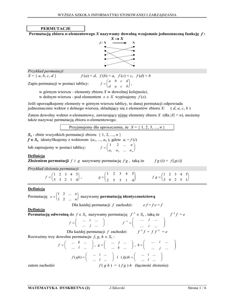 Permutacją zbioru n-elementowego X nazywamy dowolną wzajemnie jednoznaczną funkcję f :