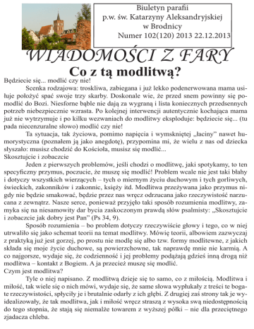 Biuletyn parafii p.w. św. Katarzyny Aleksandryjskiej w Brodnicy Numer 102(120) 2013 22.12.2013 WIADOMOŚCI Z FARY Co z tą modlitwą? Będziecie się... modlić czy nie! Scenka rodzajowa: troskliwa, zabiegana i już lekko podenerwowana mama usiłuje położyć spać swoje trzy skarby. Doskonale wie, że przed snem powinny się pomodlić do Bozi. Niesforne bąble nie dają za wygraną i lista koniecznych przedsennych potrzeb niebezpiecznie wzrasta. Po kolejnej interwencji autentycznie kochająca mama już nie wytrzymuje i po kilku wezwaniach do modlitwy eksploduje: będziecie się... (tu pada niecenzuralne słowo) modlić czy nie! Ta sytuacja, tak życiowa, pomimo napięcia i wymskniętej „łaciny” nawet humorystyczna (poznałem ją jako anegdotę), przypomina mi, że wielu z nas od dziecka słyszało: musisz chodzić do Kościoła, musisz się modlić... Skosztujcie i zobaczcie Jeden z pierwszych problemów, jeśli chodzi o modlitwę, jaki spotykamy, to ten specyficzny przymus, poczucie, że muszę się modlić! Problem wcale nie jest taki błahy i dotyczy wszystkich wierzących – tych o miernym życiu duchowym i tych gorliwych, świeckich, zakonników i zakonnic, księży itd. Modlitwa przeżywana jako przymus nigdy nie będzie smakować, będzie przez nas wręcz odrzucana jako rzeczywistość narzucana z zewnątrz. Nasze serce, ponieważ przyjęło taki sposób rozumienia modlitwy, zamyka się na niesamowity dar bycia zaskoczonym prawdą słów psalmisty: „Skosztujcie i zobaczcie jak dobry jest Pan” (Ps 34, 9). Sposób rozumienia – bo problem dotyczy rzeczywiście głowy i tego, co w niej utrwaliło się jako schemat teorii na temat modlitwy. Mówię teorii, albowiem zazwyczaj z praktyką już jest gorzej, po prostu nie modlę się albo tzw. formy modlitewne, z jakich składa się moje życie duchowe, są powierzchowne, tak naprawdę mnie nie karmią. A co najgorsze, wydaje się, że codzienność i jej problemy podążają gdzieś inną drogą niż modlitwa – kontakt z Bogiem. A ja przecież muszę się modlić. Czym jest modlitwa? Tyle o niej napisano. Z modlitwą dzieje się to samo, co z miłością. Modlitwa i miłość, tak wiele się o nich mówi, wydaje się, że same słowa wypłukały z treści te bogate rzeczywistości, spłyciły je i brutalnie odarły z ich głębi. Z drugiej zaś strony tak je wyidealizowały, że tak modlitwa, jak i miłość wręcz straszą z wysoka swą niedostępnością do tego stopnia, że stają się niemalże towarem z wyższej półki – nie dla przeciętnego zjadacza chleba. Modlitwa i miłość są sobie tak podobne, a modlitwa przeżywana jako przyjaźń (jedna z form miłości) z Tym, o którym wiemy, że nas miłuje (por. Ż 8, 5), uświadamia nam, że nie chodzi o formułkę mniej lub bardziej skuteczną, ale o relację z Kimś. Pomyśl, jak można być zmuszonym do miłości, przyjaźni? Kiedy stajemy wobec możliwości autentycznego spotkania, staje przed nami możliwość wyboru: chcę lub nie chcę tej relacji i nikt mnie nie zmusza do jej podjęcia. Tak też jest z modlitwą. Św. Teresa mówi, że sprawy duchowe należy traktować z szerokością, wolnością, bo jak każda relacja, tak i modlitwa potrzebuje przestrzeni, powietrza, świeżości, piękna, wolności. Wysokie wymagania Tak jak przyjaźń, również modlitwa stawia przed nami wysokie wymagania. Nie można być przyjacielem w połowie, tak na pół gwizdka. Każdy, kto miał szczęście doświadczyć w życiu autentycznej przyjaźni, wie, że pielęgnowanie i troska o przyjaźń domaga się wierności. Dla kogoś z zewnątrz może się to wydawać właśnie przymusem, ale nie dla prawdziwych przyjaciół. O przyjaźń trzeba dbać, wybór przyjaźni, miłości zakłada również wybór podjęcia trudu troski o tę relację. Wspomniana troska często będzie przeżywana przez nasze samolubne ego jako przymus, ale jesteśmy w stanie pokonać to toksyczne koncentrowanie się na sobie siłą miłości, przyjaźni, mocą dokonanego wyboru. I tak jest z modlitwą, kiedy odkrywamy, czym tak naprawdę jest modlitwa – spotkaniem z Jezusem, który nie bombarduje mnie lawiną słów, osądów, potępień, zna moje biedne życie, ale mówi mi autentycznie wieczne kocham cię! Wtedy kończy się etap męczących formułek, kończy się ten czas koszmarnego: „muszę się modlić”. Zaczynamy rozumieć cały absurd tego stwierdzenia, bo nie możemy sobie wyobrazić, że ktoś musi kochać drugiego człowieka, że ktoś musi być przyjacielem kogoś. Owszem może pojawić się to wielkie zakłamanie w życiu, kiedy ten drugi nie jest dla mnie człowiekiem, tylko źródłem jakiejś korzyści, staje się przedmiotem, który muszę mieć dla własnej korzyści… Ale to nie jest miłość, to nie jest przyjaźń! OGŁOSZENIA PARAFIALNE IV Niedziela Adwentu 22 grudnia 2013 1. Dziś IV niedziela Adwentu. Stoimy u progu Świąt Bożego Narodzenia. Pamiętajmy o duchowym przygotowaniu się na Tajemnicę Wcielenia. 2. Jutro w poniedziałek 23. grudnia odbędzie się spowiedź adwentowa w naszej parafii z udziałem zaproszonych księży. Rano od godz. 9.00 do 11.00 i po południu od godz. 16.00 do 19.00. Po Mszy św. o godz. 8.00 księża udadzą się z posługą sakramentalną do chorych. 3. We wtorek 24. Grudnia Wigilia. Zachęcamy zgodnie z polską tradycją i ze względu na wyjątkowy charakter tego dnia o zachowanie wstrzemięźliwości od pokarmów mięsnych. Niech nie zabraknie na naszych stołach: opłatka wigilijnego, świecy „Caritas” oraz stroika, które rozprowadza nasza młodzież ze wspólnoty „Uczniowie Słowa”. 4. Msze św. w Wigilię: o godz. 6.15 – roraty, 7.00, 8.00 i o godz. 16.00 Msza wigilijna z udziałem dzieci, które przynoszą figurki Dzieciątka Jezus do poświęcenia. Zasiądźmy do wigilijnego stołu pojednani z Panem Bogiem i bliźnimi. Pamiętajmy o potrzebujących, samotnych, chorych, o naszych zmarłych. Odczytajmy fragment Ewangelii