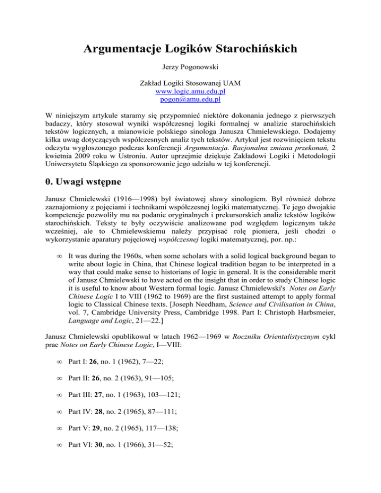 Argumentacje Logików Starochińskich Jerzy Pogonowski Zakład Logiki Stosowanej UAM www.logic.amu.edu.pl [email protected] W niniejszym artykule staramy się przypomnieć niektóre dokonania jednego z pierwszych badaczy, który stosował wyniki współczesnej logiki formalnej w analizie starochińskich tekstów logicznych, a mianowicie polskiego sinologa Janusza Chmielewskiego. Dodajemy kilka uwag dotyczących współczesnych analiz tych tekstów. Artykuł jest rozwinięciem tekstu odczytu wygłoszonego podczas konferencji Argumentacja. Racjonalna zmiana przekonań, 2 kwietnia 2009 roku w Ustroniu. Autor uprzejmie dziękuje Zakładowi Logiki i Metodologii Uniwersytetu Śląskiego za sponsorowanie jego udziału w tej konferencji. 0. Uwagi wstępne Janusz Chmielewski (1916—1998) był światowej sławy sinologiem. Był równieŜ dobrze zaznajomiony z pojęciami i technikami współczesnej logiki matematycznej. Te jego dwojakie kompetencje pozwoliły mu na podanie oryginalnych i prekursorskich analiz tekstów logików starochińskich. Teksty te były oczywiście analizowane pod względem logicznym takŜe wcześniej, ale to Chmielewskiemu naleŜy przypisać rolę pioniera, jeśli chodzi o wykorzystanie aparatury pojęciowej współczesnej logiki matematycznej, por. np.: • It was during the 1960s, when some scholars with a solid logical background began to write about logic in China, that Chinese logical tradition began to be interpreted in a way that could make sense to historians of logic in general. It is the considerable merit of Janusz Chmielewski to have acted on the insight that in order to study Chinese logic it is useful to know about Western formal logic. Janusz Chmielewski's Notes on Early Chinese Logic I to VIII (1962 to 1969) are the first sustained attempt to apply formal logic to Classical Chinese texts. [Joseph Needham, Science and Civilisation in China, vol. 7, Cambridge University Press, Cambridge 1998. Part I: Christoph Harbsmeier, Language and Logic, 21—22.] Janusz Chmielewski opublikował w latach 1962—1969 w Roczniku Orientalistycznym cykl prac Notes on Early Chinese Logic, I—VIII: • Part I: 26, no. 1 (1962), 7—22; • Part II: 26, no. 2 (1963), 91—105; • Part III: 27, no. 1 (1963), 103—121; • Part IV: 28, no. 2 (1965), 87—111; • Part V: 29, no. 2 (1965), 117—138; • Part VI: 30, no. 1 (1966), 31—52; • Part VII: 31, no. 1 (1968), 117—136; • Part VIII: 32, no. 2 (1969), 83—103. Obecnie Polska Akademia Nauk przygotowuje nowe wydanie tych prac w formie tekstu zwartego: Janusz Chmielewski Language and Logic in Ancient China. Collected Papers on the Chinese Language and Logic, M. Mejor (Ed.) Komitet Nauk Orientalistycznych Polskiej Akademii Nauk, Warszawa 2009. Warto zwrócić uwagę na inne jeszcze prace Janusza Chmielewskiego związane z omawianą problematyką, np.: • Język starochiński jako narzędzie rozumowania, Sprawozdania z prac naukowych Wydziału I Polskiej Akademii Nauk 8, 2, 1964, 108—133. • Concerning the Problem of Analogic Reasoning in Ancient China, Orientalistyczny 40, 2, 1979, 64—78. • Zasada redukcji do absurdu na tle porównawczym, Studia Semiotyczne XI, 1981, 21— 106. Rocznik Literatura dotycząca problematyki logiki starochińskiej jest olbrzymia. Ograniczmy się w tym miejscu do przywołania kilku monografii, które zawierają kompetentnie sporządzone bibliografie: • Graham, A.C. 1978. Later Mohist Logic, Ethics and Science. The Chinese University Press and the School of Oriental and African Studies, London and Hong Kong. • Graham, A.C. 1989. Disputers of the Tao. Philosophical Argument in Ancient China. Open Court, La Salle, Illinois. • Hansen, Ch. 1983. Language and Logic in Ancient China. University of Michigan Press, Ann Arbor. • Harbsmeier, Ch. 1998. Language and Logic, Part I in: Joseph Needham, Science and Civilisation in China, vol. 7, Cambridge University Press, Cambridge. Ostatnia z wymienionych monografii zawiera ustalenia najświeŜsze. Do niej teŜ będziemy się głównie odwoływać w części 4 niniejszego artykułu. W Polsce badania w tej dziedzinie prowadzone są w kilku ośrodkach. Wspomnijmy np. o Zakładzie Logiki Stosowanej UAM: • Anna Urywasz-Majewska, Wybrane podstawowe pojęcia staroŜytnej logiki chińskiej, Investigationes Linguisticae III, 1998, Institute of Linguistics, Adam Mickiewicz University, Poznań, 91—188. Tekst rozprawy magisterskiej obronionej w 1991 roku (promotor: Jerzy Pogonowski). • Sławomir Sikora, Dialog o białym koniu (Bai Ma Lun) — metodologiczne problemy badań porównawczych logiki chińskiej i zachodniej, Investigationes Linguisticae XIV, 2006, Institute of Linguistics, Adam Mickiewicz University, Poznań, 97—110. • Pan dr Sławomir Sikora prowadzi takŜe zajęcia Logika buddyjska oraz przygotowuje podręcznik poświęcony tej problematyce. PoniŜej przypomnimy niektóre ustalenia Chmielewskiego z wybranych jego prac dotyczących logiki starochińskiej. Na marginesie dodajmy, Ŝe takŜe prace czysto językoznawcze tego autora przyczyniają się do lepszego rozumienia dziejów refleksji logicznej w Chinach. Konieczne jest zapewne wyjaśnienie, co rozumiemy tu przez logikę starochińską. Ograniczamy się mianowicie do komentarza do wybranych rozumowań staroŜytnych filozofów chińskich z chu-tzu pai-chia 諸子百家 (czyli 100 szkół, (—770,—221)), Ŝyjących w Okresie Wiosen i Jesieni 春秋時代 (—722,—481) oraz Okresie Walczących Królestw 春秋 戰國時代 (początek —V,—221): • Lao Tzu 老子 (—604?,—500?), Chuang Tzu 莊子 (—370,—301), Taoiści 道家. • Konfucjusz 孔子 (—551,—479), Hsün Tzu 荀子 (—312,—230), klasyczny konfucjanizm 儒家. • Mo Tzu 墨子 (—470,—391), późni Moiści 墨家. • Hui Shi 惠施 (—IV), Kungsun Lung 公孫龍子 (—325,—250), Szkoła Nazw 名家 (Dialektycy). • Han Fei 韓非 (—280,—233), Legaliści 法家. Poza obszarem naszych z