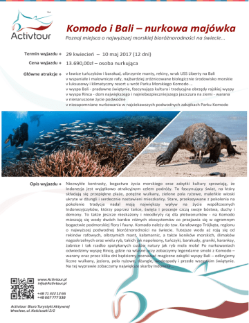 Komodo i Bali – nurkowa majówka Poznaj miejsca o najwyższej morskiej bioróżnorodności na świecie... Termin wyjazdu » 29 kwiecień – 10 maj 2017 (12 dni) Cena wyjazdu » 13.690,00zł – osoba nurkująca Główne atrakcje » v ławice tuńczyków i barakud, olbrzymie manty, rekiny, wrak USS Liberty na Bali v wspaniałe i malownicze rafy, najbardziej zróżnicowane biologicznie środowisko morskie v luksusowy i klimatyczny resort u wrót Parku Morskiego Komodo … v wyspa Bali - pradawne świątynie, fascynująca kultura i tradycyjne obrzędy rajskiej wyspy v wyspa Rinca - dom największego i najniebezpieczniejszego jaszczura na ziemi - warana v nienaruszone życie podwodne v niezapomniane nurkowania w najciekawszych podwodnych zakątkach Parku Komodo Opis wyjazdu » Niezwykłe kontrasty, bogactwo życia morskiego oraz zabytki kultury sprawiają, że Indonezja jest wyjątkowo atrakcyjnym celem podróży. To fascynujący świat, na który składają się przepiękne plaże, potężne wulkany, zielone pola ryżowe, maleńkie wioski ukryte w dżungli i serdecznie nastawieni mieszkańcy. Stare, przekazywane z pokolenia na pokolenie tradycje nadal mają największy wpływ na życie współczesnych Indonezyjczyków, którzy poprzez tańce, święta i procesje czczą swoje bóstwa, duchy i demony. To także jeszcze nieskażony i nieodkryty raj dla płetwonurków - na Komodo mieszają się wody dwóch bardzo różnych ekosystemów co przejawia się w ogromnym bogactwie podmorskiej flory i fauny. Komodo należy do tzw. Koralowego Trójkąta, regionu o najwyższej podwodnej bioróżnorodności na świecie. Tutejsze wody aż roją się od rekinów rafowych, olbrzymich mant, kałamarnic, a także koników morskich, ślimaków nagoskrzelnych oraz wielu ryb, takich jak napoleony, tuńczyki, barakudy, graniki, karanksy, żabnice i tak rzadko spotykanych cudów natury jak ryb mola mola! Po nurkowaniach odwiedzimy wyspę Rincę, gdzie na własne oczy zobaczymy legendarne smoki z Komodo – warany oraz przez klika dni będziemy poznawać magiczne zakątki wyspy Bali – odkryjemy liczne wulkany, jeziora, pola ryżowe, dżungle, wodospady i przede wszystkim świątynie. Na tej wyprawie zobaczymy największe skarby Indonezji... RAMOWY PROGRAM IMPREZY 29.04 sobota » Zbiórka na lotnisku w Warszawie na 2 godziny przed wylotem (istnieje możliwość organizacji przelotu z innych miast - szczegóły u organizatora), Oficjalne rozpoczęcie imprezy, Odprawa paszportowo – bagażowa, Wylot na Bali. 30.04 niedziela » Przylot do Denpasar w godzinach wieczornych, Transfer do hotelu nieopodal lotniska - w miejscowości Kuta, Zakwaterowanie w pokojach, Czas wolny, relaks po podróży. 01.05 poniedziałek » Wczesne śniadanie, Transfer na lotnisko w Denpasar, odprawa Przelot na wyspę Flores - do Labuan Bajo, Transfer łodzią do resortu na wyspie Sebayur – czas płynięcia ok. 1,5h, Zakwaterowanie w bungalowach, Lunch, Przygotowanie sprzętu nurkowego i omówienie, Popołudniowy check dive, Kolacja, czas wolny. 02.05 - 05.05 Pobudka i śniadanie, wtorek - piątek » 2 nurkowania z łodzi na terenie Parku Morskiego Komodo, Nurkowania zaczynają się około godziny 08:00 rano i kończą ok. godz. 13:00. Przerwa powierzchniowa odbywa się na pokładzie łodzi, pomiędzy nurkowaniami oferujemy lekkie przekąski oraz wodę. Powrót do resortu na lunch, Wolne popołudnie – istnieje możliwość organizacji dodatkowych nurkowań, Kolacja i czas wolny. !!! W dniu 04.05 – czwartek proponujemy popołudniową wycieczkę na wyspę Rinca. Będziecie mieli szansę na własne oczy poznać legendarne smoki z Komodo – warany. W tym dniu lunch przewidziany jest na pokładzie łodzi – podczas płynięcia na wyspę Rinca. Powrót z wycieczki zaplanowany jest na kolację. 06.05 sobota » Pobudka, śniadanie, Wykwaterowanie z resortu, Transfer łodzią (ok. 1,5h) na lotnisko w Labuan Bajo, Odprawa paszportowo - bagażowa, Przelot na wyspę Bali do Denpasar, Transfer do resortu w miejscowości Padangbai, Zakwaterowanie w pokojach i czas wolny. 07.05 niedziela » Śniadanie, Przygotowanie sprzętu nurkowego oraz omówienie w bazie nurkowej, Wyjazd na 2 nurkowania w rejonie Tulamben – w tym nurkowanie na słynnym wraku USS Liberty! Powrót do resortu w godzinach popołudniowych, czas wolny. 08.05 poniedziałek » Śniadanie, Ok. godziny 08:30 ruszymy w 9 godzinną podróż po najciekawszych zakątkach Bali, W programie min: uczestnictwo w przedstawieniu balijskiego tańca Barong, wizyta lokalnej fabryce wyrobów z drewna w wiosce Mas, ogrody wioski Seribatu, degustacja niezwykle drogiej kawy luwak - wytwarzanej z ziaren kawowca, które wydobywane są z odchodów z łaskunów, wypad w okolice góry Batur (najbardziej aktywnego wulkanu na Bali): przepiękne widoki, bujna przyroda, lunch w scenerii jeziora Batur, wizyta w świątyni Gunung Kawi – Sebatu (jednej z najstarszych świątyń na Bali). Powrót do resortu około godziny 16:00, czas wolny. 09.05 wtorek » Śniadanie, Wolne przedpołudnie na przygotowanie do powrotu do Polski, czas na zakup pamiątek, Wykwaterowanie z hotelu około godz. 13:00, Czas wolny, Wieczorny transfer na lotnisko w Denpasar, Odprawa paszportowo – bagażowa, Wieczorny wylot do Polski – lądowanie w Warszawie w dniu 10.05.2017 (środa), Zakończenie imprezy. Uwaga: * - dokładny program imprezy uzależniony jest od aktualnych godzin przelot. OPIS RESORTU KOMODO RESORT & DIVING CLUB **** Opis główny » Niezwykle klimatyczny i urokliwy ośrodek Komodo **** usytuowany jest na wyspie Sebayur, u wrót Parku Morskiego Komodo, bezpośrednio przy 350 metrowej plaży z piękną rafą koralową. Hotel został zbudowany w roku 2011. Oddalony jest on o 1,5 godziny podróży statkiem od portu Tilong na wyspie Flores, skąd w 10 minut można dojechać na lotnisko Komodo. Doskonała obsługa oraz najwyższej jakości wyposażenie zapewnią, że pobyt w hotelu Komodo Resort & Diving Club będzie niez