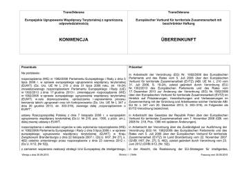 TransOderana TransOderana Europejskie Ugrupowanie Współpracy Terytorialnej z ograniczoną odpowiedzialnością Europäischer Verbund für territoriale Zusammenarbeit mit beschränkter Haftung KONWENCJA ÜBEREINKUNFT Preambuła Präambel Na podstawie: rozporządzenia (WE) nr 1082/2006 Parlamentu Europejskiego i Rady z dnia 5 lipca 2006 r. w sprawie europejskiego ugrupowania współpracy terytorialnej (EUWT) (Dz. Urz. UE Nr L 210 z dnia 31 lipca 2006 roku, str. 19-24) znowelizowanego rozporządzeniem Parlamentu Europejskiego i Rady (UE) nr 1302/2013 z dnia 17 grudnia 2013 r. zmieniającym rozporządzenie (WE) nr 1082/2006 w sprawie europejskiego ugrupowania współpracy terytorialnej (EUWT) w celu doprecyzowania, uproszczenia i usprawnienia procesu tworzenia takich ugrupowań oraz ich funkcjonowania (Dz. Urz. UE Nr L 347 z dnia 20 grudnia 2013, str. 303-319), zwanego dalej „rozporządzeniem o EUWT”, In Anbetracht der Verordnung (EG) Nr. 1082/2006 des Europäischen Parlaments und des Rates vom 5. Juli 2006 über den Europäischen Verbund für territoriale Zusammenarbeit (EVTZ) (ABl. UE Nr. L 210 vom 31. Juli 2006, S. 19-24), zuletzt geändert durch Verordnung (EU) Nr. 1302/2013 des Europäischen Parlaments und des Rates vom 17. Dezember 2013 zur Änderung der Verordnung (EG) Nr. 1082/2006 über den Europäischen Verbund für territoriale Zusammenarbeit (EVTZ) im Hinblick auf Präzisierungen, Vereinfachungen und Verbesserungen im Zusammenhang mit der Gründung und Arbeitsweise solcher Verbünde ABl. EU Nr. L 347 vom 20. Dezember 2013, S. 303–319), im Folgenden als EVTZ-Verordnung bezeichnet, ustawy Rzeczypospolitej Polskiej z dnia 7 listopada 2008 r. o europejskim ugrupowaniu współpracy terytorialnej (Dz.U. Nr 218, poz. 1390, z późn. zm.), dalej zwanej ustawą o EUWT, in Anbetracht des Gesetzes der Republik Polen über den Europäischen Verbund für territoriale Zusammenarbeit vom 7. November 2008 (GBl. von 2008 Nr. 218, Pos. 1390 mit späteren Änderungen), rozporządzenia o właściwości organów w celu wykonania rozporządzenia (WE) nr 1082/2006 Parlamentu Europejskiego i Rady z dnia 5 lipca 2006 r. w sprawie europejskiego ugrupowania współpracy terytorialnej (EUWT) w Kraju Związkowym Brandenburgia z dnia 22 listopada 2007 r. (Dz.U. II/07, [Nr 27], s. 482) ostatnio zmienionego przez rozporządzenie z dnia 23 czerwca 2012 r. (Dz.U. II/12, [Nr 52]), in Anbetracht der Verordnung über die Zuständigkeit zur Ausführung der Verordnung (EG) Nr. 1082/2006 des Europäischen Parlaments und des Rates vom 5. Juli 2006 über den Europäischen Verbund für territoriale Zusammenarbeit (EVTZ) im Land Brandenburg vom 22. November 2007 (GVBl. II/07, [Nr. 27], S. 482), zuletzt geändert durch Verordnung vom 23. Juni 2012 (GVBl.II/12, [Nr. 52]), z zamiarem wspierania realizacji strategii Unii Europejskiej dla inteligentnego, in der Absicht, die Realisierung der EU-Strategien für intelligentes, Wersja z dnia 30.09.2015 Strona | 1 | Seite Fassung vom 30.09.2015 zrównoważonego i zintegrowanego wzrostu i spójności, nachhaltiges und unterstützen, integratives Wachstum sowie für Kohäsion zu przy uwzględnieniu istniejącej współpracy polsko-niemieckiej w ramach Europejskiej Współpracy Terytorialnej, in Beachtung der existierenden deutsch-polnischen Kooperationen im Rahmen der Europäischen Territorialen Zusammenarbeit, z zamiarem ścisłej współpracy z Euroregionem Pro Europa Viadrina ku polepszeniu jakości współpracy terytorialnej, in der Absicht, eng mit der Euroregion Pro Europa Viadrina zu kooperieren, um die territoriale Zusammenarbeit zu fördern, z dążeniem, aby wspierać i realizować wspólne przedsięwzięcia o charakterze transgranicznym w ramach kompetencji w ustalonych z góry obszarach tematycznych, in dem Bestreben, gemeinsame grenzüberschreitende Vorhaben im Rahmen der Zuständigkeiten in den vorab bestimmten Themenbereichen zu realisieren, my, niżej wymienione gminy i powiaty z Rzeczypospolitej Polskiej i Republiki Federalnej Niemiec oraz Państwowa Wyższa Szkoła Zawodowa w Gorzowie Wielkopolskim tworzymy ugrupowanie o nazwie TransOderana Europejskie Ugrupowanie Współpracy Terytorialnej z ograniczoną odpowiedzialnością, zwane dalej „Ugrupowaniem” i przyjmujemy niniejszą Konwencję. errichten wir, die unten genannten Städte, Gemeinden und Landkreise der Republik Polen und der Bundesrepublik Deutschland sowie die Staatliche Fachhochschule in Gorzów Wielkopolski, hiermit den Europäischen Verbund für territoriale Zusammenarbeit mit beschränkter Haftung mit dem Namen „TransOderana“ (im folgenden Verbund) und beschließen diese Übereinkunft. Artykuł 1. [Nazwa Ugrupowania] Artikel 1 [Name des Verbundes] 1. Der Name des Europäischen Verbundes für territoriale Zusammenarbeit lautet: 1. Nazwa Ugrupowania brzmi: 1) w języku polskim: TransOderana Europejskie Ugrupowanie Współpracy Terytorialnej z ograniczoną odpowiedzialnością; 2) w języku niemieckim: TransOderana Europäischer Verbund für territoriale Zusammenarbeit mit beschränkter Haftung; 3) w języku angielskim: TransOderana European Grouping of Territorial Cooperation Limited Liability. 1) in deutscher Sprache: TransOderana Europäischer Verbund für territoriale Zusammenarbeit mit beschränkter Haftung; 2) in polnischer Sprache: TransOderana Europejskie Ugrupowanie Współpracy Terytorialnej z ograniczoną odpowiedzialnością; 3) in englischer Sprache: TransOderana European Grouping of Territorial Cooperation Limited Liability. 2. Ugrupowanie może używać nazwy skróconej. Nazwa skrócona brzmi: 2. Der Verbund kann eine Abkürzung verwenden. Diese Abkürzung lautet: 1) w języku polskim: TransOderana EUWT z o.o., 1) in polnischer Sprache: TransOderana EUWT z o.o., 2) w języku niemieckim: TransOderana EVTZ mbH, 2) in deutscher Sprache: TransOderana EVTZ mbH, 3) w języku angielskim: EGTC TransOderana Ltd. 3) in englischer Sprache: EGTC TransOderana Ltd. Wersja z dnia 30.09.2015