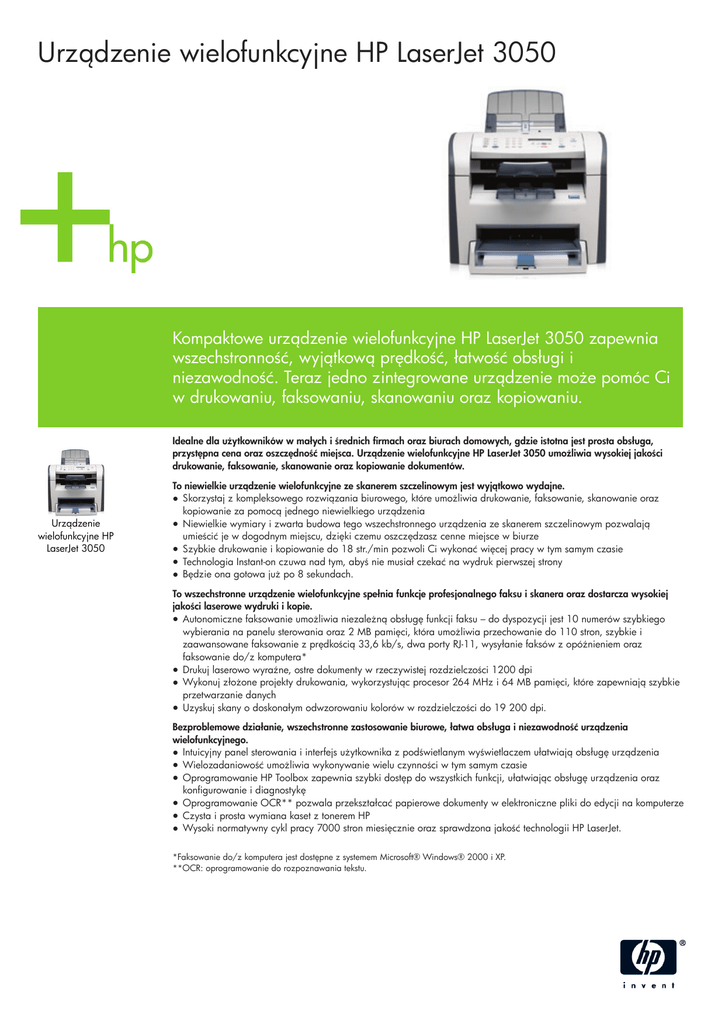 Urządzenie wielofunkcyjne HP LaserJet 3050 Kompaktowe urządzenie wielofunkcyjne HP LaserJet 3050 zapewnia wszechstronność, wyjątkową prędkość, łatwość obsługi i niezawodność. Teraz jedno zintegrowane urządzenie może pomóc Ci w drukowaniu, faksowaniu, skanowaniu oraz kopiowaniu. Idealne dla użytkowników w małych i średnich firmach oraz biurach domowych, gdzie istotna jest prosta obsługa, przystępna cena oraz oszczędność miejsca. Urządzenie wielofunkcyjne HP LaserJet 3050 umożliwia wysokiej jakości drukowanie, faksowanie, skanowanie oraz kopiowanie dokumentów. Urządzenie wielofunkcyjne HP LaserJet 3050 To niewielkie urządzenie wielofunkcyjne ze skanerem szczelinowym jest wyjątkowo wydajne. ● Skorzystaj z kompleksowego rozwiązania biurowego, które umożliwia drukowanie, faksowanie, skanowanie oraz kopiowanie za pomocą jednego niewielkiego urządzenia ● Niewielkie wymiary i zwarta budowa tego wszechstronnego urządzenia ze skanerem szczelinowym pozwalają umieścić je w dogodnym miejscu, dzięki czemu oszczędzasz cenne miejsce w biurze ● Szybkie drukowanie i kopiowanie do 18 str./min pozwoli Ci wykonać więcej pracy w tym samym czasie ● Technologia Instant-on czuwa nad tym, abyś nie musiał czekać na wydruk pierwszej strony ● Będzie ona gotowa już po 8 sekundach. To wszechstronne urządzenie wielofunkcyjne spełnia funkcje profesjonalnego faksu i skanera oraz dostarcza wysokiej jakości laserowe wydruki i kopie. ● Autonomiczne faksowanie umożliwia niezależną obsługę funkcji faksu – do dyspozycji jest 10 numerów szybkiego wybierania na panelu sterowania oraz 2 MB pamięci, która umożliwia przechowanie do 110 stron, szybkie i zaawansowane faksowanie z prędkością 33,6 kb/s, dwa porty RJ-11, wysyłanie faksów z opóźnieniem oraz faksowanie do/z komputera* ● Drukuj laserowo wyraźne, ostre dokumenty w rzeczywistej rozdzielczości 1200 dpi ● Wykonuj złożone projekty drukowania, wykorzystując procesor 264 MHz i 64 MB pamięci, które zapewniają szybkie przetwarzanie danych ● Uzyskuj skany o doskonałym odwzorowaniu kolorów w rozdzielczości do 19 200 dpi. Bezproblemowe działanie, wszechstronne zastosowanie biurowe, łatwa obsługa i niezawodność urządzenia wielofunkcyjnego. ● Intuicyjny panel sterowania i interfejs użytkownika z podświetlanym wyświetlaczem ułatwiają obsługę urządzenia ● Wielozadaniowość umożliwia wykonywanie wielu czynności w tym samym czasie ● Oprogramowanie HP Toolbox zapewnia szybki dostęp do wszystkich funkcji, ułatwiając obsługę urządzenia oraz konfigurowanie i diagnostykę ● Oprogramowanie OCR** pozwala przekształcać papierowe dokumenty w elektroniczne pliki do edycji na komputerze ● Czysta i prosta wymiana kaset z tonerem HP ● Wysoki normatywny cykl pracy 7000 stron miesięcznie oraz sprawdzona jakość technologii HP LaserJet. *Faksowanie do/z komputera jest dostępne z systemem Microsoft® Windows® 2000 i XP. **OCR: oprogramowanie do rozpoznawania tekstu. Specyfikacja techniczna Technologia druku Prędkość druku Procesor Pamięć Druk Faks Skan Kopia Obsługa nośników Nośniki Interfejsy Obsługiwane systemy operacyjne zgodność z sieciowymi systemami operacyjnymi Minimalne wymagania systemowe Monochromatyczny druk laserowy Do 18 str./min. Czas wydruku pierwszej strony w czerni: 8 sekund. dla druku (technologia Instant-on eliminuje konieczność nagrzewania po „gorącym" lub „zimnym" starcie) (Prędkość druku zależy od konfiguracji systemu, wykorzystywanego oprogramowania i stopnia złożoności drukowanych prac) 264 MHz. Motorola Coldfire® wersja 4e 64 MB Jakość Do 1200 x 1200 dpi Języki drukarki HP PCL 6, HP PCL 5e, emulacja HP Postscript Level 3 Drukowanie ekonomiczne Druk z użyciem mniejszej ilości tonera w trybie Economode, druk kilku zmniejszonych stron na jednym arkuszu Czcionki PCL: 45 skalowalnych czcionek TrueType, PostScript: 35 skalowalnych czcionek TrueType Cykl pracy Do 7000 stron na miesiąc Marginesy druku (mm) Góra: 4 mm. Lewo: 4 mm. Prawo: 4 mm. Spód: 4 mm Funkcje zaawansowane Ręczny druk dwustronny, druk broszur, druk kilku zmniejszonych stron na jednym arkuszu, układanie wydruków, znaki wodne, instalacja tylko sterownika drukarki, tryb Economode zmniejszający zużycie tonera, obsługa różnych rodzajów i formatów papieru Prędkość modemu 33,6 kb/s (3 sekundy na stronę) Zgodność telekomunikacyjna TBR-21: 1998; EG 201 121: 1998, FCC część 68 Pamięć faksu Do 110 stron (2 MB) Rozdzielczość faksu Standardowo: 203 x 98 dpi. Najwyższa: 203 x 196 dpi. Superfine: 300 x 300 dpi. Zdjęcie: 300 x 300 dpi (półtony) Szybkie wybieranie Do 120 (119 numerów grupowych). 10 przycisków szybkiego wybierania na panelu sterowania Typ Podawanie arkuszy. Skanowanie kolorowe: Tak Rozdzielczość skanowania Optyczny: do 600 dpi. Rozszerzony: Do 19 200 x 19 200 dpi Głębia bitowa 24-bitowy Poziomy odcieni szarości 256 Wersja Twain Zgodny z TWAIN Wersja 1.9 Powierzchnia skanowalna Minimalny format nośnika: 74 x 105 mm. Maksymalny format nośnika: 216 x 381 mm Marginesy skanowanych Lewo: 4 mm. Góra: 4 mm. Prawo: 4 mm. Spód: 4 mm obiektów Funkcje zaawansowane Intuicyjny panel sterowania z przyciskiem skanowania do folderu lub poczty elektronicznej bezpośrednio z urządzenia (po skonfigurowaniu za pomocą dołączonego oprogramowania), oprogramowanie, automatyczny podajnik dokumentów na 30 arkuszy Prędkość kopiowania Do 18 str./min Rozdzielczość kopiowania do 600 dpi Wiele kopii Do 99 kopii (z automatycznym układaniem) Powiększenie/zmniejszenie 25-400% (co 1%) Funkcje zaawansowane Do 99 kopii wielokrotnych, układanie, zmniejszanie/powiększanie w zakresie 25-400% (z programowaniem rozmiaru strony), dopasowywanie do strony, 2 lub 4 strony na jednym arkuszu, kontrast (ustawienie jasności kopii), rozdzielczość (jakość kopii) Wejście: Pojemność Waga Rozmiar Podajnik 1 Do 10 arkuszy od 60 do 163 g/m2 A4, A