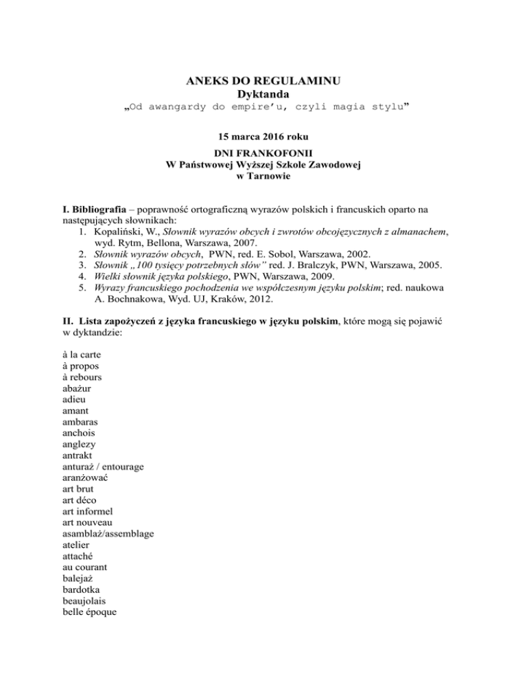 ANEKS DO REGULAMINU Dyktanda „Od awangardy do empire’u, czyli magia stylu” 15 marca 2016 roku DNI FRANKOFONII W Państwowej Wyższej Szkole Zawodowej w Tarnowie I. Bibliografia – poprawność ortograficzną wyrazów polskich i francuskich oparto na następujących słownikach: 1. Kopaliński, W., Słownik wyrazów obcych i zwrotów obcojęzycznych z almanachem, wyd. Rytm, Bellona, Warszawa, 2007. 2. Słownik wyrazów obcych, PWN, red. E. Sobol, Warszawa, 2002. 3. Słownik „100 tysięcy potrzebnych słów” red. J. Bralczyk, PWN, Warszawa, 2005. 4. Wielki słownik języka polskiego, PWN, Warszawa, 2009. 5. Wyrazy francuskiego pochodzenia we współczesnym języku polskim; red. naukowa A. Bochnakowa, Wyd. UJ, Kraków, 2012. II. Lista zapożyczeń z języka francuskiego w języku polskim, które mogą się pojawić w dyktandzie: à la carte à propos à rebours abażur adieu amant ambaras anchois anglezy antrakt anturaż / entourage aranżować art brut art déco art informel art nouveau asamblaż/assemblage atelier attaché au courant balejaż bardotka beaujolais belle époque beż bohema bon mot bon ton bon vivant bonjour bonżurka bouclé buduar bukinista bulwersować butonierka café frappé camembert Carrefour carte blanche chapeau bas clou programu comme il faut croissanty cydr de volaille déjà vu démodé desusy dezabil dezawuować donżuan dossier dusery ebenisteria emablować empire emploi en bloc en face en passant enfant terrible entrée epatować epuzer espadryle etażerka etiuda exposé fanfaron farmazony farsz fason fatyga faux pas feblik femme fatale feta filet sauté filut fin de siècle finisaż fondue foyer fromaż / fromage frykasy frymuśny frywolitka fular furażerka galanteria garderoba garsonka genre gipiura godet grand prix grawiura gros haute couture hossa idée fixe imaż / image impas impresjonizm impromptu jury kabotyn kajet kalambur kares koafiura kolaż/collage kolor écru komeraże konduita koneser kontenans kostyczny kuraż lansować leseferyzm lilaróż loża majonez makijaż maneż manikiur / manucure mariaż marszand melanż menu merci metresa minoderia negliż nuworysz panneau pantalony pardon par excellence Paris parweniusz pas passé passe-partout pendant peniuar pepiniera persyflaż plateau plaża pointa/puenta porte-parole poste restante pot-pourri pozer prodiż profit purysta randka ratatuja rekonesans rendez-vous rentier résumé savoir-vivre sakwojaż socjeta sos spécialité de la maison spektakl variétés sufler suwenir /souvenir szezlong szmizjerka tartinka tiul tête-à-tête toaleta tournée trezor trotuar va banque vis-à-vis voilà werwa winieta wojaż woltyżer wernisaż winegret wodewil żabot żakard żakiet żargon żenować żorżeta żurnal żyrandol