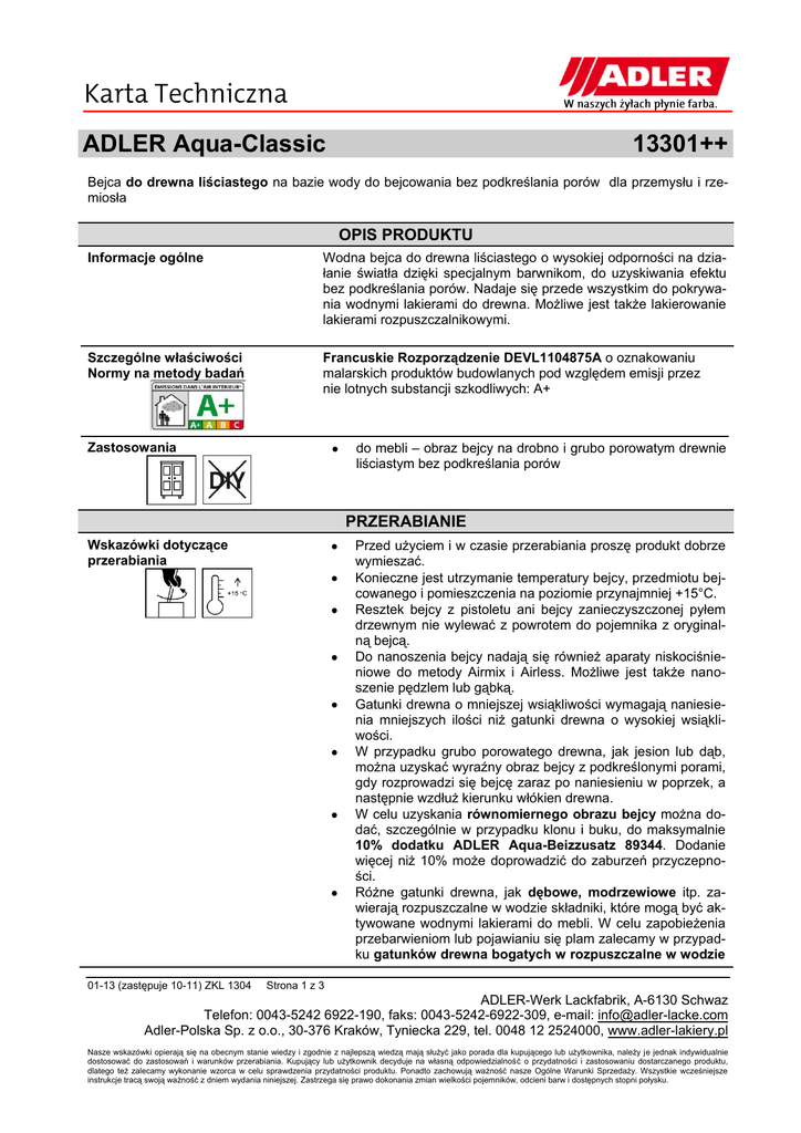ADLER Aqua-Classic 13301++ Bejca do drewna liściastego na bazie wody do bejcowania bez podkreślania porów dla przemysłu i rzemiosła OPIS PRODUKTU Informacje ogólne Wodna bejca do drewna liściastego o wysokiej odporności na działanie światła dzięki specjalnym barwnikom, do uzyskiwania efektu bez podkreślania porów. Nadaje się przede wszystkim do pokrywania wodnymi lakierami do drewna. Możliwe jest także lakierowanie lakierami rozpuszczalnikowymi. Szczególne właściwości Normy na metody badań Francuskie Rozporządzenie DEVL1104875A o oznakowaniu malarskich produktów budowlanych pod względem emisji przez nie lotnych substancji szkodliwych: A+ do mebli – obraz bejcy na drobno i grubo porowatym drewnie liściastym bez podkreślania porów Zastosowania PRZERABIANIE Wskazówki dotyczące przerabiania 01-13 (zastępuje 10-11) ZKL 1304 Przed użyciem i w czasie przerabiania proszę produkt dobrze wymieszać. Konieczne jest utrzymanie temperatury bejcy, przedmiotu bejcowanego i pomieszczenia na poziomie przynajmniej +15°C. Resztek bejcy z pistoletu ani bejcy zanieczyszczonej pyłem drzewnym nie wylewać z powrotem do pojemnika z oryginalną bejcą. Do nanoszenia bejcy nadają się również aparaty niskociśnieniowe do metody Airmix i Airless. Możliwe jest także nanoszenie pędzlem lub gąbką. Gatunki drewna o mniejszej wsiąkliwości wymagają naniesienia mniejszych ilości niż gatunki drewna o wysokiej wsiąkliwości. W przypadku grubo porowatego drewna, jak jesion lub dąb, można uzyskać wyraźny obraz bejcy z podkreślonymi porami, gdy rozprowadzi się bejcę zaraz po naniesieniu w poprzek, a następnie wzdłuż kierunku włókien drewna. W celu uzyskania równomiernego obrazu bejcy można dodać, szczególnie w przypadku klonu i buku, do maksymalnie 10% dodatku ADLER Aqua-Beizzusatz 89344. Dodanie więcej niż 10% może doprowadzić do zaburzeń przyczepności. Różne gatunki drewna, jak dębowe, modrzewiowe itp. zawierają rozpuszczalne w wodzie składniki, które mogą być aktywowane wodnymi lakierami do mebli. W celu zapobieżenia przebarwieniom lub pojawianiu się plam zalecamy w przypadku gatunków drewna bogatych w rozpuszczalne w wodzie Strona 1 z 3 ADLER-Werk Lackfabrik, A-6130 Schwaz Telefon: 0043-5242 6922-190, faks: 0043-5242-6922-309, e-mail: [email protected] Adler-Polska Sp. z o.o., 30-376 Kraków, Tyniecka 229, tel. 0048 12 2524000, www.adler-lakiery.pl Nasze wskazówki opierają się na obecnym stanie wiedzy i zgodnie z najlepszą wiedzą mają służyć jako porada dla kupującego lub użytkownika, należy je jednak indywidualnie dostosować do zastosowań i warunków przerabiania. Kupujący lub użytkownik decyduje na własną odpowiedzialność o przydatności i zastosowaniu dostarczanego produktu, dlatego też zalecamy wykonanie wzorca w celu sprawdzenia przydatności produktu. Ponadto zachowują ważność nasze Ogólne Warunki Sprzedaży. Wszystkie wcześniejsze instrukcje tracą swoją ważność z dniem wydania niniejszej. Zastrzega się prawo dokonania zmian wielkości pojemników, odcieni barw i dostępnych stopni połysku. ADLER Aqua-Classic 13301++ składniki wstępne zagruntowanie za pomocą środka ADLER PUR-Primer 25291. Proszę przestrzegać naszych „Wytycznych do pracy przy bejcowaniu drewna”. Proszę przestrzegać zaleceń podanych w kartach technicznych produktów. Techniki nanoszenia Metoda nanoszenia Pistolet kubkowy Dysza (ø mm) 1,5 Ciśnienie natrysku (bar) 2,0 – 2,5 Wydajność na pojedyncze ok. 8 naniesienie (m2/l)1) 1) Wydajność z uwzględnieniem dodatku rozcieńczalnika i straty przy natrysku Kształt, jakość podłoża i wilgotność drewna wpływają na zużycie / wydajność. Dokładne dane można uzyskać tylko przeprowadzając wcześniej próbę nanoszenia. Czasy schnięcia (w 23°C i przy 50% wilgotności względnej) Nakładanie lakieru chemicznego po ok.12 godz. Podane czasy są tylko orientacyjne. Schnięcie zależy od rodzaju drewna, grubości warstwy, temperatury, wymiany powietrza i wilgotności względnej. Unikać bezpośredniego działania promieni słonecznych (zbyt szybkie wysychanie). Czyszczenie narzędzi Zaraz po użyciu narzędzia pracy oczyszczać wodą lub Aqua Cleaner 80080. PODŁOŻE Rodzaj podłoża Drewno liściaste, drobno i grubo porowate Właściwości podłoża Podłoże musi być suche, czyste, wytrzymałe, wolne od tłuszczu i wosków oraz wolne od pyłu drzewnego. Przygotowanie podłoża Papier o granulacji 150 – 180. Korzystne jest zwilżanie drewna szlifowanego i po wyschnięciu szlifowanie na gładko papierem o granulacji 180 – 220; w przypadku litego drewna dębowego wykonanie tej operacji jest bezwzględnie konieczne. WYKONANIE POWŁOKI Nanoszenie bejcy Bejcę nanosić równomiernie 2x wzdłuż włókien drewna, stosując lekki nadmiar, tak aby powierzchnia wyglądała na lekko wilgotną. Wykończenie końcowe Bejcę Aqua-Classic 13301++ można pokryć zarówno lakierami wodorozcieńczalnymi jak i chemicznymi. Dla jasnych odcieni bejc zaleca się zasadniczo zastosowanie lakierów odpornych na działanie światła np. ADLER Legnopur 26211++ lub ADLER Aqua-Rapid CFB 30451++. W przypadku niezastosowania lakieru odpornego na światło należy liczyć się z tym, że kolor może nieznacznie ulec zżółknięciu. Przy starzeniu efekt ten ulega wzmocnieniu. 01-13 (zastępuje 10-11) Strona 2 z 3 ADLER Aqua-Classic 13301++ INFORMACJE DOTYCZĄCE ZAMÓWIENIA 1 l, 5 l Forma dostawy Odcienie barwy / stopnie połysku Farblos Bambus Vanille Lichtbraun Curry Safran Rose 13301 13302 13303 13304 13305 13306 13307 Odcienie czereśniowe: Natur 13430 Bernstein 13431 Gold 13432 Cherry Salbei Thymian Chilli Nussbaum dunkel Nussbaum hell Grafit 13308 13309 13310 13311 13312 13313 13314 Antik Maron 13433 13434 Wszystkie odcienie barwy można ze sobą nawzajem mieszać i w razie potrzeby rozcieńczać bejcą bezbarwną ADLER Aqua-Classic Farblos 13301. W przypadku silnego rozcieńczenia może