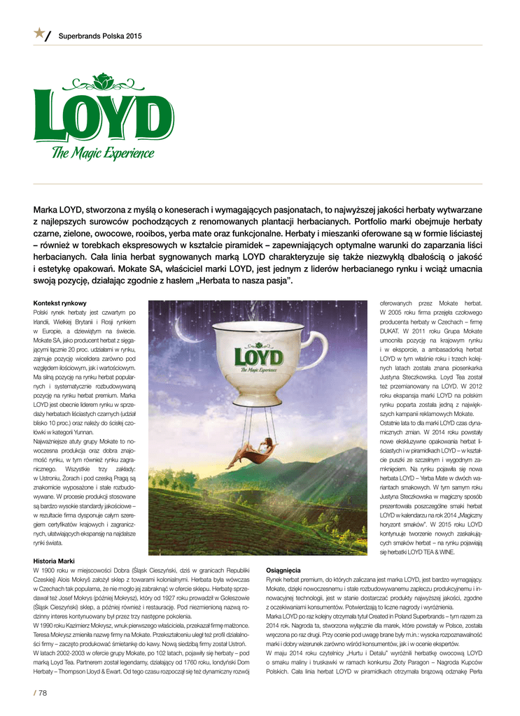 Superbrands Polska 2015 Marka LOYD, stworzona z myślą o koneserach i wymagających pasjonatach, to najwyższej jakości herbaty wytwarzane z najlepszych surowców pochodzących z renomowanych plantacji herbacianych. Portfolio marki obejmuje herbaty czarne, zielone, owocowe, rooibos, yerba mate oraz funkcjonalne. Herbaty i mieszanki oferowane są w formie liściastej – również w torebkach ekspresowych w kształcie piramidek – zapewniających optymalne warunki do zaparzania liści herbacianych. Cała linia herbat sygnowanych marką LOYD charakteryzuje się także niezwykłą dbałością o jakość i estetykę opakowań. Mokate SA, właściciel marki LOYD, jest jednym z liderów herbacianego rynku i wciąż umacnia swoją pozycję, działając zgodnie z hasłem „Herbata to nasza pasja”. Kontekst rynkowy Polski rynek herbaty jest czwartym po Irlandii, Wielkiej Brytanii i Rosji rynkiem w Europie, a dziewiątym na świecie. Mokate SA, jako producent herbat z sięgającymi łącznie 20 proc. udziałami w rynku, zajmuje pozycję wicelidera zarówno pod względem ilościowym, jak i wartościowym. Ma silną pozycję na rynku herbat popularnych i systematycznie rozbudowywaną pozycję na rynku herbat premium. Marka LOYD jest obecnie liderem rynku w sprzedaży herbatach liściastych czarnych (udział blisko 10 proc.) oraz należy do ścisłej czołówki w kategorii Yunnan. Najważniejsze atuty grupy Mokate to nowoczesna produkcja oraz dobra znajomość rynku, w tym również rynku zagranicznego. Wszystkie trzy zakłady: w Ustroniu, Żorach i pod czeską Pragą są znakomicie wyposażone i stale rozbudowywane. W procesie produkcji stosowane są bardzo wysokie standardy jakościowe – w rezultacie firma dysponuje całym szeregiem certyfikatów krajowych i zagranicznych, ułatwiających ekspansję na najdalsze rynki świata. Historia Marki W 1900 roku w miejscowości Dobra (Śląsk Cieszyński, dziś w granicach Republiki Czeskiej) Alois Mokryš założył sklep z towarami kolonialnymi. Herbata była wówczas w Czechach tak popularna, że nie mogło jej zabraknąć w ofercie sklepu. Herbatę sprzedawał też Josef Mokrys (później Mokrysz), który od 1927 roku prowadził w Goleszowie (Śląsk Cieszyński) sklep, a później również i restaurację. Pod niezmienioną nazwą rodzinny interes kontynuowany był przez trzy następne pokolenia. W 1990 roku Kazimierz Mokrysz, wnuk pierwszego właściciela, przekazał firmę małżonce. Teresa Mokrysz zmieniła nazwę firmy na Mokate. Przekształceniu uległ też profil działalności firmy – zaczęto produkować śmietankę do kawy. Nową siedzibą firmy został Ustroń. W latach 2002-2003 w ofercie grupy Mokate, po 102 latach, pojawiły się herbaty – pod marką Loyd Tea. Partnerem został legendarny, działający od 1760 roku, londyński Dom Herbaty – Thompson Lloyd & Ewart. Od tego czasu rozpoczął się też dynamiczny rozwój / 78 oferowanych przez Mokate herbat. W 2005 roku firma przejęła czołowego producenta herbaty w Czechach – firmę DUKAT. W 2011 roku Grupa Mokate umocniła pozycję na krajowym rynku i w eksporcie, a ambasadorką herbat LOYD w tym właśnie roku i trzech kolejnych latach została znana piosenkarka Justyna Steczkowska. Loyd Tea został też przemianowany na LOYD. W 2012 roku ekspansja marki LOYD na polskim rynku poparta została jedną z największych kampanii reklamowych Mokate. Ostatnie lata to dla marki LOYD czas dynamicznych zmian. W 2014 roku powstały nowe ekskluzywne opakowania herbat liściastych i w piramidkach LOYD – w kształcie puszki ze szczelnym i wygodnym zamknięciem. Na rynku pojawiła się nowa herbata LOYD – Yerba Mate w dwóch wariantach smakowych. W tym samym roku Justyna Steczkowska w magiczny sposób prezentowała poszczególne smaki herbat LOYD w kalendarzu na rok 2014 „Magiczny horyzont smaków”. W 2015 roku LOYD kontynuuje tworzenie nowych zaskakujących smaków herbat – na rynku pojawiają się herbatki LOYD TEA & WINE. Osiągnięcia Rynek herbat premium, do których zaliczana jest marka LOYD, jest bardzo wymagający. Mokate, dzięki nowoczesnemu i stale rozbudowywanemu zapleczu produkcyjnemu i innowacyjnej technologii, jest w stanie dostarczać produkty najwyższej jakości, zgodne z oczekiwaniami konsumentów. Potwierdzają to liczne nagrody i wyróżnienia. Marka LOYD po raz kolejny otrzymała tytuł Created in Poland Superbrands – tym razem za 2014 rok. Nagroda ta, stworzona wyłącznie dla marek, które powstały w Polsce, została wręczona po raz drugi. Przy ocenie pod uwagę brane były m.in.: wysoka rozpoznawalność marki i dobry wizerunek zarówno wśród konsumentów, jak i w ocenie ekspertów. W maju 2014 roku czytelnicy „Hurtu i Detalu” wyróżnili herbatkę owocową LOYD o smaku maliny i truskawki w ramach konkursu Złoty Paragon – Nagroda Kupców Polskich. Cała linia herbat LOYD w piramidkach otrzymała brązową odznakę Perła loyd Rynku FMCG 2014. Inicjatorami i organizatorami projektu są miesięczniki „Wiadomości Handlowe” i „Wiadomości Kosmetyczne”. Reklama „LOYD – herbata z nutą magii” otrzymała Złotą Ideę – pierwszą nagrodę w kategorii Produkty XXIII edycji konkursu reklamy Idea Awards, czyli jedynego konkursu w Polsce nagradzającego reklamodawców, a w szczególności – zespoły odpowiadające za kreację. Oferta Działający zgodnie z hasłem „Herbata to nasza pasja”, team herbaciany Mokate dobrze wie, że aby tworzyć nowe, wyjątkowe smaki herbat, które skradną serca konsumentów, trzeba odnaleźć w sobie pasję. Wbrew powszechnym opiniom, produkcja herbaty wymaga olbrzymiej wiedzy, doświadczenia, a także cierpliwości. Herbata to wyjątkowy surowiec – istnieją setki różnych jej rodzajów, smak herbacianego naparu zależy od terminu zbioru suszu, czy sposobu obróbki herbacianego liścia. To wszystko ma ogromny wpływ na produkt finalny. Dzięki temu, że herbaty LOYD są tworzone z prawdziwą