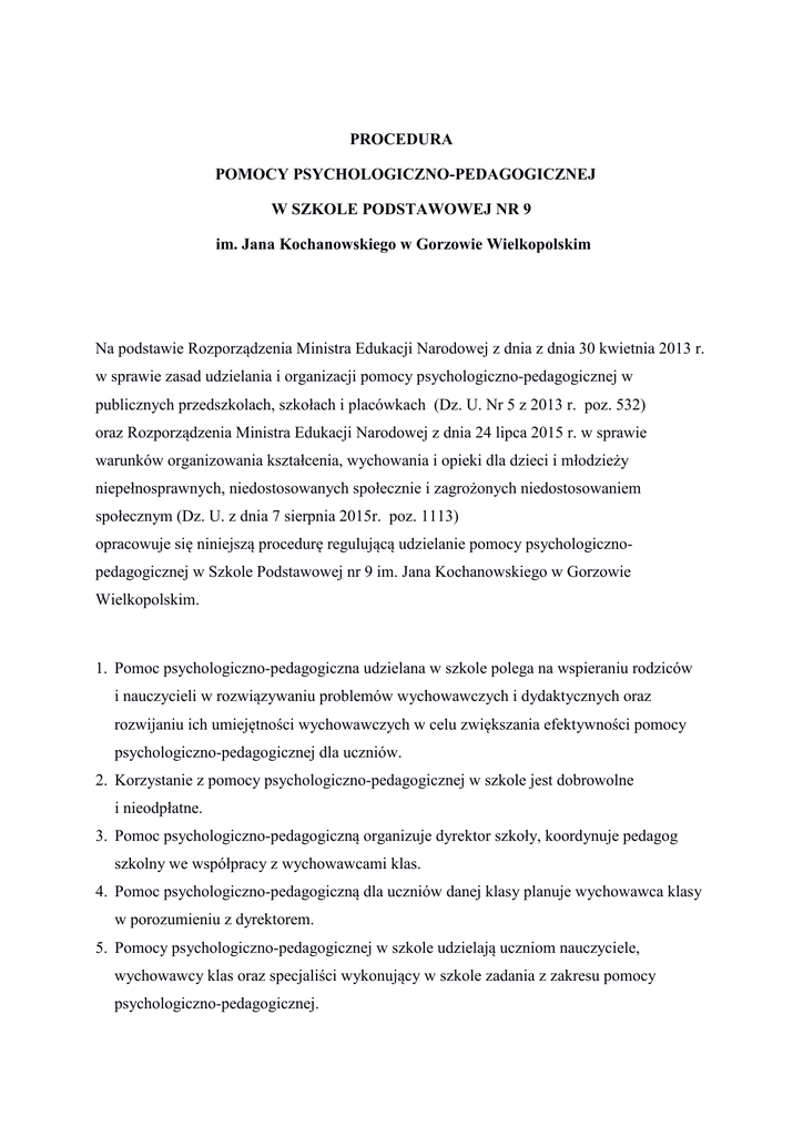 PROCEDURA POMOCY PSYCHOLOGICZNO-PEDAGOGICZNEJ W SZKOLE PODSTAWOWEJ NR 9 im. Jana Kochanowskiego w Gorzowie Wielkopolskim Na podstawie Rozporządzenia Ministra Edukacji Narodowej z dnia z dnia 30 kwietnia 2013 r. w sprawie zasad udzielania i organizacji pomocy psychologiczno-pedagogicznej w publicznych przedszkolach, szkołach i placówkach (Dz. U. Nr 5 z 2013 r. poz. 532) oraz Rozporządzenia Ministra Edukacji Narodowej z dnia 24 lipca 2015 r. w sprawie warunków organizowania kształcenia, wychowania i opieki dla dzieci i młodzieży niepełnosprawnych, niedostosowanych społecznie i zagrożonych niedostosowaniem społecznym (Dz. U. z dnia 7 sierpnia 2015r. poz. 1113) opracowuje się niniejszą procedurę regulującą udzielanie pomocy psychologicznopedagogicznej w Szkole Podstawowej nr 9 im. Jana Kochanowskiego w Gorzowie Wielkopolskim. 1. Pomoc psychologiczno-pedagogiczna udzielana w szkole polega na wspieraniu rodziców i nauczycieli w rozwiązywaniu problemów wychowawczych i dydaktycznych oraz rozwijaniu ich umiejętności wychowawczych w celu zwiększania efektywności pomocy psychologiczno-pedagogicznej dla uczniów. 2. Korzystanie z pomocy psychologiczno-pedagogicznej w szkole jest dobrowolne i nieodpłatne. 3. Pomoc psychologiczno-pedagogiczną organizuje dyrektor szkoły, koordynuje pedagog szkolny we współpracy z wychowawcami klas. 4. Pomoc psychologiczno-pedagogiczną dla uczniów danej klasy planuje wychowawca klasy w porozumieniu z dyrektorem. 5. Pomocy psychologiczno-pedagogicznej w szkole udzielają uczniom nauczyciele, wychowawcy klas oraz specjaliści wykonujący w szkole zadania z zakresu pomocy psychologiczno-pedagogicznej. 6. Pomoc psychologiczno-pedagogiczna jest udzielana uczniowi ze względu na jego indywidualne potrzeby edukacyjne, wynikające w szczególności: a) z niepełnosprawności, b) z niedostosowania społecznego, c) z zagrożenia niedostosowaniem społecznym, d) ze szczególnych uzdolnień, e) ze specyficznych trudności w uczeniu się (dysleksji), f) z zaburzeń komunikacji językowej (wady wymowy), g) z przewlekłej choroby, h) z sytuacji kryzysowych lub traumatycznych, i) z niepowodzeń edukacyjnych, j) z zaniedbań środowiskowych związanych z sytuacją bytową ucznia i jego rodziny, k) z trudności adaptacyjnych związanych z różnicami kulturowymi lub ze zmianą środowiska edukacyjnego (powrót zza granicy, zmiana szkoły), l) z innych przyczyn uzasadniających pomoc, nie uwzględnionych powyżej. 7. Pomoc psychologiczno-pedagogiczna jest organizowana i udzielana we współpracy z: a) rodzicami uczniów, b) poradniami psychologiczno-pedagogicznymi, w tym poradniami specjalistycznymi, c) placówkami doskonalenia nauczycieli, d) innymi szkołami i placówkami, e) organizacjami pozarządowymi oraz innymi instytucjami działającymi na rzecz rodziny, dzieci i młodzieży. 8. W szkole pomoc psychologiczno-pedagogiczna jest udzielana uczniom w formie: a) zajęć rozwijających uzdolnienia, b) zajęć dydaktyczno-wyrównawczych, c) zajęć specjalistycznych (w miarę możliwości), d) zajęć związanych z wyborem kierunku kształcenia i zawodu oraz planowaniem kształcenia i kariery zawodowej, e) porad i konsultacji. 9. W szkole pomoc psychologiczno-pedagogiczna udzielana jest rodzicom, nauczycielom w formie porad, konsultacji, warsztatów i szkoleń. 10. Pomoc psychologiczno-pedagogiczna jest udzielana na wniosek: a) ucznia, b) rodziców ucznia c) nauczyciela, wychowawcy, specjalisty prowadzącego z uczniem zajęcia, d) poradni psychologiczno-pedagogicznej, e) pracownika socjalnego, f) asystenta rodziny, g) kuratora sądowego. 11. Pomoc psychologiczno-pedagogiczna jest udzielana uczniowi na podstawie: a) opinii lub orzeczenia psychologiczno-pedagogicznego POSTĘPOWANIE: • Pedagog szkolny po zapoznaniu się z dokumentacją ucznia przedstawia zakres i formy pomocy psychologiczno-pedagogicznej dyrektorowi szkoły (załącznik nr 1) • Wychowawca informuje rodzica/ prawnego opiekuna o proponowanej pomocy psychologiczno-pedagogicznej. Uzyskuje zgodę na proponowaną pomoc. (załącznik nr 2) b) wniosku POSTĘPOWANIE • Wychowawca po zapoznaniu się z dokumentacją ucznia przedstawia wniosek o proponowanej pomocy psychologiczno-pedagogicznej dyrektorowi szkoły (załącznik nr 3) • Wychowawca informuje rodzica/ prawnego opiekuna o proponowanej pomocy psychologiczno-pedagogicznej. Uzyskuje zgodę na proponowaną pomoc. (załącznik nr 2) 12. W przypadku opinii lub orzeczenia z poradni psychologiczno-pedagogicznej pomoc psychologiczno-pedagogiczna jest udzielana bez składania wniosku. 13. Wychowawca lub pedagog szkolny w terminie 14 dni od daty wpłynięcia dokumentu (wniosek/opinia/) ma obowiązek udzielić uczniowi pomocy psychologicznopedagogicznej. 14. Rodzic, wyraża lub nie wyraża zgody na pomoc psychologiczno-pedagogiczną (załącznik nr 2) 15. Dokumentacja ucznia dotycząca pomocy psychologiczno-pedagogicznej znajduje się u pedagoga szkolnego i jest na bieżąco uzupełniana przez wychowawcę. 16. Dla ucznia posiadającego orzeczenie o potrzebie kształcenia specjalnego zespół nauczycieli uczących w terminie 30 dni od złożenia w szkole orzeczenia o kształceniu specjalnym opracowuje IPET. 17. Sposób pracy zespołu oraz zasady udzielania pomocy psychologiczno-pedagogicznej uczniowi posiadającemu orzeczenie o potrzebie kształcenia specjalnego reguluje Rozporządzenie Ministra Edukacji Narodowej z dn. 2 sierpnia 2013 r. zmieniające rozporządzenie w sprawie warunków organizowania kształcenia, wychowania i opieki dla dzieci i młodzieży niepełnosprawnych oraz niedostosowanych społecznie w przedszkolach, szkołach i oddziałach ogólnodostępnych lub integracyjnych. 18. Nauczyciele, specjaliści w porozumieniu z rodzicami decydują o zakończeniu prowadzonej formy pomocy psychologiczno-pedagogicznej. (załącznik nr 4) 19. Wychowawca jest zobowiązany do kontaktowania się z rodzicami/ prawnymi opiekunami ucznia: a) pisemnie (z