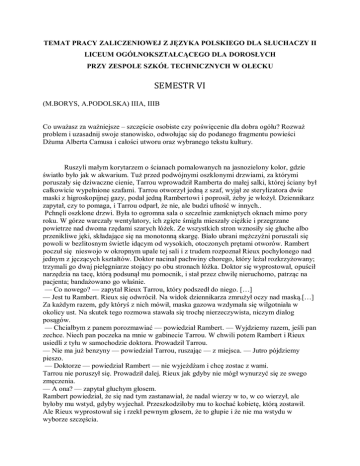 TEMAT PRACY ZALICZENIOWEJ Z JĘZYKA POLSKIEGO DLA SŁUCHACZY II LICEUM OGÓLNOKSZTAŁCĄCEGO DLA DOROSŁYCH PRZY ZESPOLE SZKÓŁ TECHNICZNYCH W OLECKU SEMESTR VI (M.BORYS, A.PODOLSKA) IIIA, IIIB Co uważasz za ważniejsze – szczęście osobiste czy poświęcenie dla dobra ogółu? Rozważ problem i uzasadnij swoje stanowisko, odwołując się do podanego fragmentu powieści Dżuma Alberta Camusa i całości utworu oraz wybranego tekstu kultury. Ruszyli małym korytarzem o ścianach pomalowanych na jasnozielony kolor, gdzie światło było jak w akwarium. Tuż przed podwójnymi oszklonymi drzwiami, za którymi poruszały się dziwaczne cienie, Tarrou wprowadził Ramberta do małej salki, której ściany był całkowicie wypełnione szafami. Tarrou otworzył jedną z szaf, wyjął ze sterylizatora dwie maski z higroskopijnej gazy, podał jedną Rambertowi i poprosił, żeby je włożył. Dziennikarz zapytał, czy to pomaga, i Tarrou odparł, że nie, ale budzi ufność w innych.. Pchnęli oszklone drzwi. Była to ogromna sala o szczelnie zamkniętych oknach mimo pory roku. W górze warczały wentylatory, ich zgięte śmigła mieszały ciężkie i przegrzane powietrze nad dwoma rzędami szarych łóżek. Ze wszystkich stron wznosiły się głuche albo przenikliwe jęki, składające się na monotonną skargę. Biało ubrani mężczyźni poruszali się powoli w bezlitosnym świetle idącym od wysokich, otoczonych prętami otworów. Rambert poczuł się nieswojo w okropnym upale tej sali i z trudem rozpoznał Rieux pochylonego nad jednym z jęczących kształtów. Doktor nacinał pachwiny chorego, który leżał rozkrzyżowany; trzymali go dwaj pielęgniarze stojący po obu stronach łóżka. Doktor się wyprostował, opuścił narzędzia na tacę, którą podsunął mu pomocnik, i stał przez chwilę nieruchomo, patrząc na pacjenta; bandażowano go właśnie. — Co nowego? — zapytał Rieux Tarrou, który podszedł do niego. […] — Jest tu Rambert. Rieux się odwrócił. Na widok dziennikarza zmrużył oczy nad maską.[…] Za każdym razem, gdy któryś z nich mówił, maska gazowa wzdymała się wilgotniała w okolicy ust. Na skutek tego rozmowa stawała się trochę nierzeczywista, niczym dialog posągów. — Chciałbym z panem porozmawiać — powiedział Rambert. — Wyjdziemy razem, jeśli pan zechce. Niech pan poczeka na mnie w gabinecie Tarrou. W chwili potem Rambert i Rieux usiedli z tyłu w samochodzie doktora. Prowadził Tarrou. — Nie ma już benzyny — powiedział Tarrou, ruszając — z miejsca. — Jutro pójdziemy pieszo. — Doktorze — powiedział Rambert — nie wyjeżdżam i chcę zostac z wami. Tarrou nie poruszył się. Prowadził dalej. Rieux jak gdyby nie mógł wynurzyć się ze swego zmęczenia. — A ona? — zapytał głuchym głosem. Rambert powiedział, że się nad tym zastanawiał, że nadal wierzy w to, w co wierzył, ale byłoby mu wstyd, gdyby wyjechał. Przeszkodziłoby mu to kochać kobietę, którą zostawił. Ale Rieux wyprostował się i rzekł pewnym głosem, że to głupie i że nie ma wstydu w wyborze szczęścia. — Tak — powiedział Rambert — ale może być wstyd, że człowiek jest sam tylko szczęśliwy. Tarrou, który dotychczas milczał, zauważył nie odwracając głowy, że jeśli Rambert chce dzielić nieszczęście ludzi, nie będzie miał nigdy czasu na szczęście. Trzeba wybierać. — Nie chodzi o to — powiedział Rambert. — Zawsze myślałem, że jestem obcy w tym mieście i że nie mam tu z wami nic wspólnego. Ale teraz, kiedy zobaczyłem to, co zobaczyłem, wiem, że jestem stąd, czy chcę tego, czy nie chcę. Ta sprawa dotyczy nas wszystkich. Nikt nie odpowiedział i Rambert zdawał się zniecierpliwiony. — Wiecie o tym zresztą dobrze! W przeciwnym razie co robiliście w tym szpitalu? Czy dokonaliście więc wyboru i wyrzekli się szczęścia? Ani Tarrou, ani Rieux nie odpowiadali. Milczenie trwało długo, dopóki nie zbliżyli się do domu doktora. Rambert powtórzył ostatnie pytanie z jeszcze większą się. Tylko Rieux odwrócił się w jego stronę. Podniósł się z trudem. — Niech mi pan wybaczy — powiedział — ale nie wiem. Niech pan zostanie z nami, jeśli pan tego chce. Auto skręcało; zamilkł. Potem podjął, patrząc przed siebie: — Nic w świecie nie jest warte, żeby człowiek odwrócił, się od tego, co kocha. A jednak ja także się odwracam, sam nie wiedząc dlaczego.