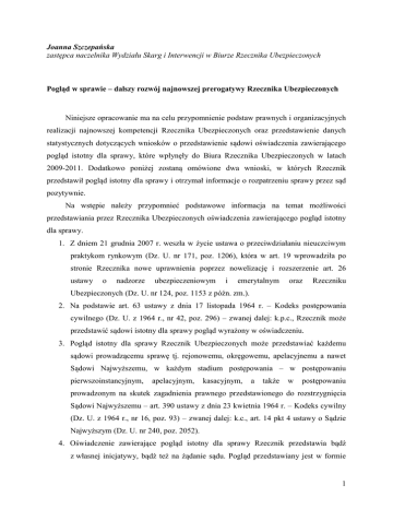 Joanna Szczepańska zastępca naczelnika Wydziału Skarg i Interwencji w Biurze Rzecznika Ubezpieczonych Pogląd w sprawie – dalszy rozwój najnowszej prerogatywy Rzecznika Ubezpieczonych Niniejsze opracowanie ma na celu przypomnienie podstaw prawnych i organizacyjnych realizacji najnowszej kompetencji Rzecznika Ubezpieczonych oraz przedstawienie danych statystycznych dotyczących wniosków o przedstawienie sądowi oświadczenia zawierającego pogląd istotny dla sprawy, które wpłynęły do Biura Rzecznika Ubezpieczonych w latach 2009-2011. Dodatkowo poniżej zostaną omówione dwa wnioski, w których Rzecznik przedstawił pogląd istotny dla sprawy i otrzymał informacje o rozpatrzeniu sprawy przez sąd pozytywnie. Na wstępie należy przypomnieć podstawowe informacja na temat możliwości przedstawiania przez Rzecznika Ubezpieczonych oświadczenia zawierającego pogląd istotny dla sprawy. 1. Z dniem 21 grudnia 2007 r. weszła w życie ustawa o przeciwdziałaniu nieuczciwym praktykom rynkowym (Dz. U. nr 171, poz. 1206), która w art. 19 wprowadziła po stronie Rzecznika nowe uprawnienia poprzez nowelizację i rozszerzenie art. 26 ustawy o nadzorze ubezpieczeniowym i emerytalnym oraz Rzeczniku Ubezpieczonych (Dz. U. nr 124, poz. 1153 z późn. zm.). 2. Na podstawie art. 63 ustawy z dnia 17 listopada 1964 r. – Kodeks postępowania cywilnego (Dz. U. z 1964 r., nr 42, poz. 296) – zwanej dalej: k.p.c., Rzecznik może przedstawić sądowi istotny dla sprawy pogląd wyrażony w oświadczeniu. 3. Pogląd istotny dla sprawy Rzecznik Ubezpieczonych może przedstawiać każdemu sądowi prowadzącemu sprawę tj. rejonowemu, okręgowemu, apelacyjnemu a nawet Sądowi Najwyższemu, w każdym stadium postępowania – w postępowaniu pierwszoinstancyjnym, apelacyjnym, kasacyjnym, a także w postępowaniu prowadzonym na skutek zagadnienia prawnego przedstawionego do rozstrzygnięcia Sądowi Najwyższemu – art. 390 ustawy z dnia 23 kwietnia 1964 r. – Kodeks cywilny (Dz. U. z 1964 r., nr 16, poz. 93) – zwanej dalej: k.c., art. 14 pkt 4 ustawy o Sądzie Najwyższym (Dz. U. nr 240, poz. 2052). 4. Oświadczenie zawierające pogląd istotny dla sprawy Rzecznik przedstawia bądź z własnej inicjatywy, bądź też na żądanie sądu. Pogląd przedstawiany jest w formie 1 pisemnej. W razie potrzeby złożenia dodatkowych wyjaśnień, Rzecznik może udzielić ich z własnej inicjatywy, jak również na żądanie sądu. Powinny być one udzielone przez Rzecznika również w formie pisemnej lub na żądanie sądu ustnie na posiedzeniu przez osobę upoważnioną do działania w imieniu Rzecznika Ubezpieczonych. 5. W celu otrzymania oświadczania Rzecznika Ubezpieczonych zawierającego istotny pogląd dla sprawy osoba skarżąca może postąpić w dwojaki sposób: w żądaniach pozwu należy powołując się na art. 26 ust. 7 ustawy z dnia 22 maja 2003 r. o nadzorze ubezpieczeniowym i emerytalnym oraz Rzeczniku Ubezpieczonych w związku z art. 63 k.p.c. zgłosić sądowi wniosek o wezwanie Rzecznika Ubezpieczonych do przedstawienia pisemnego poglądu istotnego dla sprawy. Prawdopodobnie sąd przychylając się do takiego wniosku wystąpi bezpośrednio do Rzecznika o przedstawienie poglądu w sprawie. Z takim wnioskiem może powód wystąpić także w kolejnym piśmie procesowym lub zgłosić taki wniosek podczas rozprawy ustnie do protokołu; wystąpić z wnioskiem bezpośrednio do Rzecznika Ubezpieczonych o przedstawienie sądowi poglądu w sprawie, gdyż skierowano pozew do sądu wobec zakładu ubezpieczeń. Do wniosku kierowanego do Rzecznika należy dołączyć kopię pozwu i jeżeli jest to możliwe kopię odpowiedzi ubezpieczyciela na pozew. W tym przypadku Rzecznik przekaże przygotowany przez siebie pogląd na piśmie kierując go do sądu rozpatrującego sprawę i do wiadomości powoda, ale tylko w sytuacji, gdy uzna, że jego treść mogłaby okazać się dla niego korzystna. 6. Przedstawienie sądowi poglądu istotnego dla sprawy wyrażonego w oświadczeniu, jest uprawnieniem Rzecznika Ubezpieczonych, a zatem ma charakter fakultatywny. Wnioski o przedstawienie poglądu istotnego dla sprawy otrzymane w latach 2009-2011 Poniżej przedstawiono dane statystyczne na temat otrzymanych przez Rzecznika Ubezpieczonych wniosków o przedstawienie oświadczenia zawierającego pogląd istotny dla sprawy w latach 2009-2011. W omawianym okresie do Biura Rzecznika Ubezpieczonych wpłynęło łącznie 60 wniosków o przedstawienie sądowi poglądu istotnego dla sprawy na podstawie art. 63 k.p.c. (Tabela nr 1 i Wykres do tab. nr 1). W odniesieniu do 40 spraw wniosek wpłynął bezpośrednio od powodów, a w 12 przypadkach został przekazany za pośrednictwem 2 pełnomocników. W 8 sprawach o przedstawienie poglądu zwrócił się do Rzecznika Ubezpieczonych bezpośrednio sąd rozpatrujący daną sprawę. Tabela nr 1. Liczba wniosków o przedstawienie przez Rzecznika Ubezpieczonych oświadczenia zawierającego pogląd istotny dla sprawy w latach 2009-2011 Lp. Rok Liczba wniosków 1. 2009 16 2. 2010 11 3. 2011 33 4. Ogółem 60 Źródło: sprawozdanie Rzecznika Ubezpieczonych za 2011 r.; http://www.rzu.gov.pl/files/20735__5267__Sprawozdanie_Rzecznika_Ubezpieczonych_za_rok_2011.pdf Wykres do tab. nr 1 Liczba wniosków o przedstawienie przez Rzecznika Ubezpieczonych oświadczenia zawierającego pogląd istotny dla sprawy w latach 2009 - 2011 35 30 25 20 15 10 5 0 2009 r. 2010 r. 2011 r. Źródło: sprawozdanie Rzecznika Ubezpieczonych za 2011 r.; http://www.rzu.gov.pl/files/20735__5267__Sprawozdanie_Rzecznika_Ubezpieczonych_za_rok_2011.pdf 3 Otrzymane wnioski o przedstawienie sądowi poglądu istotnego dla sprawy w 28 przypadkach były kontynuacją postępowań skargowych prowadzonych przez Wydział Skarg i Interwencji Biura Rzecznika Ubezpieczonych. W sprawach gdzie istnieje duże prawdopodobieństwo uzyskania korzystnego dla konsumenta rozstrzygnięcia w sprawie, Rzecznik Ubezpieczonych kończąc postępowani