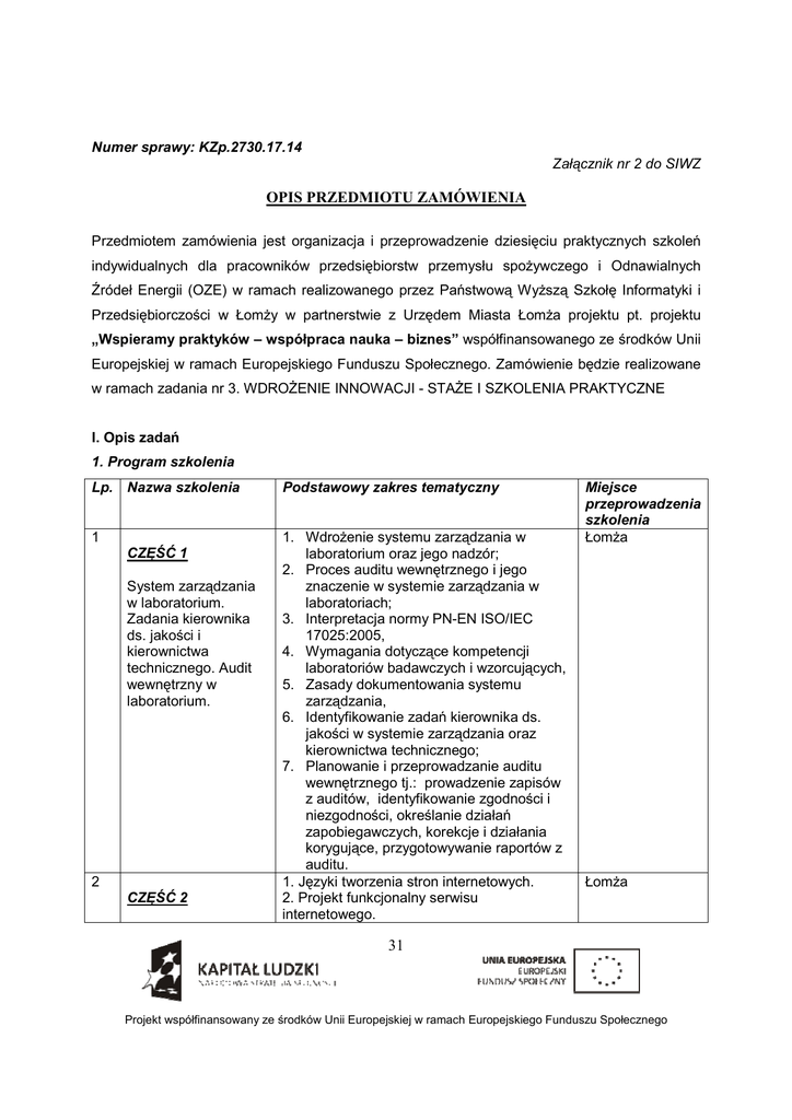 Numer sprawy: KZp.2730.17.14 Załącznik nr 2 do SIWZ OPIS PRZEDMIOTU ZAMÓWIENIA Przedmiotem zamówienia jest organizacja i przeprowadzenie dziesięciu praktycznych szkoleń indywidualnych dla pracowników przedsiębiorstw przemysłu spożywczego i Odnawialnych Źródeł Energii (OZE) w ramach realizowanego przez Państwową Wyższą Szkołę Informatyki i Przedsiębiorczości w Łomży w partnerstwie z Urzędem Miasta Łomża projektu pt. projektu „Wspieramy praktyków – współpraca nauka – biznes” współfinansowanego ze środków Unii Europejskiej w ramach Europejskiego Funduszu Społecznego. Zamówienie będzie realizowane w ramach zadania nr 3. WDROŻENIE INNOWACJI - STAŻE I SZKOLENIA PRAKTYCZNE I. Opis zadań 1. Program szkolenia Lp. Nazwa szkolenia Podstawowy zakres tematyczny 1 1. Wdrożenie systemu zarządzania w laboratorium oraz jego nadzór; 2. Proces auditu wewnętrznego i jego znaczenie w systemie zarządzania w laboratoriach; 3. Interpretacja normy PN-EN ISO/IEC 17025:2005, 4. Wymagania dotyczące kompetencji laboratoriów badawczych i wzorcujących, 5. Zasady dokumentowania systemu zarządzania, 6. Identyfikowanie zadań kierownika ds. jakości w systemie zarządzania oraz kierownictwa technicznego; 7. Planowanie i przeprowadzanie auditu wewnętrznego tj.: prowadzenie zapisów z auditów, identyfikowanie zgodności i niezgodności, określanie działań zapobiegawczych, korekcje i działania korygujące, przygotowywanie raportów z auditu. 1. Języki tworzenia stron internetowych. 2. Projekt funkcjonalny serwisu internetowego. CZĘŚĆ 1 System zarządzania w laboratorium. Zadania kierownika ds. jakości i kierownictwa technicznego. Audit wewnętrzny w laboratorium. 2 CZĘŚĆ 2 Miejsce przeprowadzenia szkolenia Łomża Łomża 31 Projekt współfinansowany ze środków Unii Europejskiej w ramach Europejskiego Funduszu Społecznego Tworzenie i administrowanie serwisem WWW 3 CZĘŚĆ 3 Proces liofilizacji przedsiębiorstwie spożywczym 4 CZĘŚĆ 4 Tworzenie i administrowanie serwisem WWW 3. Systemów zarządzania treścią (CMS). 4. Panel administracyjny i jego elementy. 5. Rodzaje użytkowników i ich uprawnienia. 6. Konfiguracja, ustawienia i pozycjonowanie serwisu. 1. Podstawy teoretyczne liofilizacji a) Właściwe prowadzenie procesu mrożenia jako podstawa liofilizacja techniki mrożenia (samozamrożenie, w mrożenie podczas wirowania, szybkie, wolne mrożenie) b) Możliwe warunki liofilizacji(obniżone ciśnienie, ciśnienie atmosferyczne) c) Liofilizacja płynów i ciał stałych d) Temperatura przejścia szklistego – znaczenie dla jakości produktu liofilizowanego e) Właściwości liofilizatów ważne dla jakości produktu f) Czy produkt może opuścić aparat w atmosferze beztlenowej? 2. Możliwości sterowania parametrami liofilizatora wzajemne zależności pomiędzy parametrami liofilizacji a) Od czego uzależnić wartości stosowanych ciśnień? b) Określenie wpływu parametrów na kinetykę procesu na podstawie kontroli ubytków masy online c) Jak zabezpieczyć produkt przed roztopieniem? d) korzyści wynikające z pomiaru temperatury materiału e) wykorzystanie profilu zmian temperatury liofilizacji dla uzyskanie dobrego produktu f) określenie w warunkach przemysłowych momentu zakończenia procesu 1. Języki tworzenia stron internetowych. 2. Projekt funkcjonalny serwisu internetowego. 3. Systemów zarządzania treścią (CMS). 4. Panel administracyjny i jego elementy. 5. Rodzaje użytkowników i ich uprawnienia. 6. Konfiguracja, ustawienia i pozycjonowanie serwisu. Łomża Sokółka 32 Projekt współfinansowany ze środków Unii Europejskiej w ramach Europejskiego Funduszu Społecznego 5 6 7 CZĘŚĆ 5 1. Dobór dostawców, jako element jakości Suwałki produkcji, 2. Sposoby, procedury, Czynniki wpływające 3. Jakość surowca a jakość produktu ze na jakość gotowego szczególnym uwzględnieniem przemysłu wyrobu piekarskiego 4. Identyfikowalność wymogi prawne, 5. Aspekty techniczne, 6. Procedury. CZĘŚĆ 6 1. Bezpośrednie wykorzystanie energii Łomża słonecznej. Postęp w zakresie technologii wykonania oraz poprawy sprawności Techniczne kolektorów słonecznych. możliwości a) kolektory termiczne zastosowania i b) panele fotowoltaiczne wprowadzenia w c) kolektory hybrydowe (termiczne + firmie z branży fotowoltaiczne). spożywczej rozwiązań 2. Pompy ciepła (PC, ang. HP). Nowoczesne z dziedziny OZE rozwiązania konstrukcyjne pomp ciepła, sterowanie pracą PC umożliwiające maksymalną efektywność. Analiza techniczno-ekonomiczna wykorzystywania dolnych źródeł ciepła do zasilania PC. a) sprężarkowe pompy ciepła SPC: elektryczne EPC ang. EHP; gazowe GPC ang. GHP (efektywność GPC) b) absorbcyjne gazowe pompy ciepła 3. Odzysk ciepła w przedsiębiorstwach przemysłu spożywczego szczególnie w przetwórstwie wykorzystującym duże ilości ciepła. Odzysk ciepła z procesów technologicznych, oszczędność mediów (prądu elektrycznego, wody, sprężonego powietrza), minimalizowanie ilości ścieków (zamknięte obiegi wody). Odzysk ciepła z odprowadzanych ścieków. W programie szkolenia należy położyć nacisk na stronę ekonomiczną zastosowania proponowanych rozwiązań z dziedziny OZE ze szczególnym uwzględnieniem możliwości wykorzystania dotacji i okresy zwroty poniesionych kosztów inwestycyjnych. 1. Wprowadzenie CZĘŚĆ 7 a) Preparaty myjące i dezynfekcyjne b) Właściwości preparatów myjących c) Cechy dobrego środka myjącego Mycie i dezynfekcja w d) Składniki preparatów myjących Łomża 33 Projekt współfinansowany ze środków Unii Europejskiej w ramach Europejskiego Funduszu Społecznego przemyśle spożywczym 8 e) Właściwości preparatów dezynfekujących f) Cechy dobrego środka dezynfekcyjnego 2. Mycie a) Cel mycia b) Mycie: zasady ogólne c) Etapy mycia d) Mycie ręczne e) Mycie mechaniczne f) Mycie CIP (mycie w miejscu: Cleaning in Place) g) Mycie COP (mycie poza miejscem: Cleanin