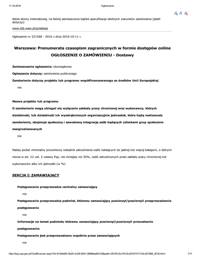 11.10.2016 Ogłoszenie Adres strony internetowej, na której zamieszczona będzie specyfikacja istotnych warunków zamówienia (jeżeli dotyczy): www.ibb.waw.pl/przetargi Ogłoszenie nr 321568 2016 z dnia 20161011 r. Warszawa: Prenumerata czasopism zagranicznych w formie dostępów online OGŁOSZENIE O ZAMÓWIENIU Dostawy Zamieszczanie ogłoszenia: obowiązkowe Ogłoszenie dotyczy: zamówienia publicznego Zamówienie dotyczy projektu lub programu współfinansowanego ze środków Unii Europejskiej nie Nazwa projektu lub programu O zamówienie mogą ubiegać się wyłącznie zakłady pracy chronionej oraz wykonawcy, których działalność, lub działalność ich wyodrębnionych organizacyjnie jednostek, które będą realizowały zamówienie, obejmuje społeczną i zawodową integrację osób będących członkami grup społecznie marginalizowanych nie Należy podać minimalny procentowy wskaźnik zatrudnienia osób należących do jednej lub więcej kategorii, o których mowa w art. 22 ust. 2 ustawy Pzp, nie mniejszy niż 30%, osób zatrudnionych przez zakłady pracy chronionej lub wykonawców albo ich jednostki (w %) SEKCJA I: ZAMAWIAJĄCY Postępowanie przeprowadza centralny zamawiający nie Postępowanie przeprowadza podmiot, któremu zamawiający powierzył/powierzyli przeprowadzenie postępowania nie Informacje na temat podmiotu któremu zamawiający powierzył/powierzyli prowadzenie postępowania: Postępowanie jest przeprowadzane wspólnie przez zamawiających nie http://bzp.uzp.gov.pl/Out/Browser.aspx?id=813efa555e254c2992418fd66aa83133&path=2016%5c10%5c20161011%5c321568_2016.html 1/11 11.10.2016 Ogłoszenie Jeżeli tak, należy wymienić zamawiających, którzy wspólnie przeprowadzają postępowanie oraz podać adresy ich siedzib, krajowe numery identyfikacyjne oraz osoby do kontaktów wraz z danymi do kontaktów: Postępowanie jest przeprowadzane wspólnie z zamawiającymi z innych państw członkowskich Unii Europejskiej nie W przypadku przeprowadzania postępowania wspólnie z zamawiającymi z innych państw członkowskich Unii Europejskiej – mające zastosowanie krajowe prawo zamówień publicznych: Informacje dodatkowe: I. 1) NAZWA I ADRES: Instytut Biochemii i Biofizyki Polskiej Akademii Nauk, krajowy numer identyfikacyjny 32581900000, ul. ul. Pawińskiego , 02106 Warszawa, woj. mazowieckie, państwo Polska, tel. 226 584 724, e mail , faks 226 584 636. Adres strony internetowej (URL): www.ibb.waw.pl I. 2) RODZAJ ZAMAWIAJĄCEGO: Inny: Instytut Naukowy I.3) WSPÓLNE UDZIELANIE ZAMÓWIENIA (jeżeli dotyczy): Podział obowiązków między zamawiającymi w przypadku wspólnego przeprowadzania postępowania, w tym w przypadku wspólnego przeprowadzania postępowania z zamawiającymi z innych państw członkowskich Unii Europejskiej (który z zamawiających jest odpowiedzialny za przeprowadzenie postępowania, czy i w jakim zakresie za przeprowadzenie postępowania odpowiadają pozostali zamawiający, czy zamówienie będzie udzielane przez każdego z zamawiających indywidualnie, czy zamówienie zostanie udzielone w imieniu i na rzecz pozostałych zamawiających): I.4) KOMUNIKACJA: Nieograniczony, pełny i bezpośredni dostęp do dokumentów z postępowania można uzyskać pod adresem (URL) nie www.ibb.waw.pl/przetargi Adres strony internetowej, na której zamieszczona będzie specyfikacja istotnych warunków zamówienia nie www.ibb.waw.pl/przetargi http://bzp.uzp.gov.pl/Out/Browser.aspx?id=813efa555e254c2992418fd66aa83133&path=2016%5c10%5c20161011%5c321568_2016.html 2/11 11.10.2016 Ogłoszenie Dostęp do dokumentów z postępowania jest ograniczony więcej informacji można uzyskać pod adresem nie Oferty lub wnioski o dopuszczenie do udziału w postępowaniu należy przesyłać: Elektronicznie nie adres Dopuszczone jest przesłanie ofert lub wniosków o dopuszczenie do udziału w postępowaniu w inny sposób: nie Wymagane jest przesłanie ofert lub wniosków o dopuszczenie do udziału w postępowaniu w inny sposób: tak Inny sposób: Doręczenie do siedziby Zamawiającego. Adres: Instytut Biochemii i Biofizyki Polskiej Akademii Nauk Pawińskiego 5a, 02106 Warszawa, pokój 45. Komunikacja elektroniczna wymaga korzystania z narzędzi i urządzeń lub formatów plików, które nie są ogólnie dostępne nie Nieograniczony, pełny, bezpośredni i bezpłatny dostęp do tych narzędzi można uzyskać pod adresem: (URL) SEKCJA II: PRZEDMIOT ZAMÓWIENIA II.1) Nazwa nadana zamówieniu przez zamawiającego: Prenumerata czasopism zagranicznych w formie dostępów online Numer referencyjny: PR PN 10 16 Przed wszczęciem postępowania o udzielenie zamówienia przeprowadzono dialog techniczny nie http://bzp.uzp.gov.pl/Out/Browser.aspx?id=813efa555e254c2992418fd66aa83133&path=2016%5c10%5c20161011%5c321568_2016.html 3/11 11.10.2016 Ogłoszenie II.2) Rodzaj zamówienia: dostawy II.3) Informacja o możliwości składania ofert częściowych Zamówienie podzielone jest na części: Nie II.4) Krótki opis przedmiotu zamówienia (wielkość, zakres, rodzaj i ilość dostaw, usług lub robót budowlanych lub określenie zapotrzebowania i wymagań ) a w przypadku partnerstwa innowacyjnego określenie zapotrzebowania na innowacyjny produkt, usługę lub roboty budowlane: Przedmiotem zamówienia jest dostawa w prenumeracie zagranicznych czasopism, w formie dostępów online, zgodnie z formularzem ofertowym stanowiącym załącznik nr 1 do SIWZ, od dnia 2 stycznia 2017 r. do dnia 29 grudnia 2017 r. II.5) Główny kod CPV: 222000002 Dodatkowe kody CPV:799800007 II.6) Całkowita wartość zamówienia (jeżeli zamawiający podaje informacje o wartości zamówienia): Wartość bez VAT: Waluta: (w przypadku umów ramowych lub dynamicznego systemu zakupów – szacunkowa całkowita maksymalna wartość w całym okresie obowiązywania umowy ramowej lub dynamicznego systemu zakupów) II.7) Czy przewiduje się udzielenie zamówień, o których mowa w art. 67 ust. 1 pkt 6 i 7 lub w art. 134 ust. 6 pkt 3 usta
