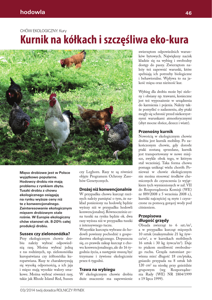 hodowla 46 CHÓW EKOLOGICZNY. Kury Kurnik na kółkach i szczęśliwa eko-kura zwierzętom odpowiednich warunków bytowych. Największy nacisk kładzie się na wybieg i swobodny dostęp do paszy. Zwierzętom należy też zapewnić warunki, które spełniają ich potrzeby biologiczne i behawioralne. Wpływa to na jakość mięsa oraz nieśność kur. Wybieg dla drobiu może być zielony i obsiany np. trawami, konieczne jest też wyposażenie w urządzenia do karmienia i pojenia. Należy także pomyśleć o zadaszeniu, aby ptaki mogły się schronić przed niekorzystnymi warunkami atmosferycznymi (zbyt mocne słońce, deszcz i wiatr). Przenośny kurnik Mięso drobiowe jest w Polsce wyjątkowo popularne. Hodowcy drobiu nie mają problemu z rynkiem zbytu. Tuszki drobiu z chowu ekologicznego osiągają na rynku wyższe ceny niż te z konwencjonalnego. Zainteresowanie ekologicznym mięsem drobiowym stale rośnie. W Europie ekologiczny chów stanowi ok. 8-20% całej produkcji drobiu. Sussex czy zielononóżka? Przy ekologicznym chowie drobiu należy wybrać odpowiednią rasę. Można wybrać jedną z ras rodzimych, np. zielononóżka kuropatwiana czy żółtonóżka kuropatwiana. Rasy te charakteryzują się wysoką odpornością, a ich jaja i mięso mają wysokie walory smakowe. Można wybrać również rasy, takie jak Rhode Island Red, Sussex czy Leghorn. Rasy te są również objęte Programem Ochrony Zasobów Genetycznych. Drożej niż konwencjonalnie W przypadku chowu kurcząt rzeźnych należy pamiętać o tym, że nakład poniesiony na hodowlę będzie wyższy niż w przypadku hodowli konwencjonalnej. Równocześnie cena tuszki na rynku będzie ok. dwa razy wyższa niż w przypadku tuszki z intensywnego tuczu. Wszystkie kurczęta wybrane do hodowli powinny pochodzić z gospodarstwa ekologicznego. Dopuszcza się, co prawda zakup kurcząt z chowu konwencjonalnego, ale do 16 tygodnia życia, a następnie muszą być trzymane i żywione ekologicznie przez 6 tygodni. Trawa na wybiegu W ekologicznym chowie drobiu duże znaczenie ma zapewnienie 03/2014 twój doradca ROLNICZY RYNEK Nowością w ekologicznym chowie drobiu jest kurnik mobilny. Po zakończonym chowie, gdy dorosłe ptaki zostaną sprzedane, kurnik jest transportowany w nowe miejsce, zwykle obok tego, w którym stał wcześniej. Taka forma chowu pomaga uniknąć wielu chorób. Ponieważ w chowie ekologicznym nie można stosować środków chemicznych do czyszczenia (z wyjątkiem tych wymienionych w zał. VII do Rozporządzenia Komisji (WE) nr 889/2008 z 5 września 2008 r.), kurniki najczęściej są myte i czyszczone za pomocą gorącej wody pod ciśnieniem. Przepisowa długość grzędy Obsada zwierząt to 6 szt./m2, a w przypadku kurcząt mięsnych 10 sztuk (maksymalnie 21 kg żywca/m2, a w kurnikach mobilnych 16 sztuk i 30 kg żywca/m2). Daje to ptakom możliwość swobodnego ruchu. Grzęda natomiast powinna mieć długość 18 cm/ptaka, gniazdo przypada na 8 sztuk lub 120 cm2 na nioskę przy gnieździe grupowym (wg Rozporządzenia Rady (WE) NR 1804/1999 z 19 lipca 1999). hodowla Więcej pracy, większy zysk Chów drobiu ekologicznego wymaga większych nakładów pracy niż konwencjonalny. Wiąże się również z większymi nakładami finansowymi. To pieniądze wydawane głównie na zapewnienie odpowiednich warunków bytowych zwierzętom oraz ekologiczną paszę. Jednak przy panujących trendach żywieniowych, opłacalność chowu drobiu ekologicznego jest z każdym rokiem wyższa. Produkty z ekologicznego chowu, takie jak mięso i jaja, trafiają do grona odbiorców, którzy są świadomi ich wartości prozdrowotnych. Eko w menu Głównym elementem przy opracowywaniu strategii marketingowej jest uświadamianie konsumentów i przekazywanie im informacji właśnie o jakości i wartości produktów ekologicznych oraz o ich pozytywnym wpływie na stan zdrowia. Jednak odbiorcami ekologicznego mięsa i jaj są już nie tylko indywidualni klienci, ale również firmy i restauracje. Wiele z nich oferuje dania z ekoproduktów. Często też klienci restauracji życzą sobie, aby przygotowane potrawy miały w swoim składzie produkty pochodzące z upraw czy chowu ekologicznego. 47 wo do poszanowania, ochrony i opieki. Niestety często ich prawa są łamane, szczególnie w wielkotowarowych gospodarstwach zajmujących się konwencjonalnym chowem brojlerów i kur niosek. W chowie ekologicznym, rozporządzenia wyraźnie określają, w jaki sposób powinny być utrzymywane zwierzęta. Warunki te są zdecydowanie korzystniejsze dla ptaków, mogą się one rozmnażać w środowisku zbliżonym do naturalnego, mogą korzystać z wybiegów, nie są tuczone wbrew ich woli i mogą się prawidłowo rozwijać. logicznego jest więc nie tylko korzystne dla konsumentów (zdrowsze jedzenie), ale i dla samych zwierząt. Mięso z hodowli ekologicznej będzie miało odpowiednie oznaczenie na opakowaniu, natomiast jaja będą posiadały numer. Cyfra 0 oznacza, że jaja są ekologiczne, 1 to chów na wolnym wybiegu, 2 to chów ściółkowy, natomiast cyfra 3 to już chów klatkowy. Najważniejsze jest, aby zwierzę rzeźne przez okres odchowu miało zapewnione właściwe warunki bytowe, a sam ubój odbywał się w warunkach jak najmniej stresujących i aby zwierzę jak najmniej cierpiało. Zdrowsze zero Produkty pochodzące od tych zwierząt uzyskują w ten sposób wyższą jakość. Wspieranie chowu eko- Dominika Jankowska DODR we Wrocławiu Fot. Ewa Kutkowska DODR we Wrocławiu Aby mięso drobiowe i jaja mogły zostać uznane za ekologiczne, muszą pochodzić z certyfikowanego gospodarstwa ekologicznego. Taką informację warto zamieszczać na produktach nie tylko ze względów informacyjnych. Taka informacja jest dobrą reklamą i przyciąga odbiorców, którzy darzą producenta i produkt większym zaufaniem. Kura pod ochroną Nie należy zapominać o tym, że drób, jak wszystkie zwierzęta, podlega Ustawie o Ochronie Zwierząt z dnia 21 sierpnia 1997 r. (
