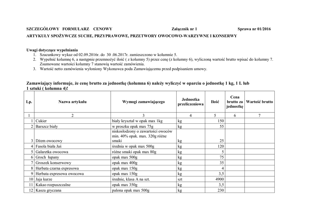 SZCZEGÓŁOWY FORMULARZ CENOWY Załącznik nr 1 Sprawa nr 01/2016 ARTYKUŁY SPOŻYWCZE SUCHE, PRZYPRAWOWE, PRZETWORY OWOCOWO-WARZYWNE I KONSERWY Uwagi dotyczące wypełniania 1. Szacunkowy wykaz od 02.09.2016r. do 30 .06.2017r. zamieszczono w kolumnie 5. 2. Wypełnić kolumnę 6, a następnie przemnożyć ilość ( z kolumny 5) przez cenę (z kolumny 6), wyliczoną wartość brutto wpisać do kolumny 7. Zsumowane wartości kolumny 7 stanowią wartość zamówienia. 3. Wartość netto zamówienia wyłoniony Wykonawca poda Zamawiającemu przed podpisaniem umowy. Zamawiający informuje, że cenę brutto za jednostkę (kolumna 6) należy wyliczyć w oparciu o jednostkę 1 kg, 1 L lub 1 sztuki ( kolumna 4)! Lp. Nazwa artykułu 1 2 1 Cukier 2 Barszcz biały 3 4 5 6 7 8 9 10 11 12 Dżem owocowy Fasola biała Jaś Galaretka owocowa Groch łupany Groszek konserwowy Herbata czarna expresowa Herbata expresowa owocowa Jaja kurze Kakao rozpuszczalne Kasza gryczana Wymogi zamawiającego 3 biały kryształ w opak max 1kg w proszku opak max 75g niskosłodzony o zawartości owoców min. 40% opak. max. 320g różne smaki średnia w opak max 500g różne smaki opak max 80g opak max 500g opak max 400g opak max 150g opak max 150g średnie, klasa A na szt. opak max 350g palona opak max 500g Jednostka przeliczeniowa Ilość 4 5 Cena brutto za Wartość brutto jednostkę 6 kg kg 150 55 kg kg kg kg kg kg kg szt kg kg 25 120 5 75 35 4 3,5 4900 3,5 230 7 13 Kasza jęczmienna 14 Kawa zbożowa rozpuszczalna średnia opak max 1kg opak max 150g kg kg 260 1 15 Ketchup łagodny wyciskany bez konserwantów opak. max. 500g kg 15 kg 0,5 kg L kg kg kg kg L kg 130 25 3 3 2 3 1 50 kg kg 50 60 kg 50 kg 250 kg kg kg kg szt 250 315 2 1 110 16 Kisiel 17 18 19 20 21 22 23 24 Koncentrat pomidorowy Barszcz biały Kukurydza konserwowa Kwasek cytrynowy Liść laurowy Majeranek Majonez Makaron gruba nitka 25 Makaron muszelki 26 Makaron nitki bez cukru różne smaki opak. max.70g o zawartości pomidorów min. 30% opak. max. 200g w butelce nie większy niż 0,5L opak max 400g opak max 30g opak max 15g opak max 25g opak max 500ml opak max 500g z zawartości pszenicy durum opak. max. 500g 4-jajeczy opk max 500g z zawartości pszenicy durum opak. Max. 500g 27 Makaron rurki z zawartości pszenicy durum opak. Max. 500g 28 Makaron spaghetti 29 30 31 32 33 Makaron świderek Mąka pszenna Mąka ziemniaczana Musztarda stołowa Ogórki konserwowe z zawartości pszenicy durum opak. max. 500g typ 450 opak max 1kg opak max 1kg wyciskana opak max 1kg w słoiku o poj. 900ml L kg 310 1 kg kg kg L 12 5 1,5 95 40 Przyprawa warzywna z pierwszego tłoczenia w opak 1 l przyprawa w proszku opak. max 25g w puszce z otwieraczem opak. max. 200g czarny mielony opak max 25g opak max 75g do zup opak max 1l wieloskładnikowa sypka opak. max. 200g kg 37 41 Wafle ryżowe 42 Ryż opakowanie nie większe niż 150g biały opak max 1kg kg kg 5 145 43 Soczek owocowy 44 Sos do spaghetti 45 Paluszki z sezamem Beskidzkie w kartoniku ze słomką opak max 250ml L w proszku opak max 80g kg w opakowaniu nie większym niż 300g kg 28 36 5 34 Olej rzepakowy 35 Papryka słodka 36 37 38 39 Pasztet drobiowy Pieprz naturalny Przyprawa gyros Przyprawa w płynie 46 Sól 47 48 49 50 51 52 53 54 55 56 57 Sól morska Szczaw konserwowy Ziele angielskie Bazylia Cynamon Dynia pestki Jarzynka bez soli Kasza jaglana Orzech włoski Oregano Pieprz ziołowy jodowana biała spożywcza w opak max 1kg z potasem o obniżonej zawartości sodu opak. max 1kg w opak max 320g opak max 25g opak max 10g opak max 50g łuskana opak max 100g opak max 100g opak max 5kg opak max 100g opak max 10g mielony, opak max 25g kg 35 kg kg kg kg kg kg kg kg kg kg kg 150 22 1,5 0,5 0,5 0,5 20 16 1 0,5 0,5 58 59 60 61 62 63 Płatki śniadaniowe kukurydziane Ryż brązowy Sezam Ciasteczka kruche z marmoladą Herbatniki Słomka ptysiowa Wartość brutto zamówienia opak max 250g w saszetkach, max 400g łuskany opak max 280g na kilogramy paczkowane opak max 100g słodka, na kilogramy kg kg kg kg kg kg 18 20 1 10 7 10