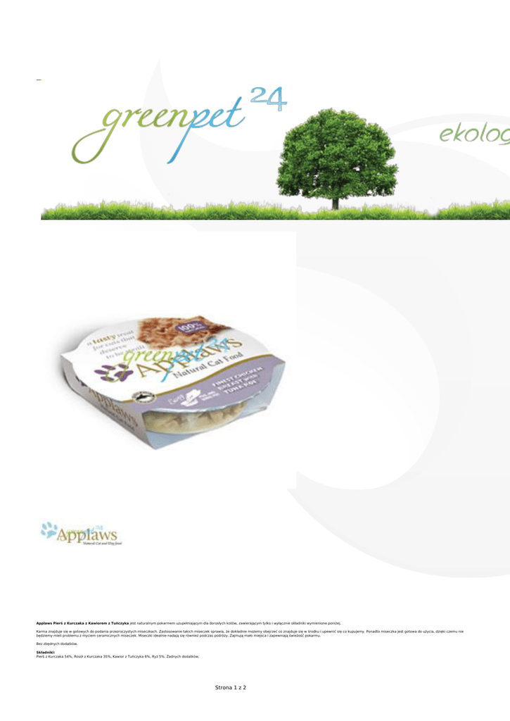Applaws Pierś z Kurczaka z Kawiorem z Tuńczyka jest naturalnym pokarmem uzupełniającym dla dorosłych kotów, zawierającym tylko i wyłącznie składniki wymienione poniżej. Karma znajduje się w gotowych do podania przezroczystych miseczkach. Zastosowanie takich miseczek sprawia, że dokładnie możemy obejrzeć co znajduje się w środku i upewnić się co kupujemy. Ponadto miseczka jest gotowa do użycia, dzięki czemu nie będziemy mieli problemu z myciem ceramicznych miseczek. Miseczki idealnie nadają się również podczas podróży. Zajmują mało miejsca i zapewniają świeżość pokarmu. Bez zbędnych dodatków. Składniki: Pierś z Kurczaka 54%, Rosół z Kurczaka 35%, Kawior z Tuńczyka 6%, Ryż 5%. Żadnych dodatków. Strona 1 z 2 Analiza składników: Wilgotność 84 %, Białko 11%, Oleje i Tłuszcze 1%, Popiół 1%, Błonnik 0,5%. Patrz instrukcja żywienia. Strona 2 z 2