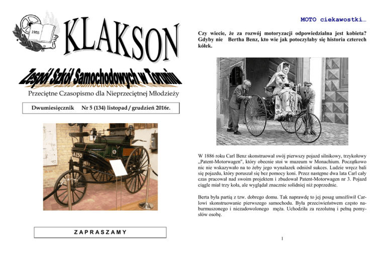 MOTO ciekawostki… Czy wiecie, że za rozwój motoryzacji odpowiedzialna jest kobieta? Gdyby nie Bertha Benz, kto wie jak potoczyłaby się historia czterech kółek. Przeciętne Czasopismo dla Nieprzeciętnej Młodzieży Dwumiesięcznik Nr 5 (134) listopad / grudzień 2016r. W 1886 roku Carl Benz skonstruował swój pierwszy pojazd silnikowy, trzykołowy „Patent-Motorwagen", który obecnie stoi w muzeum w Monachium. Początkowo nic nie wskazywało na to żeby jego wynalazek odniósł sukces. Ludzie wręcz bali się pojazdu, który poruszał się bez pomocy koni. Przez następne dwa lata Carl cały czas pracował nad swoim projektem i zbudował Patent-Motorwagen nr 3. Pojazd ciągle miał trzy koła, ale wyglądał znacznie solidniej niż poprzednie. Berta była partią z tzw. dobrego domu. Tak naprawdę to jej posag umożliwił Carlowi skonstruowanie pierwszego samochodu. Była przeciwieństwem często naburmuszonego i niezadowolonego męża. Uchodziła za rezolutną i pełną pomysłów osobę. ZAPRASZAMY 1 5 sierpnia 1888 roku Berta, w tajemnicy przed mężem, wyjechała z synami Eugenem (15 lat) i Richardem (14 lat) z Mannheim do Pforzheim. Miała do przejechania 106 km. Odległość, która dzisiaj nie robi na nikim wrażenia, wtedy była podróżą w nieznane. Chciała odwiedzić swoją matkę i przy okazji uzmysłowić swojemu mężowi, że jednym z warunków finansowego powodzenia produkcji automobili jest pokazanie ich praktycznego zastosowania szerokiej publiczności. Do dzisiaj historycy spierają się, czy Berta prowadziła samochód czy też nie. Na pewno pomagała podczas awarii. Podczas podróży osobiście dokonywała koniecznych napraw, jak przetkanie rurki doprowadzającej paliwo do gaźnika, wymiana izolacji przewodu zapłonowego czy naprawa ogniwa łańcucha. Co ciekawe, paliwo dla 2,5 - konnego auta można było kupić tylko w aptece! Produkt nosił nazwę Ligorin i był po prostu eterem naftowym. Tym sposobem miejska apteka w miejscowości Wiesloch stała się pierwszą stacją benzynową na świecie. Wysyłane po drodze telegramy informowały Benza o przebiegu podróży. W rezultacie otrzymał od żony szereg sugestii m.in. dotyczących użycia lepszych hamulców, zamiast zamontowanych drewnianych klocków. Dla efektywniejszego układu hamulcowego Berta nałożyła na nie skórzane łaty. Żona wynalazcy narzekała również na fatalne oznakowanie dróg. Bertha opuściła Mannheim o świcie, do Pforzheim dotarła po zmierzchu. Następnego dnia wróciła do Mannheim. Jej podróż wywołała medialną burzę. Premiery kinowe… Na ekrany kin wszedł nowy film w reżyserii Patryka Vegi „Pitbull. Niebezpieczne kobiety”, czyli film przygotowany w odpowiedzi na oczekiwania fanów cyklu „Pitbull'a”. Pitbull. Niebezpieczne kobiety to dobre kino sensacyjne z dodatkiem komedii i dramatu. Reżyser mówi, że wszystko, co widzimy na ekranie wydarzyło się naprawdę, a on tylko pozbierał różne wydarzenia i przedstawił je w filmowej fabule. By jednak nie powielać schematów z poprzednich części Pitbulla, Patryk Vega postanowił tym razem oddać pierwszeństwo kobietom w mundurach, spychając tym samym męską część obsady na drugi plan. Policjantki w nowym Pitbullu znacząco odbiegają swoim wizerunkiem od amerykańskich wzorców. Ich życie poza pracą to w dużej mierze pasmo nieszczęść i tragedii. To nie jest, rzecz jasna, film dla wszystkich. Bo pewnie nie każdemu będzie odpowiadała aż tak brutalna fabuła albo wylewające się z ekranu przekleństwa. Taki jest jednak styl „Pitbulla". Należy jednak pamiętać, że to przede wszystkim rasowe kino rozrywkowe z bardzo licznymi akcentami komediowymi. I właśnie z tego powodu do filmu, chociaż opowiada o tak poważnych sprawach i mierzy się z licznymi dramatami i tragediami, nie można podchodzić tylko na serio. Tak jak przewidywała, przyczyniło się to do sprzedaży pojazdu jej męża. Zbudowano 25 sztuk 2,70 metrowego pojazdu Patent-Motorwagen. Bertha Benz zapisała się w historii motory zacji jako pierwsza osoba, której udało się samodzielnie pokonać ponad stukilometrowy dystans. Opracowano na podstawie materiałów serwisu http://moto.pl/ 2 Opracował Marek Raczkowski IV B 3 Lektura na święta… „Złodziejka książek” Markusa Zusaka „Złodziejka książek” to światowy bestseller, na podstawie którego powstał film wytwórni Twentieth Century Fox. Bohaterka książki - Liesel Meminger swoją pierwszą książkę kradnie podczas pogrzebu młodszego brata. To dzięki „Podręcznikowi grabarza” uczy się czytać i odkrywa moc słów. Później przyjdzie czas na kolejne książki: płonące na stosach nazistów, ukryte w biblioteczce żony burmistrza i wreszcie te własnoręcznie napisane… Ale Liesel żyje w niebezpiecznych czasach. Kiedy jej przybrana rodzina udziela schronienia Żydowi, świat dziewczynki zmienia się na zawsze… „Złodziejka książek" to powieść, która potrafi wzruszyć do łez. Jest publikacją do głębi przejmującą, niepozwalającą przejść obojętnie nie tylko wobec wydarzeń mających miejsce już ponad pół wieku temu, ale także wobec faktu każdej jednostkowej śmierci. Śmierci, dla której w powieści choć na chwilę stają się przeciwwagą bezinteresowna przyjaźń, szacunek i chęć pomocy najsłabszym i najbardziej potrzebującym. Gorąco polecam! Książka dostępna w bibliotece szkolnej. Opracowała p. A. Bielicka 4 RADOSNYCH ŚWIĄT I SZCZĘŚCIA W NOWYM ROKU życzy redakcja Gazetka ,,KLAKSON” Zespół redakcyjny: p. J. Blachowska, p. A. Bielicka, p. D. Szwed, M. Raczkowski IVb/4