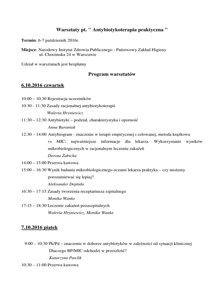 Warsztaty pt. " Antybiotykoterapia praktyczna " Termin: 6-7 październik 2016r. Miejsce: Narodowy Instytut Zdrowia Publicznego - Państwowy Zakład Higieny ul. Chocimska 24 w Warszawie Udział w warsztatach jest bezpłatny Program warsztatów 6.10.2016 czwartek 10:00 – 10:30 Rejestracja uczestników 10:30 - 11:30 Zasady racjonalnej antybiotykoterapii Waleria Hryniewicz 11:30 – 12:30 Antybiotyki – podział, charakterystyka i oporność Anna Baraniak 12:30 – 14:00 Antybiogram - znaczenie w terapii empirycznej i celowanej, metoda krążkowa vs MIC; najważniejsze informacje dla lekarza. Wykorzystanie wyników mikrobiologicznych w racjonalnym leczeniu zakażeń Dorota Żabicka 14:00 – 15:00 Przerwa kawowa 15:00 – 16:30 Wynik badania mikrobiologicznego oczami lekarza praktyka – czy możemy porozumiewać się lepiej? Aleksander Deptuła 16:30 – 17:15 Zasady tworzenia receptariusza szpitalnego Monika Wanke 17:15 – 18:30 Leczenie zakażeń pozaszpitalnych Waleria Hryniewicz, Monika Wanke 7.10.2016 piątek 9:00 – 10:30 Pk/Pd – znaczenie w doborze antybiotyków w zależności od sytuacji klinicznej Dlaczego BP/MIC odchodzi w przeszłość? Katarzyna Pawlik 10:30 – 11:00 Przerwa kawowa 11:00 – 12:30 Leczenie zakażeń szpitalnych, z wyłączeniem OIT Aleksander Deptuła 12:30 – 14:00 OIT- zakażenia, znaczenie diagnostyki mikrobiologicznej w leczeniu i monitorowaniu zakażeń Agnieszka Misiewska-Kaczur 14:00 – 14:45 Koniec ery antybiotyków ? – nowe możliwości a potrzeby terapeutyczne Waleria Hryniewicz