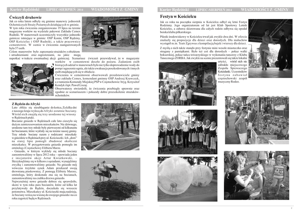 Kurier Rêdziñski LIPIEC-SIERPIEÑ 2014 WIADOMOŒCI Z GMINY Kurier Rêdziñski LIPIEC-SIERPIEÑ 2014 WIADOMOŒCI Z GMINY Æwiczyli druhowie Festyn w Koœcielcu Jak co roku latem odby³y siê gminne manewry jednostek Ochotniczych Stra¿y Po¿arnych dzia³aj¹cych w gminie. W tym roku æwiczenia zorganizowano 19 lipca na terenie magazynu worków na wydziale pakowni Zak³adu Cemex Rudniki. W manewrach uczestniczy³y wszystkie jednostki gaœnicze istniej¹ce w gminie: OSP Konin, OSP Rêdziny, OSP Koœcielec i OSP Rudniki, a tak¿e pracownicy cementowni. W sumie w æwiczenia zaanga¿owanych by³o 57 osób. Celem manewrów by³o zapoznanie stra¿aków z obiektem i utrudnieniami oraz zagro¿eniami, na jakie mog¹ napotkaæ w trakcie ewentualnej akcji gaœniczej. Scenariusz æwiczeñ przewidywa³, ¿e w magazynie worków w cementowni dosz³o do po¿aru. Zadaniem osób bior¹cych udzia³ w manewrach by³o nie tylko doprowadzenie wody do pomp i ugaszenie ognia, ale tak¿e ewakuacja poszkodowanych i innych osób znajduj¹cych siê w obiekcie. Æwiczenia w cementowni obserwowali przedstawiciele gminy oraz zak³adu Cemex, komendant gminny OSP Andrzej Krawczyk, a z ramienia Komendy Miejskiej PSP w Czêstochowie: bryg. Krzysztof Kendyk i kpt. Pawe³ Liszaj. Obserwatorzy stwierdzili, ¿e æwiczenia przebieg³y sprawnie oraz zgodnie ze scenariuszem i pokaza³y dobre przeszkolenie stra¿akówochotników. Jak co roku na pocz¹tku sierpnia w Koœcielcu odby³ siê letni Festyn Rodzinny. Jego organizatorem od lat jest Klub Sportowy Lotnik Koœcielec, a zabawa skierowana dla ca³ych rodzin odbywa siê opodal boiska klubu pi³karskiego. Z Rêdzin do Afryki Lato zbli¿a siê nieub³aganie do koñca, Za kilka dni z naszego kraju wylec¹ do Afryki ostatnie bociany. Wœród nich znajd¹ siê trzy urodzone tej wiosny w Rêdzinach ptaki. Bocianie gniazdo w Rêdzinach ca³e lato cieszy³o siê du¿ym zainteresowaniem mieszkañców. Nic dziwnego, urodzone tam trzy m³ode by³y pierwszymi od kilkunastu lat bocianami, które wyklu³y siê na terenie naszej gminy. Trzy m³ode bociany razem z rodzicami mieszka³y w gnieŸdzie w Rêdzinach przy ul. Koœciuszki. Ich „dom” na starej lipie pomogli zbudowaæ okoliczni mieszkañcy. W przygotowaniu gniazda pomog³a im ornitolog z Czêstochowy El¿bieta Marze. - Gniazdo, w którym wyklu³y siê m³ode bociany zamontowaliœmy w lipcu 2012 roku – opowiada jeden z inicjatorów akcji Artur Kwiatkowski. – Skrzyknêliœmy siê w kilkoro z s¹siadami, wynajêliœmy zwy¿kê i zamontowaliœmy gniazdo. Na gniazdo mój wówczas trzyletni synek Adam przekaza³ swoj¹ drewnian¹ piaskownicê. Z pomog¹ El¿biety Marzec, ornitologa, który doskonale zna siê na bocianach, zamontowaliœmy na czubku drzewa gniazdo. NajwyraŸniej nowe gniazdo dobrze siê sprawdzi³o, skoro w tym roku para bocianów, które od kilku lat przylatywa³y do Rêdzin, doczeka³a siê wreszcie potomstwa. Mieszkañcy ul. Koœciuszki maj¹ nadziejê, ¿e bociany wróc¹ na wiosnê do swojego gniazda i na co roku zagoœciæ bêd¹ w Rêdzinach. Piknik œrodowiskowy w Koœcielcu trwa³ jak zwykle dwa dni. W ofercie znalaz³y siê propozycje dla dzieci oraz doros³ych. Dla maluchów wyst¹pi³ m.in. Teatr Zgrywus z kompilacj¹ bajek i wierszy dla dzieci. Z myœl¹ o nich tak¿e stanê³o przy festynie mini weso³e miasteczko oraz stragany z pami¹tkami. By³o te¿ coœ dla doros³ych – pokaz walki bokserskiej, pokaz tañca towarzyskiego w wykonaniu tancerzy z Klubu Tanecznego ZORBA. Jak zwykle na scenie prezentowali siê tak¿e lokalni artyœci, wœród nich nie zabrak³o miejscowego Zespo³u Œpiewaczego Koœcielanki. Uczestników festynu zabawia³ czêstochowski zespó³ muzyczny Rodeo. Kurier Rêdziñski LIPIEC-SIERPIEÑ 2014 P³yta na jubileusz WIADOMOŒCI Z GMINY w Kurier Rêdziñski LIPIEC-SIERPIEÑ 2014 WIADOMOŒCI Z GMINY Bajki z plasteliny Podstawowa w Janowie Zespó³ Œpiewaczy Jarzêbina, w którym wystêpuj¹ cz³onkowie Ko³a nr 4 Zwi¹zku Emerytów, Rencistów i Inwalidów w Rêdzinach nagra³ drug¹ w swojej piêtnastoletniej karierze p³ytê. Kr¹¿ek powsta³ w zwi¹zku z przypadaj¹cym na ten rok jubileuszem grupy. P³ytê wyda³ Gminny Oœrodek Kultury w Rêdzinach. W Gminnym Oœrodku Kultury w Rêdzinach rozstrzygniêto IX Wojewódzkiego Konkursu Plastycznego ŒWIAT MALOWANY PLASTELIN¥. W tym roku ponad 200 uczestników konkursu przygotowywa³o prace pt. „Œwiat Baœni”. Wyniki konkursu: KAT. III klasy 4 – 6 I miejsce – Kamila Bieda lat 11, Szko³a Podstawowa nr.17 w Czêstochowie I miejsce – Amelia B³aszkiewicz lat 11, Zespó³ - Œpiewamy i wystêpujemy do piêtnastu lat, wiêc na p³ycie znalaz³o siê piêtnaœcie utworów – opowiada o kr¹¿ku jedna z Jarzêbinek, a jednoczeœnie prezes Ko³a Kazimiera Rospondek. – Na p³ycie znalaz³y siê popularne piosenki, które œpiewamy od lat i które ciesz¹ siê najwiêksz¹ popularnoœci¹. P³ytê otwiera nagrana specjalnie z okazji naszych urodzin „Piosenka jubileuszowa”. KAT. I – przedszkolaki I miejsce – Adrian Lula lat 6, Gminny Oœrodek Kultury w Poraju II miejsce – Przemys³aw Kurzacz lat 5, Przedszkole w K³obucku II miejsce – Lena Jendrasiak lat 5, Przedszkole w Rêdzinach - Osiedlu III miejsce – Julia Bu³a lat 6, Miejski Dom Zespó³ powsta³ w 1999 roku. Od pocz¹tku skupia on emerytów z gminy Rêdziny. Od 15 lat grupa dzia³a pod auspicjami Gminnego Oœrodka Kultury Rêdzinach. To w³aœnie w oœrodku odbywaj¹ siê cotygodniowe próby muzykuj¹cych emerytów. Obecnie w Jarzêbinie œpiewaj¹: Kazimiera Rospondek, Zenona Gromczyk, Czes³awa Kardas, Janina Romanek-Krakowska, Teresa Lipiñska, Urszula Suchecka, Wies³awa Derda, Wanda R¹czka, Genowefa £y¿wa i Józef JóŸwiak. Panie wystêpuj¹ przy akompaniamencie akordeonisty Jacka Wawrzaka. Instruktork¹ grupy jest nauczycielka wychowanie muzycznego i jednoczeœnie dyrektorka rêdziñskiej podstawówki - Joanna Kmiecik. Koœcielanki w Kazimierzu Ze