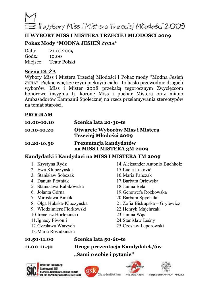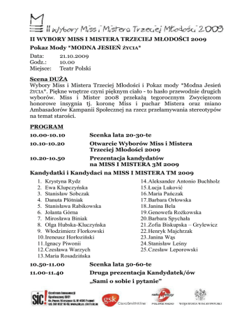 II WYBORY MISS I MISTERA TRZECIEJ MŁODOŚCI 2009 Pokaz Mody *MODNA JESIEŃ ŻYCIA* Data: Godz.: Miejsce: 21.10.2009 10.00 Teatr Polski Scena DUŻA Wybory Miss i Mistera Trzeciej Młodości i Pokaz mody *Modna Jesień ŻYCIA*. Piękne wnętrze czyni pięknym ciało - to hasło przewodnie drugich wyborów. Miss i Mister 2008 przekażą tegorocznym Zwycięzcom honorowe insygnia tj. koronę Miss i puchar Mistera oraz miano Ambasadorów Kampanii Społecznej na rzecz przełamywania stereotypów na temat starości. PROGRAM 10.00-10.10 Scenka lata 20-30-te 10.10-10.20 Otwarcie Wyborów Miss i Mistera Trzeciej Młodości 2009 10.20-1o.50 Prezentacja kandydatów na MISS I MISTERA 3M 2009 Kandydatki i Kandydaci na MISS I MISTERA TM 2009 1. Krystyna Rydz 2. Ewa Klupczyńska 3. Stanisław Sobczak 4. Danuta Płótniak 5. Stanisława Rabikowska 6. Jolanta Górna 7. Mirosława Biniak 8. Olga Hubska-Kluczyńska 9. Włodzimierz Florkowski 10. Ireneusz Horłoziński 11. Ignacy Piwonii 12. Czesława Warzych 13. Maria Rosadzińska 14. Aleksander Antonio Buchholz 15. Łucja Luković 16. Maria Pańczak 17. Barbara Orłowska 18. Janina Bela 19. Genowefa Rożkowska 20. Barbara Spychała 21. Zofia Biskupska – Grylewicz 22. Henryk Majchrzak 23. Janina Wąs 24. Stanisław Leśny 25. Czesław Leporowski 10.50-11.00 Scenka lata 50-60-te 11.00-11.40 Druga prezentacja Kandydatek/ów „Sami o sobie i pytanie” 11.40-11.50 Scenka lata 70-te 11.50-12.40 Trzecia prezentacja Kandydatek/ów „Moja pasja” 12.40-12.50 Scenka lata 90-te 12.50-13.10 Czwarta prezentacja Kandydatek/ów „W strojach wieczorowych” 13.10-13.20 Pokaz mody science fiction PRZERWA I POCZĘSTUNEK - 30 minut 13.50-14.10 Pokaz Mody *MODNA JESIEŃ ŻYCIA* Uczestnicy Pokazu Mody 1. 2. 3. 4. 5. 6. 7. Anna Kosowska Łucja Luković Stanisława Rabikowska Włodzimierz Florkowski Krystyna Rydz Czesława Warzych Janina Bela 14.10-14.30 8. Olga Hubska-Kluczyńska 9. Maria Rosadzińska 10. Ewa Klupczyńska 11. Ireneusz Horłoziński 12. Ignacy Piwonii 13. Aleksander Antonio Buchholz Przyznanie tytułu Miss i Mistera Trzeciej Młodości 2009 Wręczenie dyplomów. Miss i Mister Trzeciej Młodości2009 odjeżdżają limuzyną. Pokaz Mody *MODNA JESIEŃ ŻYCIA* realizowany dzięki uprzejmości firmy H&M Oprawa artystyczna: Kabaret Humoreska Makabreska z Lubonia pod kierownictwem Pani Barbary Przybylskiej Współpraca: Wielkopolska Rada Koordynacyjna Związek Organizacji Pozarządowych WSTĘP WOLNY. SERDECZNIE ZAPRASZAMY!
